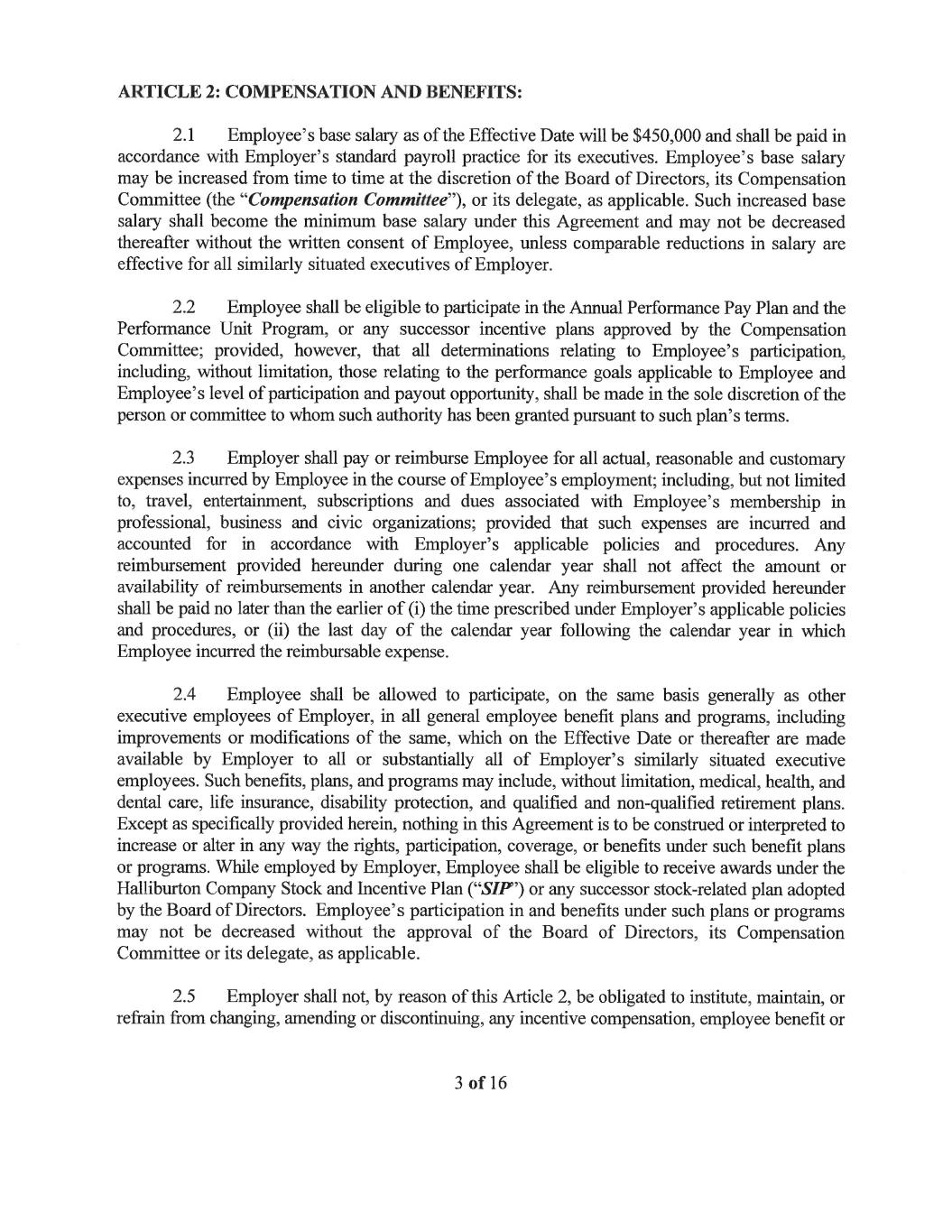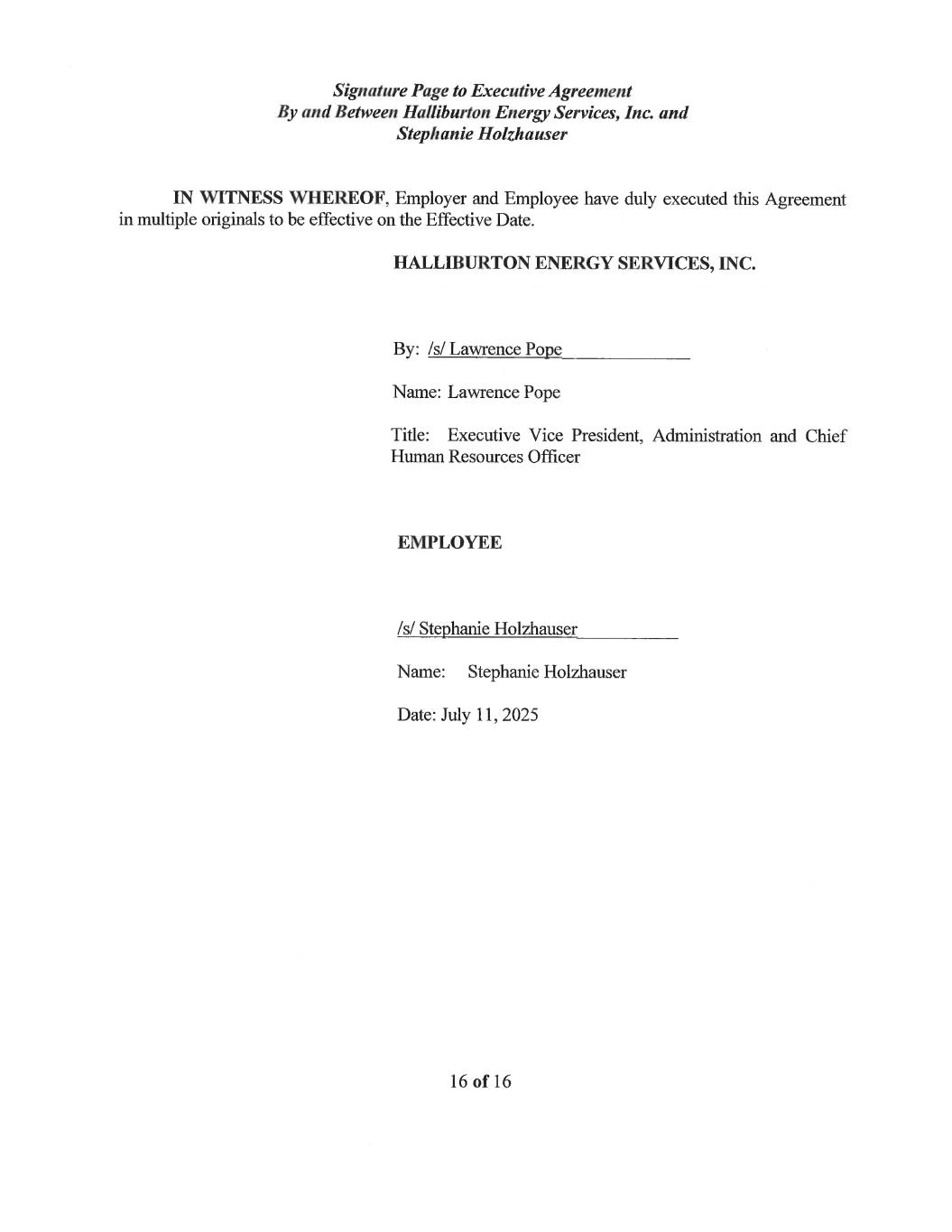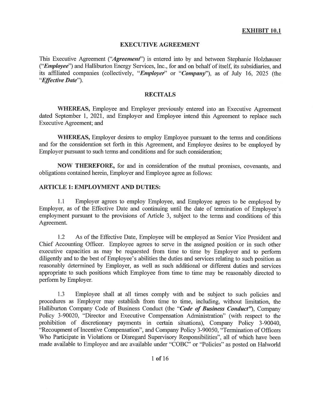 In connection with Ms. Holzhauser’s appointment, Halliburton entered into an Executive Agreement with Ms. Holzhauser effective July 16, 2025 (the “Employment Agreement”). The Employment Agreement provides for a minimum annual base salary of $450,000, participation in the Halliburton Annual Performance Pay Plan, the Halliburton Company Performance Unit Program, and the Halliburton Company Stock and Incentive Plan, and severance payments consistent with other executive officers of Halliburton, as well as other employee benefit plans and programs on the same basis generally as other executive officers of Halliburton. For additional information on these plans and programs, please read “Compensation Discussion and Analysis” in Halliburton’s Definitive Proxy Statement on Schedule 14A for Halliburton’s 2025 Annual Meeting of Shareholders filed with the Securities and Exchange Commission on April 1, 2025.