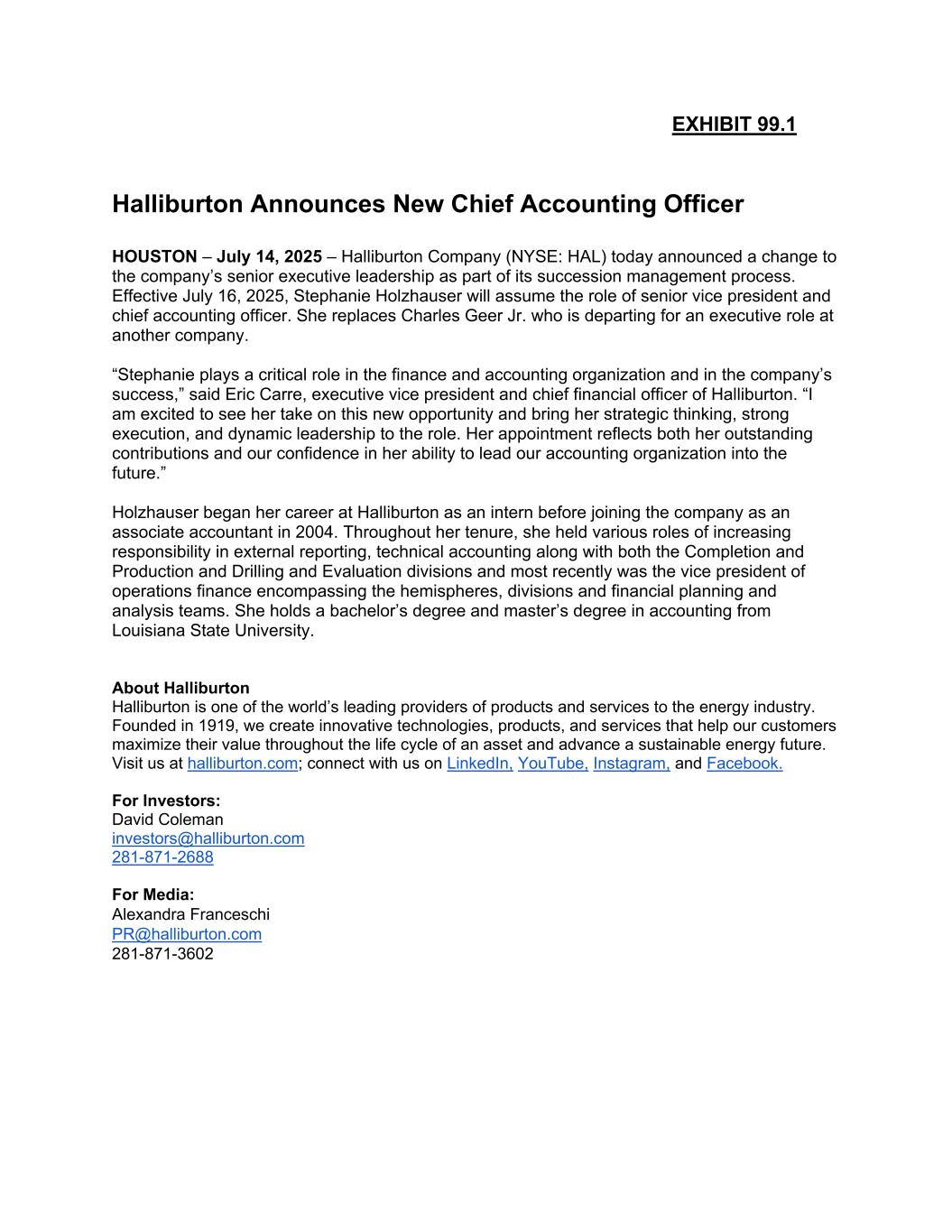 On July 14, 2025, Halliburton issued a press release announcing a new Chief Accounting Officer, a copy of which is furnished as Exhibit 99.1 to this Current Report on Form 8-K and is incorporated by reference herein.