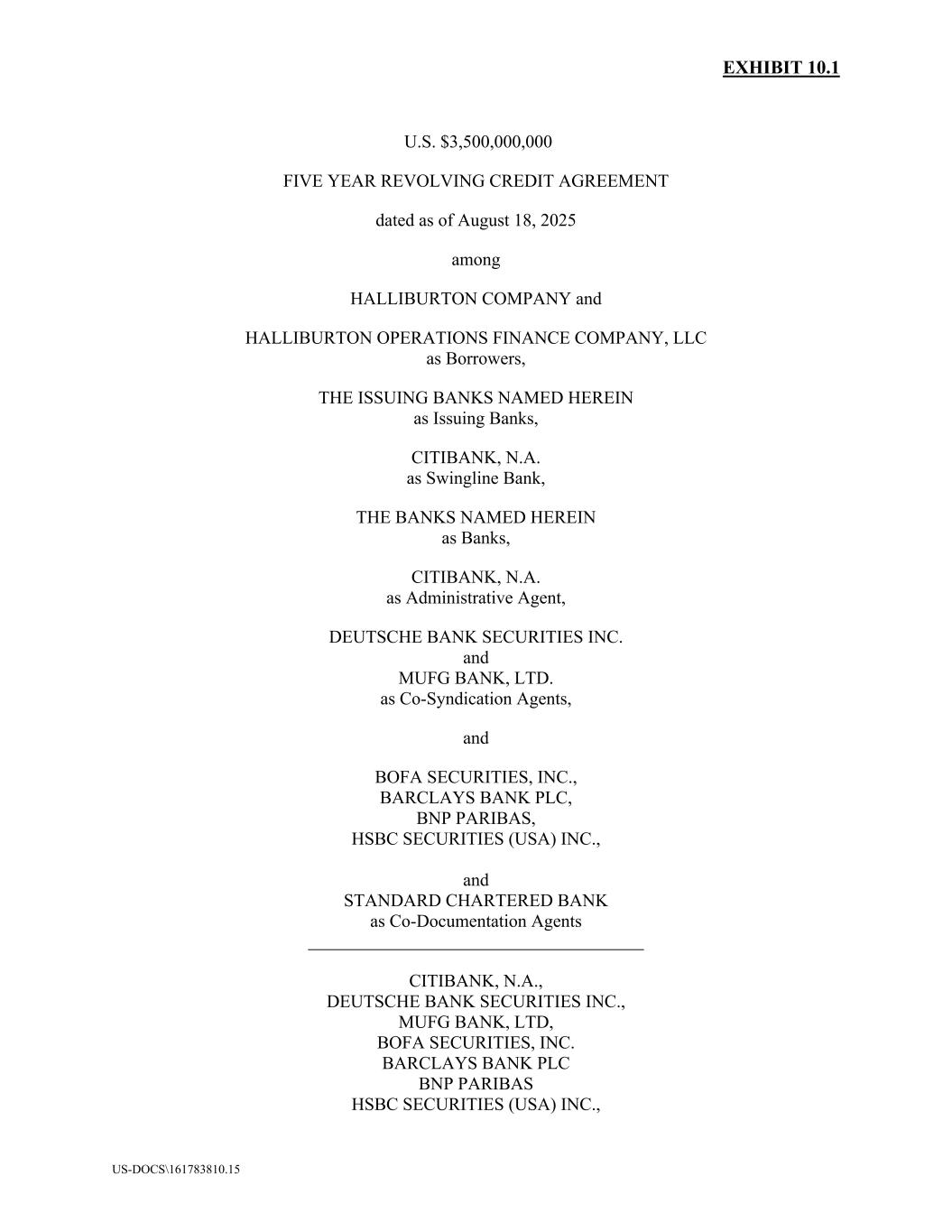 EXHIBIT 10.1 US-DOCS\161783810.15 U.S. $3,500,000,000 FIVE YEAR REVOLVING CREDIT AGREEMENT dated as of August 18, 2025 among HALLIBURTON COMPANY and HALLIBURTON OPERATIONS FINANCE COMPANY, LLC as Borrowers, THE ISSUING BANKS NAMED HEREIN as Issuing Banks, CITIBANK, N.A. as Swingline Bank, THE BANKS NAMED HEREIN as Banks, CITIBANK, N.A. as Administrative Agent, DEUTSCHE BANK SECURITIES INC. and MUFG BANK, LTD. as Co-Syndication Agents, and BOFA SECURITIES, INC., BARCLAYS BANK PLC, BNP PARIBAS, HSBC SECURITIES (USA) INC., and STANDARD CHARTERED BANK as Co-Documentation Agents CITIBANK, N.A., DEUTSCHE BANK SECURITIES INC., MUFG BANK, LTD, BOFA SECURITIES, INC. BARCLAYS BANK PLC BNP PARIBAS HSBC SECURITIES (USA) INC.,