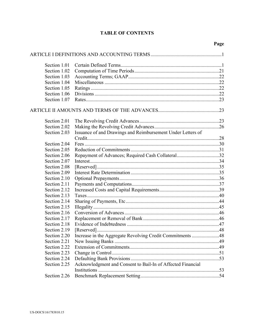 US-DOCS\161783810.15 TABLE OF CONTENTS Page ARTICLE I DEFINITIONS AND ACCOUNTING TERMS.........................................................1 Section 1.01 Certain Defined Terms.................................................................................1 Section 1.02 Computation of Time Periods....................................................................21 Section 1.03 Accounting Terms; GAAP.........................................................................22 Section 1.04 Miscellaneous ............................................................................................22 Section 1.05 Ratings .......................................................................................................22 Section 1.06 Divisions ....................................................................................................22 Section 1.07 Rates...........................................................................................................23 ARTICLE II AMOUNTS AND TERMS OF THE ADVANCES.................................................23 Section 2.01 The Revolving Credit Advances................................................................23 Section 2.02 Making the Revolving Credit Advances....................................................26 Section 2.03 Issuance of and Drawings and Reimbursement Under Letters of Credit..........................................................................................................28 Section 2.04 Fees ............................................................................................................30 Section 2.05 Reduction of Commitments .......................................................................31 Section 2.06 Repayment of Advances; Required Cash Collateral..................................32 Section 2.07 Interest........................................................................................................34 Section 2.08 [Reserved] ..................................................................................................35 Section 2.09 Interest Rate Determination .......................................................................35 Section 2.10 Optional Prepayments................................................................................36 Section 2.11 Payments and Computations......................................................................37 Section 2.12 Increased Costs and Capital Requirements................................................39 Section 2.13 Taxes ..........................................................................................................40 Section 2.14 Sharing of Payments, Etc...........................................................................44 Section 2.15 Illegality .....................................................................................................45 Section 2.16 Conversion of Advances ............................................................................46 Section 2.17 Replacement or Removal of Bank .............................................................46 Section 2.18 Evidence of Indebtedness ..........................................................................47 Section 2.19 [Reserved] ..................................................................................................48 Section 2.20 Increase in the Aggregate Revolving Credit Commitments ......................48 Section 2.21 New Issuing Banks ....................................................................................49 Section 2.22 Extension of Commitments........................................................................49 Section 2.23 Change in Control ......................................................................................51 Section 2.24 Defaulting Bank Provisions .......................................................................53 Section 2.25 Acknowledgment and Consent to Bail-In of Affected Financial Institutions .................................................................................................53 Section 2.26 Benchmark Replacement Setting...............................................................54