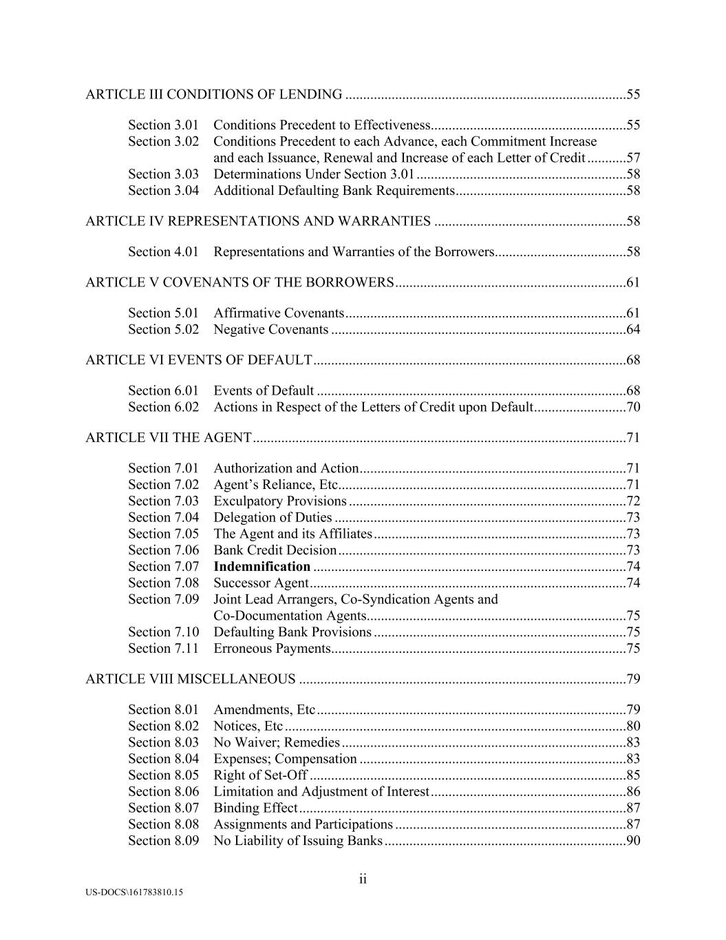 ii US-DOCS\161783810.15 ARTICLE III CONDITIONS OF LENDING ...............................................................................55 Section 3.01 Conditions Precedent to Effectiveness.......................................................55 Section 3.02 Conditions Precedent to each Advance, each Commitment Increase and each Issuance, Renewal and Increase of each Letter of Credit ...........57 Section 3.03 Determinations Under Section 3.01...........................................................58 Section 3.04 Additional Defaulting Bank Requirements................................................58 ARTICLE IV REPRESENTATIONS AND WARRANTIES ......................................................58 Section 4.01 Representations and Warranties of the Borrowers.....................................58 ARTICLE V COVENANTS OF THE BORROWERS.................................................................61 Section 5.01 Affirmative Covenants...............................................................................61 Section 5.02 Negative Covenants ...................................................................................64 ARTICLE VI EVENTS OF DEFAULT........................................................................................68 Section 6.01 Events of Default .......................................................................................68 Section 6.02 Actions in Respect of the Letters of Credit upon Default..........................70 ARTICLE VII THE AGENT.........................................................................................................71 Section 7.01 Authorization and Action...........................................................................71 Section 7.02 Agent’s Reliance, Etc.................................................................................71 Section 7.03 Exculpatory Provisions ..............................................................................72 Section 7.04 Delegation of Duties ..................................................................................73 Section 7.05 The Agent and its Affiliates.......................................................................73 Section 7.06 Bank Credit Decision.................................................................................73 Section 7.07 Indemnification ........................................................................................74 Section 7.08 Successor Agent.........................................................................................74 Section 7.09 Joint Lead Arrangers, Co-Syndication Agents and Co-Documentation Agents.........................................................................75 Section 7.10 Defaulting Bank Provisions .......................................................................75 Section 7.11 Erroneous Payments...................................................................................75 ARTICLE VIII MISCELLANEOUS ............................................................................................79 Section 8.01 Amendments, Etc.......................................................................................79 Section 8.02 Notices, Etc ................................................................................................80 Section 8.03 No Waiver; Remedies ................................................................................83 Section 8.04 Expenses; Compensation ...........................................................................83 Section 8.05 Right of Set-Off .........................................................................................85 Section 8.06 Limitation and Adjustment of Interest.......................................................86 Section 8.07 Binding Effect............................................................................................87 Section 8.08 Assignments and Participations .................................................................87 Section 8.09 No Liability of Issuing Banks ....................................................................90