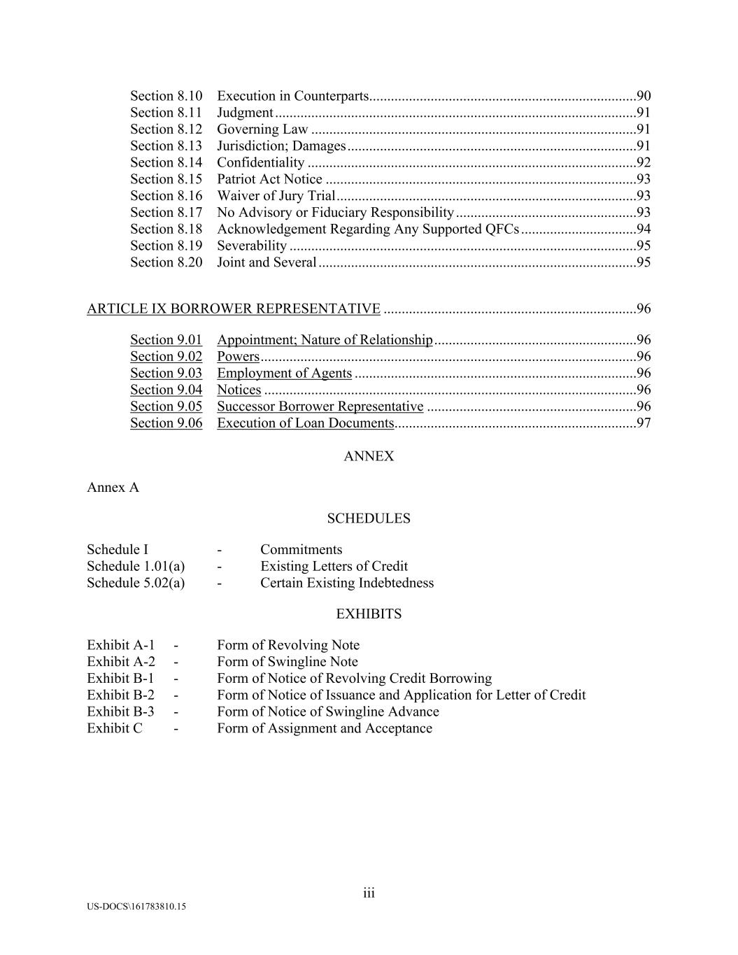 iii US-DOCS\161783810.15 Section 8.10 Execution in Counterparts..........................................................................90 Section 8.11 Judgment ....................................................................................................91 Section 8.12 Governing Law ..........................................................................................91 Section 8.13 Jurisdiction; Damages................................................................................91 Section 8.14 Confidentiality ...........................................................................................92 Section 8.15 Patriot Act Notice ......................................................................................93 Section 8.16 Waiver of Jury Trial...................................................................................93 Section 8.17 No Advisory or Fiduciary Responsibility ..................................................93 Section 8.18 Acknowledgement Regarding Any Supported QFCs ................................94 Section 8.19 Severability ................................................................................................95 Section 8.20 Joint and Several ........................................................................................95 ARTICLE IX BORROWER REPRESENTATIVE ......................................................................96 Section 9.01 Appointment; Nature of Relationship........................................................96 Section 9.02 Powers........................................................................................................96 Section 9.03 Employment of Agents ..............................................................................96 Section 9.04 Notices .......................................................................................................96 Section 9.05 Successor Borrower Representative ..........................................................96 Section 9.06 Execution of Loan Documents...................................................................97 ANNEX Annex A SCHEDULES Schedule I - Commitments Schedule 1.01(a) - Existing Letters of Credit Schedule 5.02(a) - Certain Existing Indebtedness EXHIBITS Exhibit A-1 - Form of Revolving Note Exhibit A-2 - Form of Swingline Note Exhibit B-1 - Form of Notice of Revolving Credit Borrowing Exhibit B-2 - Form of Notice of Issuance and Application for Letter of Credit Exhibit B-3 - Form of Notice of Swingline Advance Exhibit C - Form of Assignment and Acceptance