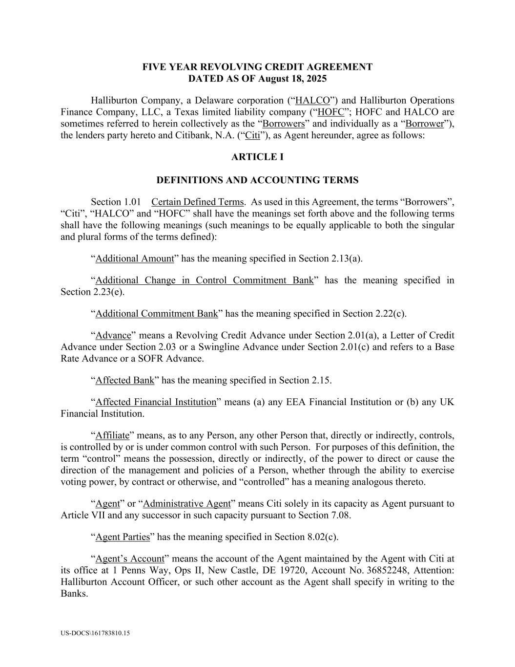 US-DOCS\161783810.15 FIVE YEAR REVOLVING CREDIT AGREEMENT DATED AS OF August 18, 2025 Halliburton Company, a Delaware corporation (“HALCO”) and Halliburton Operations Finance Company, LLC, a Texas limited liability company (“HOFC”; HOFC and HALCO are sometimes referred to herein collectively as the “Borrowers” and individually as a “Borrower”), the lenders party hereto and Citibank, N.A. (“Citi”), as Agent hereunder, agree as follows: ARTICLE I DEFINITIONS AND ACCOUNTING TERMS Section 1.01 Certain Defined Terms. As used in this Agreement, the terms “Borrowers”, “Citi”, “HALCO” and “HOFC” shall have the meanings set forth above and the following terms shall have the following meanings (such meanings to be equally applicable to both the singular and plural forms of the terms defined): “Additional Amount” has the meaning specified in Section 2.13(a). “Additional Change in Control Commitment Bank” has the meaning specified in Section 2.23(e). “Additional Commitment Bank” has the meaning specified in Section 2.22(c). “Advance” means a Revolving Credit Advance under Section 2.01(a), a Letter of Credit Advance under Section 2.03 or a Swingline Advance under Section 2.01(c) and refers to a Base Rate Advance or a SOFR Advance. “Affected Bank” has the meaning specified in Section 2.15. “Affected Financial Institution” means (a) any EEA Financial Institution or (b) any UK Financial Institution. “Affiliate” means, as to any Person, any other Person that, directly or indirectly, controls, is controlled by or is under common control with such Person. For purposes of this definition, the term “control” means the possession, directly or indirectly, of the power to direct or cause the direction of the management and policies of a Person, whether through the ability to exercise voting power, by contract or otherwise, and “controlled” has a meaning analogous thereto. “Agent” or “Administrative Agent” means Citi solely in its capacity as Agent pursuant to Article VII and any successor in such capacity pursuant to Section 7.08. “Agent Parties” has the meaning specified in Section 8.02(c). “Agent’s Account” means the account of the Agent maintained by the Agent with Citi at its office at 1 Penns Way, Ops II, New Castle, DE 19720, Account No. 36852248, Attention: Halliburton Account Officer, or such other account as the Agent shall specify in writing to the Banks.