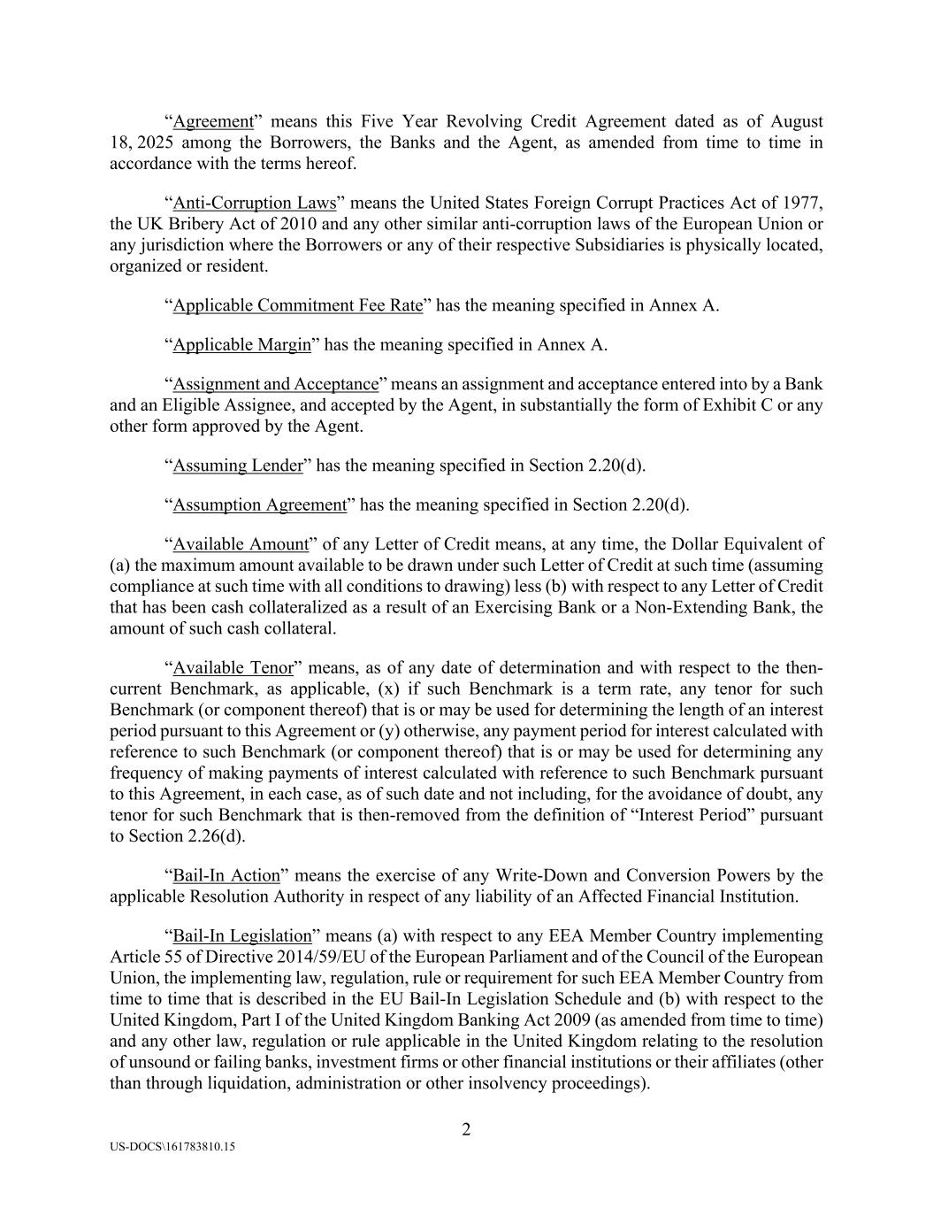 2 US-DOCS\161783810.15 “Agreement” means this Five Year Revolving Credit Agreement dated as of August 18, 2025 among the Borrowers, the Banks and the Agent, as amended from time to time in accordance with the terms hereof. “Anti-Corruption Laws” means the United States Foreign Corrupt Practices Act of 1977, the UK Bribery Act of 2010 and any other similar anti-corruption laws of the European Union or any jurisdiction where the Borrowers or any of their respective Subsidiaries is physically located, organized or resident. “Applicable Commitment Fee Rate” has the meaning specified in Annex A. “Applicable Margin” has the meaning specified in Annex A. “Assignment and Acceptance” means an assignment and acceptance entered into by a Bank and an Eligible Assignee, and accepted by the Agent, in substantially the form of Exhibit C or any other form approved by the Agent. “Assuming Lender” has the meaning specified in Section 2.20(d). “Assumption Agreement” has the meaning specified in Section 2.20(d). “Available Amount” of any Letter of Credit means, at any time, the Dollar Equivalent of (a) the maximum amount available to be drawn under such Letter of Credit at such time (assuming compliance at such time with all conditions to drawing) less (b) with respect to any Letter of Credit that has been cash collateralized as a result of an Exercising Bank or a Non-Extending Bank, the amount of such cash collateral. “Available Tenor” means, as of any date of determination and with respect to the then- current Benchmark, as applicable, (x) if such Benchmark is a term rate, any tenor for such Benchmark (or component thereof) that is or may be used for determining the length of an interest period pursuant to this Agreement or (y) otherwise, any payment period for interest calculated with reference to such Benchmark (or component thereof) that is or may be used for determining any frequency of making payments of interest calculated with reference to such Benchmark pursuant to this Agreement, in each case, as of such date and not including, for the avoidance of doubt, any tenor for such Benchmark that is then-removed from the definition of “Interest Period” pursuant to Section 2.26(d). “Bail-In Action” means the exercise of any Write-Down and Conversion Powers by the applicable Resolution Authority in respect of any liability of an Affected Financial Institution. “Bail-In Legislation” means (a) with respect to any EEA Member Country implementing Article 55 of Directive 2014/59/EU of the European Parliament and of the Council of the European Union, the implementing law, regulation, rule or requirement for such EEA Member Country from time to time that is described in the EU Bail-In Legislation Schedule and (b) with respect to the United Kingdom, Part I of the United Kingdom Banking Act 2009 (as amended from time to time) and any other law, regulation or rule applicable in the United Kingdom relating to the resolution of unsound or failing banks, investment firms or other financial institutions or their affiliates (other than through liquidation, administration or other insolvency proceedings).