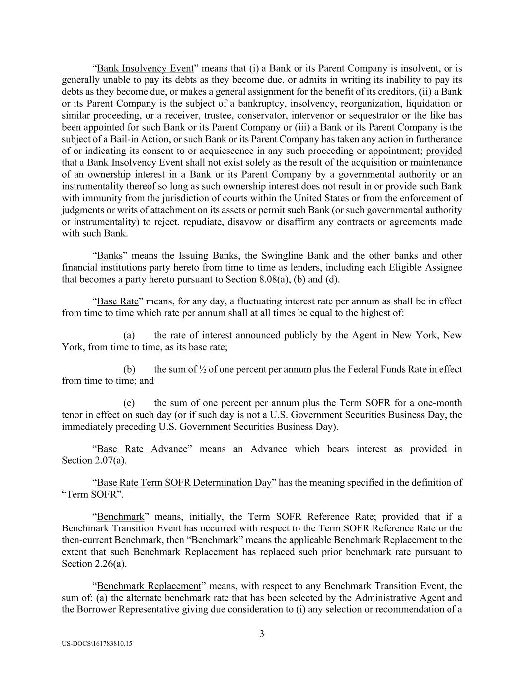 3 US-DOCS\161783810.15 “Bank Insolvency Event” means that (i) a Bank or its Parent Company is insolvent, or is generally unable to pay its debts as they become due, or admits in writing its inability to pay its debts as they become due, or makes a general assignment for the benefit of its creditors, (ii) a Bank or its Parent Company is the subject of a bankruptcy, insolvency, reorganization, liquidation or similar proceeding, or a receiver, trustee, conservator, intervenor or sequestrator or the like has been appointed for such Bank or its Parent Company or (iii) a Bank or its Parent Company is the subject of a Bail-in Action, or such Bank or its Parent Company has taken any action in furtherance of or indicating its consent to or acquiescence in any such proceeding or appointment; provided that a Bank Insolvency Event shall not exist solely as the result of the acquisition or maintenance of an ownership interest in a Bank or its Parent Company by a governmental authority or an instrumentality thereof so long as such ownership interest does not result in or provide such Bank with immunity from the jurisdiction of courts within the United States or from the enforcement of judgments or writs of attachment on its assets or permit such Bank (or such governmental authority or instrumentality) to reject, repudiate, disavow or disaffirm any contracts or agreements made with such Bank. “Banks” means the Issuing Banks, the Swingline Bank and the other banks and other financial institutions party hereto from time to time as lenders, including each Eligible Assignee that becomes a party hereto pursuant to Section 8.08(a), (b) and (d). “Base Rate” means, for any day, a fluctuating interest rate per annum as shall be in effect from time to time which rate per annum shall at all times be equal to the highest of: (a) the rate of interest announced publicly by the Agent in New York, New York, from time to time, as its base rate; (b) the sum of ½ of one percent per annum plus the Federal Funds Rate in effect from time to time; and (c) the sum of one percent per annum plus the Term SOFR for a one-month tenor in effect on such day (or if such day is not a U.S. Government Securities Business Day, the immediately preceding U.S. Government Securities Business Day). “Base Rate Advance” means an Advance which bears interest as provided in Section 2.07(a). “Base Rate Term SOFR Determination Day” has the meaning specified in the definition of “Term SOFR”. “Benchmark” means, initially, the Term SOFR Reference Rate; provided that if a Benchmark Transition Event has occurred with respect to the Term SOFR Reference Rate or the then-current Benchmark, then “Benchmark” means the applicable Benchmark Replacement to the extent that such Benchmark Replacement has replaced such prior benchmark rate pursuant to Section 2.26(a). “Benchmark Replacement” means, with respect to any Benchmark Transition Event, the sum of: (a) the alternate benchmark rate that has been selected by the Administrative Agent and the Borrower Representative giving due consideration to (i) any selection or recommendation of a