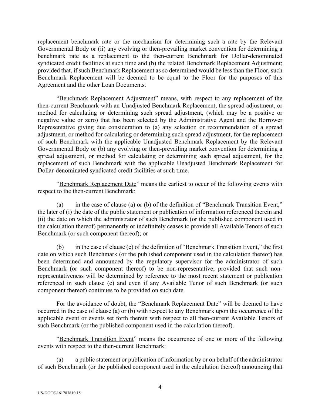 4 US-DOCS\161783810.15 replacement benchmark rate or the mechanism for determining such a rate by the Relevant Governmental Body or (ii) any evolving or then-prevailing market convention for determining a benchmark rate as a replacement to the then-current Benchmark for Dollar-denominated syndicated credit facilities at such time and (b) the related Benchmark Replacement Adjustment; provided that, if such Benchmark Replacement as so determined would be less than the Floor, such Benchmark Replacement will be deemed to be equal to the Floor for the purposes of this Agreement and the other Loan Documents. “Benchmark Replacement Adjustment” means, with respect to any replacement of the then-current Benchmark with an Unadjusted Benchmark Replacement, the spread adjustment, or method for calculating or determining such spread adjustment, (which may be a positive or negative value or zero) that has been selected by the Administrative Agent and the Borrower Representative giving due consideration to (a) any selection or recommendation of a spread adjustment, or method for calculating or determining such spread adjustment, for the replacement of such Benchmark with the applicable Unadjusted Benchmark Replacement by the Relevant Governmental Body or (b) any evolving or then-prevailing market convention for determining a spread adjustment, or method for calculating or determining such spread adjustment, for the replacement of such Benchmark with the applicable Unadjusted Benchmark Replacement for Dollar-denominated syndicated credit facilities at such time. “Benchmark Replacement Date” means the earliest to occur of the following events with respect to the then-current Benchmark: (a) in the case of clause (a) or (b) of the definition of “Benchmark Transition Event,” the later of (i) the date of the public statement or publication of information referenced therein and (ii) the date on which the administrator of such Benchmark (or the published component used in the calculation thereof) permanently or indefinitely ceases to provide all Available Tenors of such Benchmark (or such component thereof); or (b) in the case of clause (c) of the definition of “Benchmark Transition Event,” the first date on which such Benchmark (or the published component used in the calculation thereof) has been determined and announced by the regulatory supervisor for the administrator of such Benchmark (or such component thereof) to be non-representative; provided that such non- representativeness will be determined by reference to the most recent statement or publication referenced in such clause (c) and even if any Available Tenor of such Benchmark (or such component thereof) continues to be provided on such date. For the avoidance of doubt, the “Benchmark Replacement Date” will be deemed to have occurred in the case of clause (a) or (b) with respect to any Benchmark upon the occurrence of the applicable event or events set forth therein with respect to all then-current Available Tenors of such Benchmark (or the published component used in the calculation thereof). “Benchmark Transition Event” means the occurrence of one or more of the following events with respect to the then-current Benchmark: (a) a public statement or publication of information by or on behalf of the administrator of such Benchmark (or the published component used in the calculation thereof) announcing that