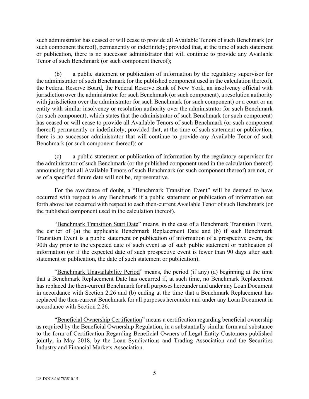5 US-DOCS\161783810.15 such administrator has ceased or will cease to provide all Available Tenors of such Benchmark (or such component thereof), permanently or indefinitely; provided that, at the time of such statement or publication, there is no successor administrator that will continue to provide any Available Tenor of such Benchmark (or such component thereof); (b) a public statement or publication of information by the regulatory supervisor for the administrator of such Benchmark (or the published component used in the calculation thereof), the Federal Reserve Board, the Federal Reserve Bank of New York, an insolvency official with jurisdiction over the administrator for such Benchmark (or such component), a resolution authority with jurisdiction over the administrator for such Benchmark (or such component) or a court or an entity with similar insolvency or resolution authority over the administrator for such Benchmark (or such component), which states that the administrator of such Benchmark (or such component) has ceased or will cease to provide all Available Tenors of such Benchmark (or such component thereof) permanently or indefinitely; provided that, at the time of such statement or publication, there is no successor administrator that will continue to provide any Available Tenor of such Benchmark (or such component thereof); or (c) a public statement or publication of information by the regulatory supervisor for the administrator of such Benchmark (or the published component used in the calculation thereof) announcing that all Available Tenors of such Benchmark (or such component thereof) are not, or as of a specified future date will not be, representative. For the avoidance of doubt, a “Benchmark Transition Event” will be deemed to have occurred with respect to any Benchmark if a public statement or publication of information set forth above has occurred with respect to each then-current Available Tenor of such Benchmark (or the published component used in the calculation thereof). “Benchmark Transition Start Date” means, in the case of a Benchmark Transition Event, the earlier of (a) the applicable Benchmark Replacement Date and (b) if such Benchmark Transition Event is a public statement or publication of information of a prospective event, the 90th day prior to the expected date of such event as of such public statement or publication of information (or if the expected date of such prospective event is fewer than 90 days after such statement or publication, the date of such statement or publication). “Benchmark Unavailability Period” means, the period (if any) (a) beginning at the time that a Benchmark Replacement Date has occurred if, at such time, no Benchmark Replacement has replaced the then-current Benchmark for all purposes hereunder and under any Loan Document in accordance with Section 2.26 and (b) ending at the time that a Benchmark Replacement has replaced the then-current Benchmark for all purposes hereunder and under any Loan Document in accordance with Section 2.26. “Beneficial Ownership Certification” means a certification regarding beneficial ownership as required by the Beneficial Ownership Regulation, in a substantially similar form and substance to the form of Certification Regarding Beneficial Owners of Legal Entity Customers published jointly, in May 2018, by the Loan Syndications and Trading Association and the Securities Industry and Financial Markets Association.