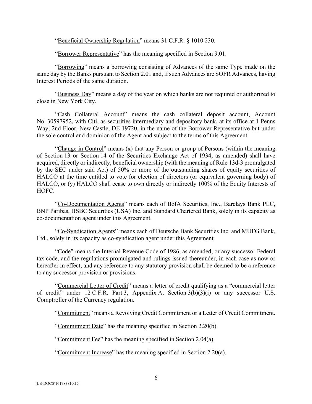 6 US-DOCS\161783810.15 “Beneficial Ownership Regulation” means 31 C.F.R. § 1010.230. “Borrower Representative” has the meaning specified in Section 9.01. “Borrowing” means a borrowing consisting of Advances of the same Type made on the same day by the Banks pursuant to Section 2.01 and, if such Advances are SOFR Advances, having Interest Periods of the same duration. “Business Day” means a day of the year on which banks are not required or authorized to close in New York City. “Cash Collateral Account” means the cash collateral deposit account, Account No. 30597952, with Citi, as securities intermediary and depository bank, at its office at 1 Penns Way, 2nd Floor, New Castle, DE 19720, in the name of the Borrower Representative but under the sole control and dominion of the Agent and subject to the terms of this Agreement. “Change in Control” means (x) that any Person or group of Persons (within the meaning of Section 13 or Section 14 of the Securities Exchange Act of 1934, as amended) shall have acquired, directly or indirectly, beneficial ownership (with the meaning of Rule 13d-3 promulgated by the SEC under said Act) of 50% or more of the outstanding shares of equity securities of HALCO at the time entitled to vote for election of directors (or equivalent governing body) of HALCO, or (y) HALCO shall cease to own directly or indirectly 100% of the Equity Interests of HOFC. “Co-Documentation Agents” means each of BofA Securities, Inc., Barclays Bank PLC, BNP Paribas, HSBC Securities (USA) Inc. and Standard Chartered Bank, solely in its capacity as co-documentation agent under this Agreement. “Co-Syndication Agents” means each of Deutsche Bank Securities Inc. and MUFG Bank, Ltd., solely in its capacity as co-syndication agent under this Agreement. “Code” means the Internal Revenue Code of 1986, as amended, or any successor Federal tax code, and the regulations promulgated and rulings issued thereunder, in each case as now or hereafter in effect, and any reference to any statutory provision shall be deemed to be a reference to any successor provision or provisions. “Commercial Letter of Credit” means a letter of credit qualifying as a “commercial letter of credit” under 12 C.F.R. Part 3, Appendix A, Section 3(b)(3)(i) or any successor U.S. Comptroller of the Currency regulation. “Commitment” means a Revolving Credit Commitment or a Letter of Credit Commitment. “Commitment Date” has the meaning specified in Section 2.20(b). “Commitment Fee” has the meaning specified in Section 2.04(a). “Commitment Increase” has the meaning specified in Section 2.20(a).