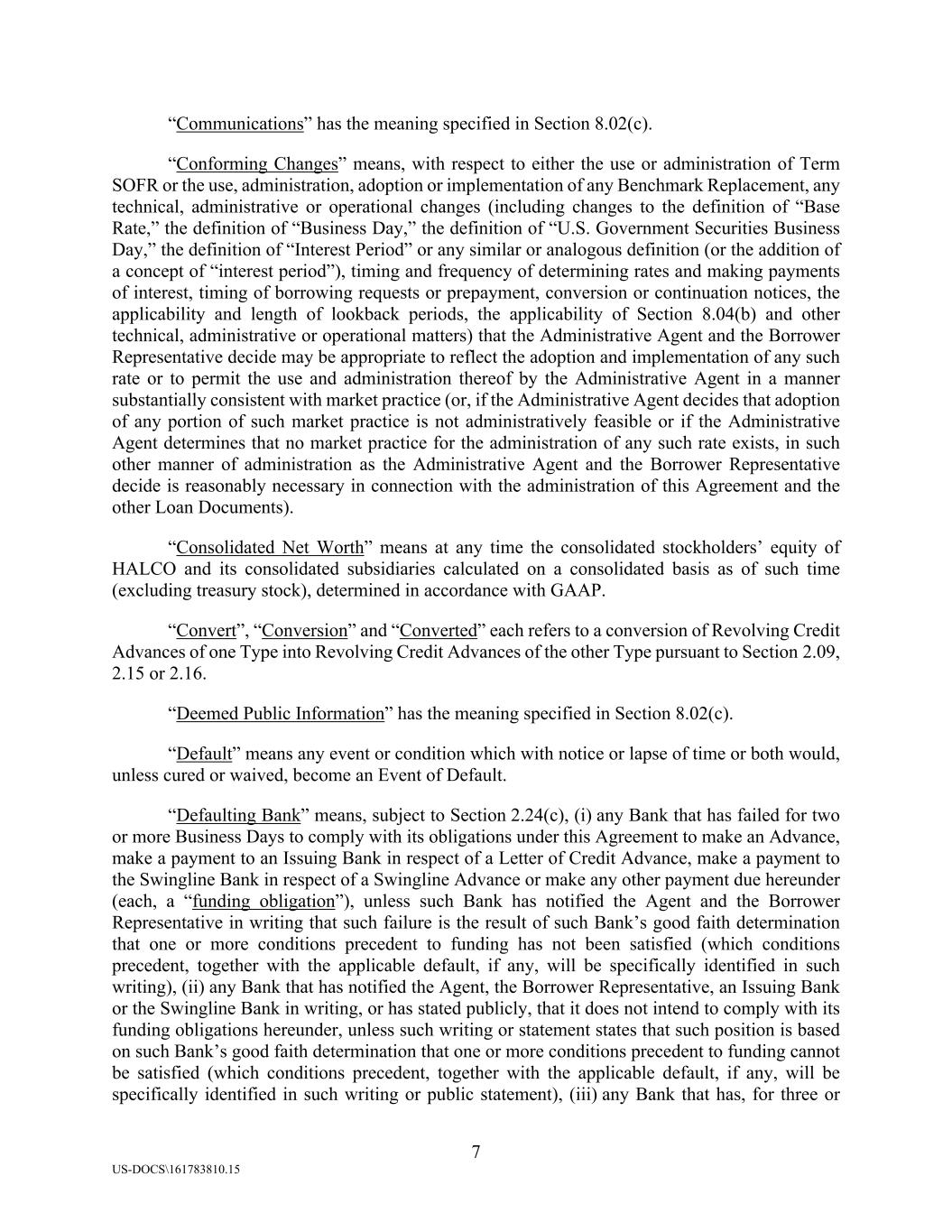 7 US-DOCS\161783810.15 “Communications” has the meaning specified in Section 8.02(c). “Conforming Changes” means, with respect to either the use or administration of Term SOFR or the use, administration, adoption or implementation of any Benchmark Replacement, any technical, administrative or operational changes (including changes to the definition of “Base Rate,” the definition of “Business Day,” the definition of “U.S. Government Securities Business Day,” the definition of “Interest Period” or any similar or analogous definition (or the addition of a concept of “interest period”), timing and frequency of determining rates and making payments of interest, timing of borrowing requests or prepayment, conversion or continuation notices, the applicability and length of lookback periods, the applicability of Section 8.04(b) and other technical, administrative or operational matters) that the Administrative Agent and the Borrower Representative decide may be appropriate to reflect the adoption and implementation of any such rate or to permit the use and administration thereof by the Administrative Agent in a manner substantially consistent with market practice (or, if the Administrative Agent decides that adoption of any portion of such market practice is not administratively feasible or if the Administrative Agent determines that no market practice for the administration of any such rate exists, in such other manner of administration as the Administrative Agent and the Borrower Representative decide is reasonably necessary in connection with the administration of this Agreement and the other Loan Documents). “Consolidated Net Worth” means at any time the consolidated stockholders’ equity of HALCO and its consolidated subsidiaries calculated on a consolidated basis as of such time (excluding treasury stock), determined in accordance with GAAP. “Convert”, “Conversion” and “Converted” each refers to a conversion of Revolving Credit Advances of one Type into Revolving Credit Advances of the other Type pursuant to Section 2.09, 2.15 or 2.16. “Deemed Public Information” has the meaning specified in Section 8.02(c). “Default” means any event or condition which with notice or lapse of time or both would, unless cured or waived, become an Event of Default. “Defaulting Bank” means, subject to Section 2.24(c), (i) any Bank that has failed for two or more Business Days to comply with its obligations under this Agreement to make an Advance, make a payment to an Issuing Bank in respect of a Letter of Credit Advance, make a payment to the Swingline Bank in respect of a Swingline Advance or make any other payment due hereunder (each, a “funding obligation”), unless such Bank has notified the Agent and the Borrower Representative in writing that such failure is the result of such Bank’s good faith determination that one or more conditions precedent to funding has not been satisfied (which conditions precedent, together with the applicable default, if any, will be specifically identified in such writing), (ii) any Bank that has notified the Agent, the Borrower Representative, an Issuing Bank or the Swingline Bank in writing, or has stated publicly, that it does not intend to comply with its funding obligations hereunder, unless such writing or statement states that such position is based on such Bank’s good faith determination that one or more conditions precedent to funding cannot be satisfied (which conditions precedent, together with the applicable default, if any, will be specifically identified in such writing or public statement), (iii) any Bank that has, for three or