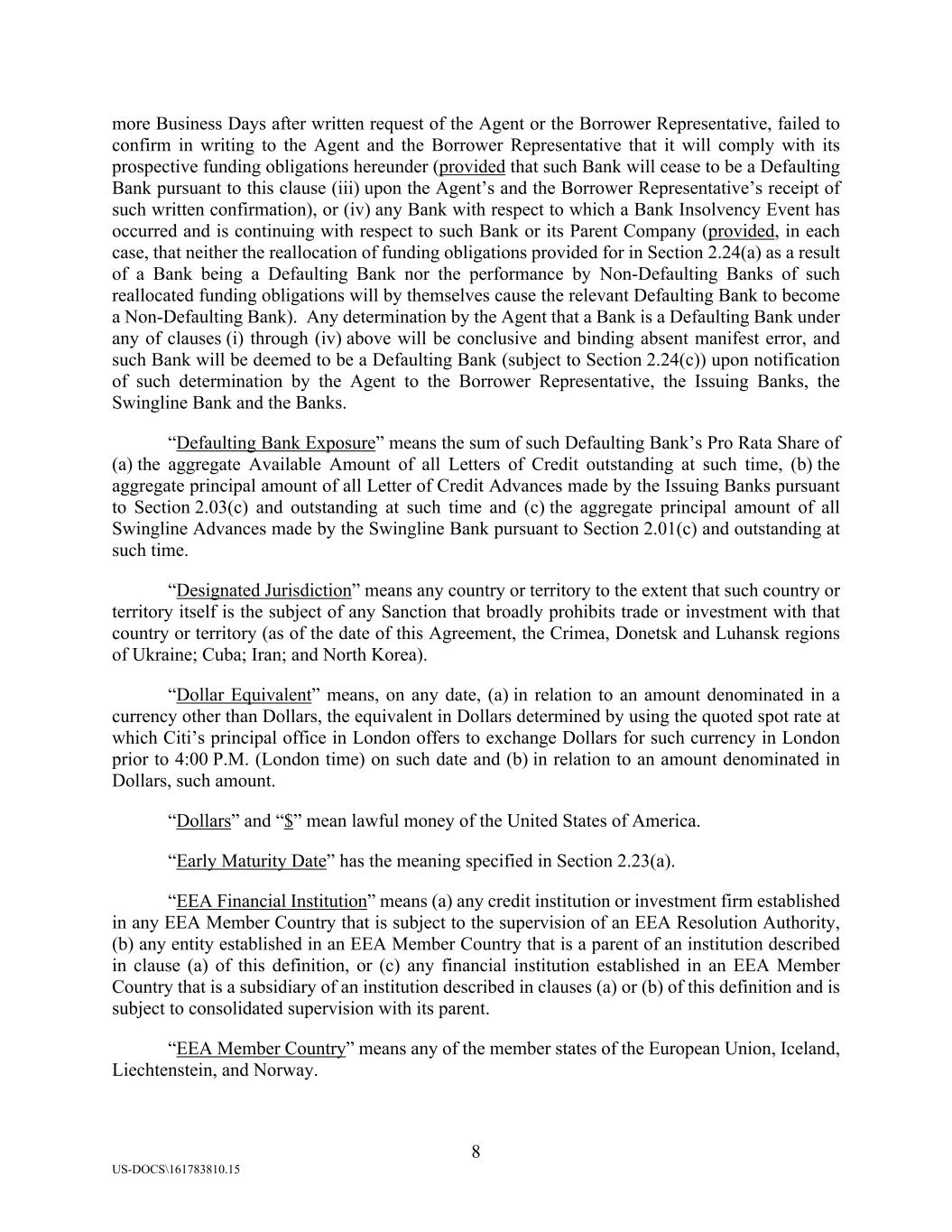 8 US-DOCS\161783810.15 more Business Days after written request of the Agent or the Borrower Representative, failed to confirm in writing to the Agent and the Borrower Representative that it will comply with its prospective funding obligations hereunder (provided that such Bank will cease to be a Defaulting Bank pursuant to this clause (iii) upon the Agent’s and the Borrower Representative’s receipt of such written confirmation), or (iv) any Bank with respect to which a Bank Insolvency Event has occurred and is continuing with respect to such Bank or its Parent Company (provided, in each case, that neither the reallocation of funding obligations provided for in Section 2.24(a) as a result of a Bank being a Defaulting Bank nor the performance by Non-Defaulting Banks of such reallocated funding obligations will by themselves cause the relevant Defaulting Bank to become a Non-Defaulting Bank). Any determination by the Agent that a Bank is a Defaulting Bank under any of clauses (i) through (iv) above will be conclusive and binding absent manifest error, and such Bank will be deemed to be a Defaulting Bank (subject to Section 2.24(c)) upon notification of such determination by the Agent to the Borrower Representative, the Issuing Banks, the Swingline Bank and the Banks. “Defaulting Bank Exposure” means the sum of such Defaulting Bank’s Pro Rata Share of (a) the aggregate Available Amount of all Letters of Credit outstanding at such time, (b) the aggregate principal amount of all Letter of Credit Advances made by the Issuing Banks pursuant to Section 2.03(c) and outstanding at such time and (c) the aggregate principal amount of all Swingline Advances made by the Swingline Bank pursuant to Section 2.01(c) and outstanding at such time. “Designated Jurisdiction” means any country or territory to the extent that such country or territory itself is the subject of any Sanction that broadly prohibits trade or investment with that country or territory (as of the date of this Agreement, the Crimea, Donetsk and Luhansk regions of Ukraine; Cuba; Iran; and North Korea). “Dollar Equivalent” means, on any date, (a) in relation to an amount denominated in a currency other than Dollars, the equivalent in Dollars determined by using the quoted spot rate at which Citi’s principal office in London offers to exchange Dollars for such currency in London prior to 4:00 P.M. (London time) on such date and (b) in relation to an amount denominated in Dollars, such amount. “Dollars” and “$” mean lawful money of the United States of America. “Early Maturity Date” has the meaning specified in Section 2.23(a). “EEA Financial Institution” means (a) any credit institution or investment firm established in any EEA Member Country that is subject to the supervision of an EEA Resolution Authority, (b) any entity established in an EEA Member Country that is a parent of an institution described in clause (a) of this definition, or (c) any financial institution established in an EEA Member Country that is a subsidiary of an institution described in clauses (a) or (b) of this definition and is subject to consolidated supervision with its parent. “EEA Member Country” means any of the member states of the European Union, Iceland, Liechtenstein, and Norway.