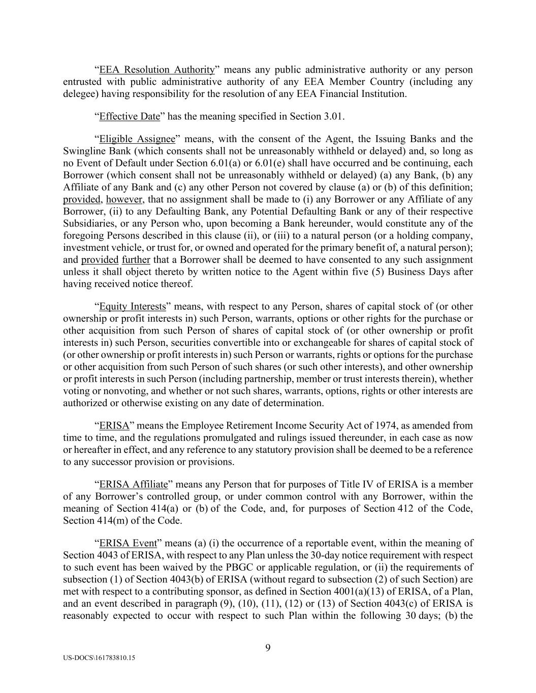 9 US-DOCS\161783810.15 “EEA Resolution Authority” means any public administrative authority or any person entrusted with public administrative authority of any EEA Member Country (including any delegee) having responsibility for the resolution of any EEA Financial Institution. “Effective Date” has the meaning specified in Section 3.01. “Eligible Assignee” means, with the consent of the Agent, the Issuing Banks and the Swingline Bank (which consents shall not be unreasonably withheld or delayed) and, so long as no Event of Default under Section 6.01(a) or 6.01(e) shall have occurred and be continuing, each Borrower (which consent shall not be unreasonably withheld or delayed) (a) any Bank, (b) any Affiliate of any Bank and (c) any other Person not covered by clause (a) or (b) of this definition; provided, however, that no assignment shall be made to (i) any Borrower or any Affiliate of any Borrower, (ii) to any Defaulting Bank, any Potential Defaulting Bank or any of their respective Subsidiaries, or any Person who, upon becoming a Bank hereunder, would constitute any of the foregoing Persons described in this clause (ii), or (iii) to a natural person (or a holding company, investment vehicle, or trust for, or owned and operated for the primary benefit of, a natural person); and provided further that a Borrower shall be deemed to have consented to any such assignment unless it shall object thereto by written notice to the Agent within five (5) Business Days after having received notice thereof. “Equity Interests” means, with respect to any Person, shares of capital stock of (or other ownership or profit interests in) such Person, warrants, options or other rights for the purchase or other acquisition from such Person of shares of capital stock of (or other ownership or profit interests in) such Person, securities convertible into or exchangeable for shares of capital stock of (or other ownership or profit interests in) such Person or warrants, rights or options for the purchase or other acquisition from such Person of such shares (or such other interests), and other ownership or profit interests in such Person (including partnership, member or trust interests therein), whether voting or nonvoting, and whether or not such shares, warrants, options, rights or other interests are authorized or otherwise existing on any date of determination. “ERISA” means the Employee Retirement Income Security Act of 1974, as amended from time to time, and the regulations promulgated and rulings issued thereunder, in each case as now or hereafter in effect, and any reference to any statutory provision shall be deemed to be a reference to any successor provision or provisions. “ERISA Affiliate” means any Person that for purposes of Title IV of ERISA is a member of any Borrower’s controlled group, or under common control with any Borrower, within the meaning of Section 414(a) or (b) of the Code, and, for purposes of Section 412 of the Code, Section 414(m) of the Code. “ERISA Event” means (a) (i) the occurrence of a reportable event, within the meaning of Section 4043 of ERISA, with respect to any Plan unless the 30-day notice requirement with respect to such event has been waived by the PBGC or applicable regulation, or (ii) the requirements of subsection (1) of Section 4043(b) of ERISA (without regard to subsection (2) of such Section) are met with respect to a contributing sponsor, as defined in Section 4001(a)(13) of ERISA, of a Plan, and an event described in paragraph (9), (10), (11), (12) or (13) of Section 4043(c) of ERISA is reasonably expected to occur with respect to such Plan within the following 30 days; (b) the