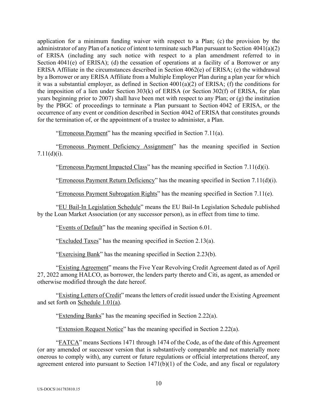 10 US-DOCS\161783810.15 application for a minimum funding waiver with respect to a Plan; (c) the provision by the administrator of any Plan of a notice of intent to terminate such Plan pursuant to Section 4041(a)(2) of ERISA (including any such notice with respect to a plan amendment referred to in Section 4041(e) of ERISA); (d) the cessation of operations at a facility of a Borrower or any ERISA Affiliate in the circumstances described in Section 4062(e) of ERISA; (e) the withdrawal by a Borrower or any ERISA Affiliate from a Multiple Employer Plan during a plan year for which it was a substantial employer, as defined in Section 4001(a)(2) of ERISA; (f) the conditions for the imposition of a lien under Section 303(k) of ERISA (or Section 302(f) of ERISA, for plan years beginning prior to 2007) shall have been met with respect to any Plan; or (g) the institution by the PBGC of proceedings to terminate a Plan pursuant to Section 4042 of ERISA, or the occurrence of any event or condition described in Section 4042 of ERISA that constitutes grounds for the termination of, or the appointment of a trustee to administer, a Plan. “Erroneous Payment” has the meaning specified in Section 7.11(a). “Erroneous Payment Deficiency Assignment” has the meaning specified in Section 7.11(d)(i). “Erroneous Payment Impacted Class” has the meaning specified in Section 7.11(d)(i). “Erroneous Payment Return Deficiency” has the meaning specified in Section 7.11(d)(i). “Erroneous Payment Subrogation Rights” has the meaning specified in Section 7.11(e). “EU Bail-In Legislation Schedule” means the EU Bail-In Legislation Schedule published by the Loan Market Association (or any successor person), as in effect from time to time. “Events of Default” has the meaning specified in Section 6.01. “Excluded Taxes” has the meaning specified in Section 2.13(a). “Exercising Bank” has the meaning specified in Section 2.23(b). “Existing Agreement” means the Five Year Revolving Credit Agreement dated as of April 27, 2022 among HALCO, as borrower, the lenders party thereto and Citi, as agent, as amended or otherwise modified through the date hereof. “Existing Letters of Credit” means the letters of credit issued under the Existing Agreement and set forth on Schedule 1.01(a). “Extending Banks” has the meaning specified in Section 2.22(a). “Extension Request Notice” has the meaning specified in Section 2.22(a). “FATCA” means Sections 1471 through 1474 of the Code, as of the date of this Agreement (or any amended or successor version that is substantively comparable and not materially more onerous to comply with), any current or future regulations or official interpretations thereof, any agreement entered into pursuant to Section 1471(b)(1) of the Code, and any fiscal or regulatory