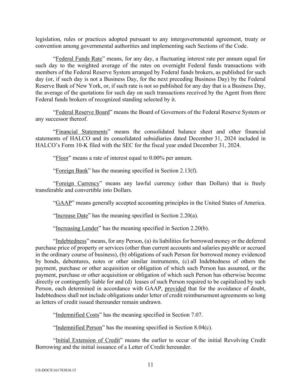 11 US-DOCS\161783810.15 legislation, rules or practices adopted pursuant to any intergovernmental agreement, treaty or convention among governmental authorities and implementing such Sections of the Code. “Federal Funds Rate” means, for any day, a fluctuating interest rate per annum equal for such day to the weighted average of the rates on overnight Federal funds transactions with members of the Federal Reserve System arranged by Federal funds brokers, as published for such day (or, if such day is not a Business Day, for the next preceding Business Day) by the Federal Reserve Bank of New York, or, if such rate is not so published for any day that is a Business Day, the average of the quotations for such day on such transactions received by the Agent from three Federal funds brokers of recognized standing selected by it. “Federal Reserve Board” means the Board of Governors of the Federal Reserve System or any successor thereof. “Financial Statements” means the consolidated balance sheet and other financial statements of HALCO and its consolidated subsidiaries dated December 31, 2024 included in HALCO’s Form 10-K filed with the SEC for the fiscal year ended December 31, 2024. “Floor” means a rate of interest equal to 0.00% per annum. “Foreign Bank” has the meaning specified in Section 2.13(f). “Foreign Currency” means any lawful currency (other than Dollars) that is freely transferable and convertible into Dollars. “GAAP” means generally accepted accounting principles in the United States of America. “Increase Date” has the meaning specified in Section 2.20(a). “Increasing Lender” has the meaning specified in Section 2.20(b). “Indebtedness” means, for any Person, (a) its liabilities for borrowed money or the deferred purchase price of property or services (other than current accounts and salaries payable or accrued in the ordinary course of business), (b) obligations of such Person for borrowed money evidenced by bonds, debentures, notes or other similar instruments, (c) all Indebtedness of others the payment, purchase or other acquisition or obligation of which such Person has assumed, or the payment, purchase or other acquisition or obligation of which such Person has otherwise become directly or contingently liable for and (d) leases of such Person required to be capitalized by such Person, each determined in accordance with GAAP, provided that for the avoidance of doubt, Indebtedness shall not include obligations under letter of credit reimbursement agreements so long as letters of credit issued thereunder remain undrawn. “Indemnified Costs” has the meaning specified in Section 7.07. “Indemnified Person” has the meaning specified in Section 8.04(c). “Initial Extension of Credit” means the earlier to occur of the initial Revolving Credit Borrowing and the initial issuance of a Letter of Credit hereunder.