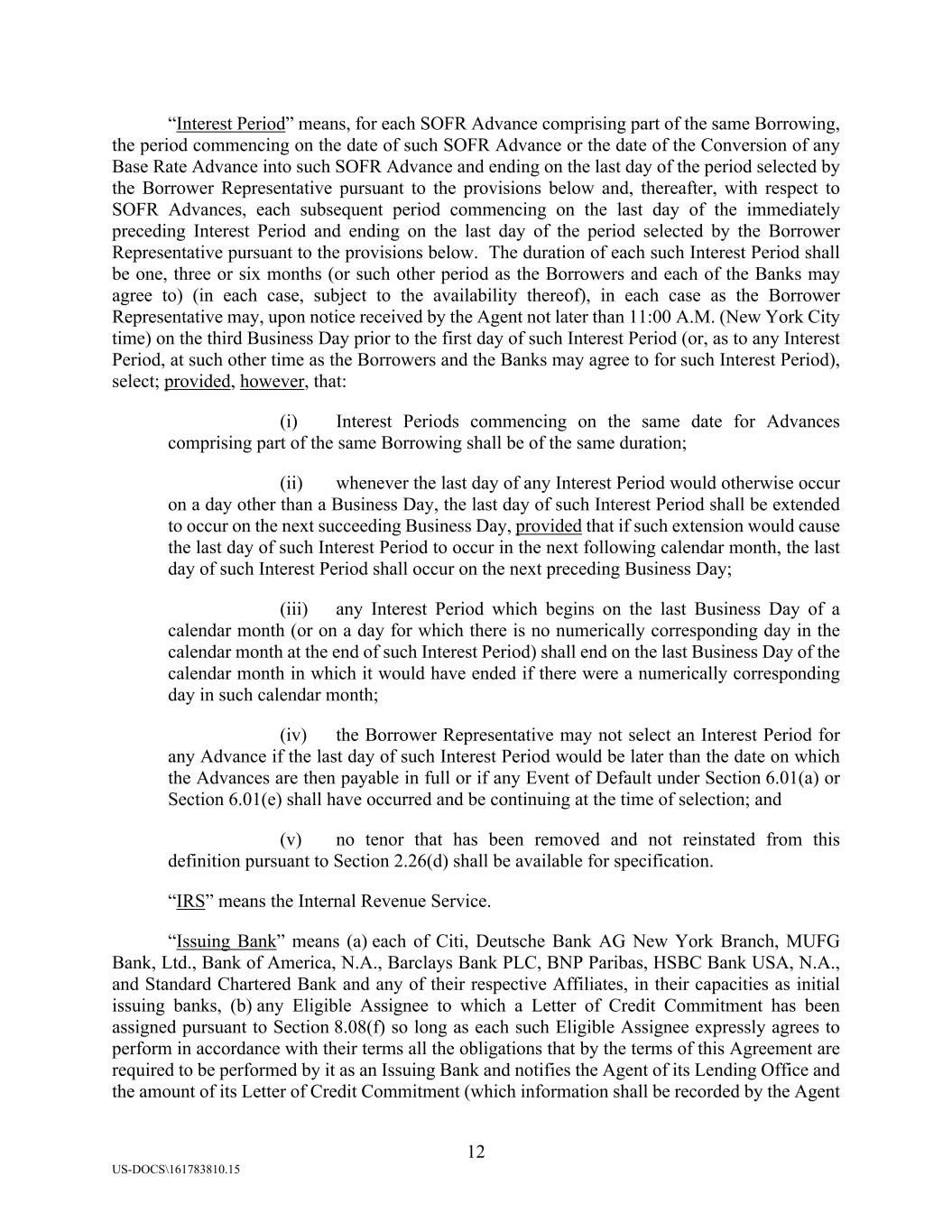 12 US-DOCS\161783810.15 “Interest Period” means, for each SOFR Advance comprising part of the same Borrowing, the period commencing on the date of such SOFR Advance or the date of the Conversion of any Base Rate Advance into such SOFR Advance and ending on the last day of the period selected by the Borrower Representative pursuant to the provisions below and, thereafter, with respect to SOFR Advances, each subsequent period commencing on the last day of the immediately preceding Interest Period and ending on the last day of the period selected by the Borrower Representative pursuant to the provisions below. The duration of each such Interest Period shall be one, three or six months (or such other period as the Borrowers and each of the Banks may agree to) (in each case, subject to the availability thereof), in each case as the Borrower Representative may, upon notice received by the Agent not later than 11:00 A.M. (New York City time) on the third Business Day prior to the first day of such Interest Period (or, as to any Interest Period, at such other time as the Borrowers and the Banks may agree to for such Interest Period), select; provided, however, that: (i) Interest Periods commencing on the same date for Advances comprising part of the same Borrowing shall be of the same duration; (ii) whenever the last day of any Interest Period would otherwise occur on a day other than a Business Day, the last day of such Interest Period shall be extended to occur on the next succeeding Business Day, provided that if such extension would cause the last day of such Interest Period to occur in the next following calendar month, the last day of such Interest Period shall occur on the next preceding Business Day; (iii) any Interest Period which begins on the last Business Day of a calendar month (or on a day for which there is no numerically corresponding day in the calendar month at the end of such Interest Period) shall end on the last Business Day of the calendar month in which it would have ended if there were a numerically corresponding day in such calendar month; (iv) the Borrower Representative may not select an Interest Period for any Advance if the last day of such Interest Period would be later than the date on which the Advances are then payable in full or if any Event of Default under Section 6.01(a) or Section 6.01(e) shall have occurred and be continuing at the time of selection; and (v) no tenor that has been removed and not reinstated from this definition pursuant to Section 2.26(d) shall be available for specification. “IRS” means the Internal Revenue Service. “Issuing Bank” means (a) each of Citi, Deutsche Bank AG New York Branch, MUFG Bank, Ltd., Bank of America, N.A., Barclays Bank PLC, BNP Paribas, HSBC Bank USA, N.A., and Standard Chartered Bank and any of their respective Affiliates, in their capacities as initial issuing banks, (b) any Eligible Assignee to which a Letter of Credit Commitment has been assigned pursuant to Section 8.08(f) so long as each such Eligible Assignee expressly agrees to perform in accordance with their terms all the obligations that by the terms of this Agreement are required to be performed by it as an Issuing Bank and notifies the Agent of its Lending Office and the amount of its Letter of Credit Commitment (which information shall be recorded by the Agent