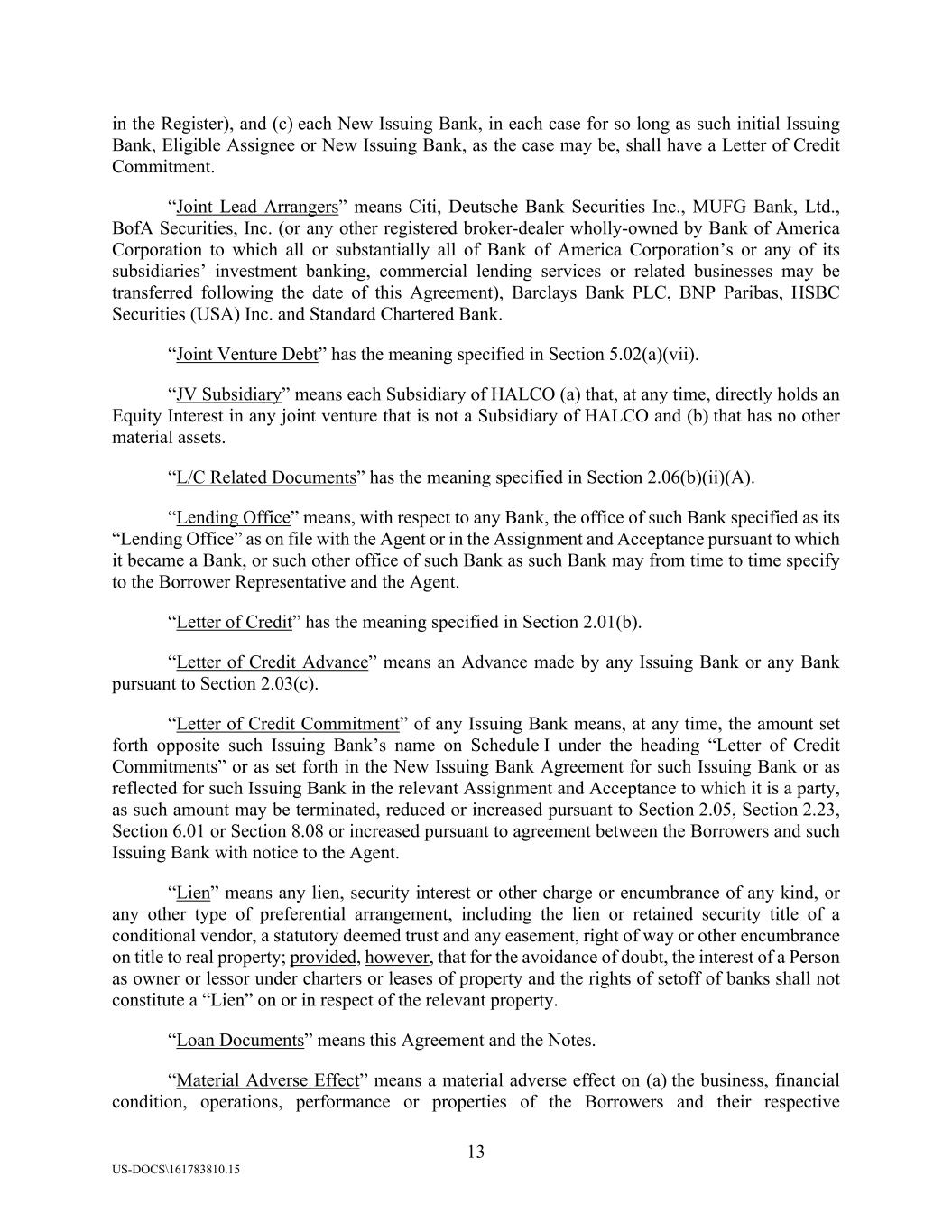 13 US-DOCS\161783810.15 in the Register), and (c) each New Issuing Bank, in each case for so long as such initial Issuing Bank, Eligible Assignee or New Issuing Bank, as the case may be, shall have a Letter of Credit Commitment. “Joint Lead Arrangers” means Citi, Deutsche Bank Securities Inc., MUFG Bank, Ltd., BofA Securities, Inc. (or any other registered broker-dealer wholly-owned by Bank of America Corporation to which all or substantially all of Bank of America Corporation’s or any of its subsidiaries’ investment banking, commercial lending services or related businesses may be transferred following the date of this Agreement), Barclays Bank PLC, BNP Paribas, HSBC Securities (USA) Inc. and Standard Chartered Bank. “Joint Venture Debt” has the meaning specified in Section 5.02(a)(vii). “JV Subsidiary” means each Subsidiary of HALCO (a) that, at any time, directly holds an Equity Interest in any joint venture that is not a Subsidiary of HALCO and (b) that has no other material assets. “L/C Related Documents” has the meaning specified in Section 2.06(b)(ii)(A). “Lending Office” means, with respect to any Bank, the office of such Bank specified as its “Lending Office” as on file with the Agent or in the Assignment and Acceptance pursuant to which it became a Bank, or such other office of such Bank as such Bank may from time to time specify to the Borrower Representative and the Agent. “Letter of Credit” has the meaning specified in Section 2.01(b). “Letter of Credit Advance” means an Advance made by any Issuing Bank or any Bank pursuant to Section 2.03(c). “Letter of Credit Commitment” of any Issuing Bank means, at any time, the amount set forth opposite such Issuing Bank’s name on Schedule I under the heading “Letter of Credit Commitments” or as set forth in the New Issuing Bank Agreement for such Issuing Bank or as reflected for such Issuing Bank in the relevant Assignment and Acceptance to which it is a party, as such amount may be terminated, reduced or increased pursuant to Section 2.05, Section 2.23, Section 6.01 or Section 8.08 or increased pursuant to agreement between the Borrowers and such Issuing Bank with notice to the Agent. “Lien” means any lien, security interest or other charge or encumbrance of any kind, or any other type of preferential arrangement, including the lien or retained security title of a conditional vendor, a statutory deemed trust and any easement, right of way or other encumbrance on title to real property; provided, however, that for the avoidance of doubt, the interest of a Person as owner or lessor under charters or leases of property and the rights of setoff of banks shall not constitute a “Lien” on or in respect of the relevant property. “Loan Documents” means this Agreement and the Notes. “Material Adverse Effect” means a material adverse effect on (a) the business, financial condition, operations, performance or properties of the Borrowers and their respective