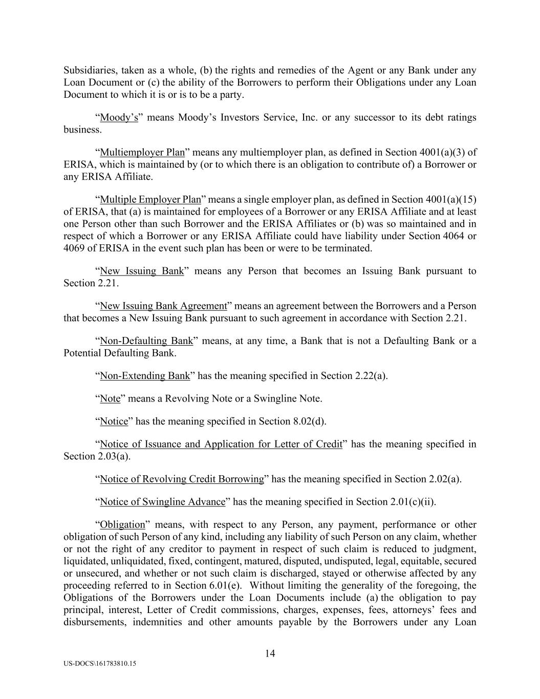 14 US-DOCS\161783810.15 Subsidiaries, taken as a whole, (b) the rights and remedies of the Agent or any Bank under any Loan Document or (c) the ability of the Borrowers to perform their Obligations under any Loan Document to which it is or is to be a party. “Moody’s” means Moody’s Investors Service, Inc. or any successor to its debt ratings business. “Multiemployer Plan” means any multiemployer plan, as defined in Section 4001(a)(3) of ERISA, which is maintained by (or to which there is an obligation to contribute of) a Borrower or any ERISA Affiliate. “Multiple Employer Plan” means a single employer plan, as defined in Section 4001(a)(15) of ERISA, that (a) is maintained for employees of a Borrower or any ERISA Affiliate and at least one Person other than such Borrower and the ERISA Affiliates or (b) was so maintained and in respect of which a Borrower or any ERISA Affiliate could have liability under Section 4064 or 4069 of ERISA in the event such plan has been or were to be terminated. “New Issuing Bank” means any Person that becomes an Issuing Bank pursuant to Section 2.21. “New Issuing Bank Agreement” means an agreement between the Borrowers and a Person that becomes a New Issuing Bank pursuant to such agreement in accordance with Section 2.21. “Non-Defaulting Bank” means, at any time, a Bank that is not a Defaulting Bank or a Potential Defaulting Bank. “Non-Extending Bank” has the meaning specified in Section 2.22(a). “Note” means a Revolving Note or a Swingline Note. “Notice” has the meaning specified in Section 8.02(d). “Notice of Issuance and Application for Letter of Credit” has the meaning specified in Section 2.03(a). “Notice of Revolving Credit Borrowing” has the meaning specified in Section 2.02(a). “Notice of Swingline Advance” has the meaning specified in Section 2.01(c)(ii). “Obligation” means, with respect to any Person, any payment, performance or other obligation of such Person of any kind, including any liability of such Person on any claim, whether or not the right of any creditor to payment in respect of such claim is reduced to judgment, liquidated, unliquidated, fixed, contingent, matured, disputed, undisputed, legal, equitable, secured or unsecured, and whether or not such claim is discharged, stayed or otherwise affected by any proceeding referred to in Section 6.01(e). Without limiting the generality of the foregoing, the Obligations of the Borrowers under the Loan Documents include (a) the obligation to pay principal, interest, Letter of Credit commissions, charges, expenses, fees, attorneys’ fees and disbursements, indemnities and other amounts payable by the Borrowers under any Loan