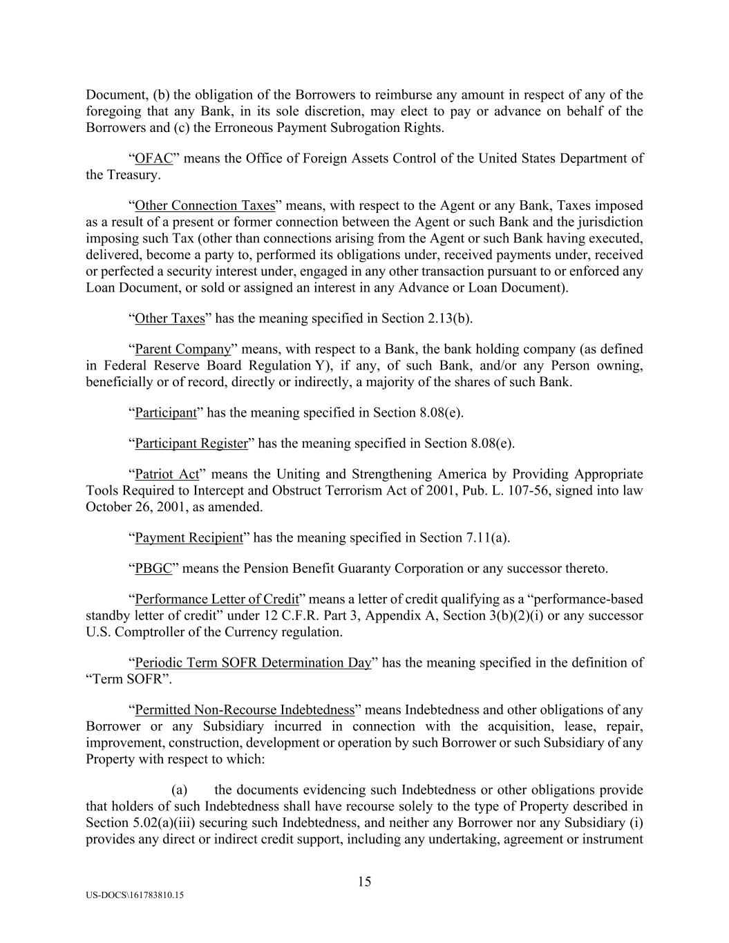 15 US-DOCS\161783810.15 Document, (b) the obligation of the Borrowers to reimburse any amount in respect of any of the foregoing that any Bank, in its sole discretion, may elect to pay or advance on behalf of the Borrowers and (c) the Erroneous Payment Subrogation Rights. “OFAC” means the Office of Foreign Assets Control of the United States Department of the Treasury. “Other Connection Taxes” means, with respect to the Agent or any Bank, Taxes imposed as a result of a present or former connection between the Agent or such Bank and the jurisdiction imposing such Tax (other than connections arising from the Agent or such Bank having executed, delivered, become a party to, performed its obligations under, received payments under, received or perfected a security interest under, engaged in any other transaction pursuant to or enforced any Loan Document, or sold or assigned an interest in any Advance or Loan Document). “Other Taxes” has the meaning specified in Section 2.13(b). “Parent Company” means, with respect to a Bank, the bank holding company (as defined in Federal Reserve Board Regulation Y), if any, of such Bank, and/or any Person owning, beneficially or of record, directly or indirectly, a majority of the shares of such Bank. “Participant” has the meaning specified in Section 8.08(e). “Participant Register” has the meaning specified in Section 8.08(e). “Patriot Act” means the Uniting and Strengthening America by Providing Appropriate Tools Required to Intercept and Obstruct Terrorism Act of 2001, Pub. L. 107-56, signed into law October 26, 2001, as amended. “Payment Recipient” has the meaning specified in Section 7.11(a). “PBGC” means the Pension Benefit Guaranty Corporation or any successor thereto. “Performance Letter of Credit” means a letter of credit qualifying as a “performance-based standby letter of credit” under 12 C.F.R. Part 3, Appendix A, Section 3(b)(2)(i) or any successor U.S. Comptroller of the Currency regulation. “Periodic Term SOFR Determination Day” has the meaning specified in the definition of “Term SOFR”. “Permitted Non-Recourse Indebtedness” means Indebtedness and other obligations of any Borrower or any Subsidiary incurred in connection with the acquisition, lease, repair, improvement, construction, development or operation by such Borrower or such Subsidiary of any Property with respect to which: (a) the documents evidencing such Indebtedness or other obligations provide that holders of such Indebtedness shall have recourse solely to the type of Property described in Section 5.02(a)(iii) securing such Indebtedness, and neither any Borrower nor any Subsidiary (i) provides any direct or indirect credit support, including any undertaking, agreement or instrument