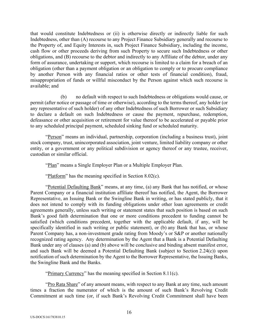 16 US-DOCS\161783810.15 that would constitute Indebtedness or (ii) is otherwise directly or indirectly liable for such Indebtedness, other than (A) recourse to any Project Finance Subsidiary generally and recourse to the Property of, and Equity Interests in, such Project Finance Subsidiary, including the income, cash flow or other proceeds deriving from such Property to secure such Indebtedness or other obligations, and (B) recourse to the debtor and indirectly to any Affiliate of the debtor, under any form of assurance, undertaking or support, which recourse is limited to a claim for a breach of an obligation (other than a payment obligation or an obligation to comply or to procure compliance by another Person with any financial ratios or other tests of financial condition), fraud, misappropriation of funds or willful misconduct by the Person against which such recourse is available; and (b) no default with respect to such Indebtedness or obligations would cause, or permit (after notice or passage of time or otherwise), according to the terms thereof, any holder (or any representative of such holder) of any other Indebtedness of such Borrower or such Subsidiary to declare a default on such Indebtedness or cause the payment, repurchase, redemption, defeasance or other acquisition or retirement for value thereof to be accelerated or payable prior to any scheduled principal payment, scheduled sinking fund or scheduled maturity. “Person” means an individual, partnership, corporation (including a business trust), joint stock company, trust, unincorporated association, joint venture, limited liability company or other entity, or a government or any political subdivision or agency thereof or any trustee, receiver, custodian or similar official. “Plan” means a Single Employer Plan or a Multiple Employer Plan. “Platform” has the meaning specified in Section 8.02(c). “Potential Defaulting Bank” means, at any time, (a) any Bank that has notified, or whose Parent Company or a financial institution affiliate thereof has notified, the Agent, the Borrower Representative, an Issuing Bank or the Swingline Bank in writing, or has stated publicly, that it does not intend to comply with its funding obligations under other loan agreements or credit agreements generally, unless such writing or statement states that such position is based on such Bank’s good faith determination that one or more conditions precedent to funding cannot be satisfied (which conditions precedent, together with the applicable default, if any, will be specifically identified in such writing or public statement), or (b) any Bank that has, or whose Parent Company has, a non-investment grade rating from Moody’s or S&P or another nationally recognized rating agency. Any determination by the Agent that a Bank is a Potential Defaulting Bank under any of clauses (a) and (b) above will be conclusive and binding absent manifest error, and such Bank will be deemed a Potential Defaulting Bank (subject to Section 2.24(c)) upon notification of such determination by the Agent to the Borrower Representative, the Issuing Banks, the Swingline Bank and the Banks. “Primary Currency” has the meaning specified in Section 8.11(c). “Pro Rata Share” of any amount means, with respect to any Bank at any time, such amount times a fraction the numerator of which is the amount of such Bank’s Revolving Credit Commitment at such time (or, if such Bank’s Revolving Credit Commitment shall have been