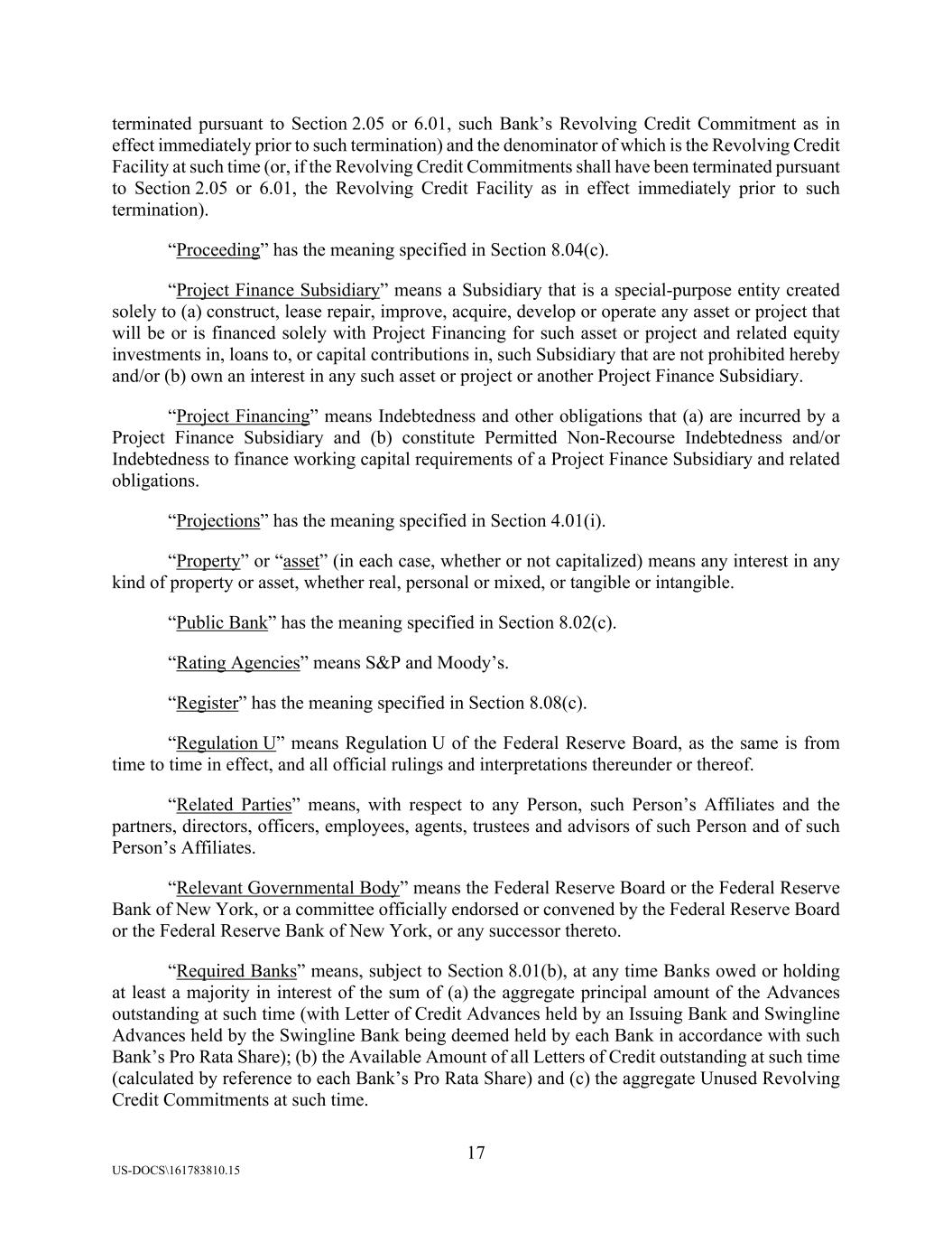 17 US-DOCS\161783810.15 terminated pursuant to Section 2.05 or 6.01, such Bank’s Revolving Credit Commitment as in effect immediately prior to such termination) and the denominator of which is the Revolving Credit Facility at such time (or, if the Revolving Credit Commitments shall have been terminated pursuant to Section 2.05 or 6.01, the Revolving Credit Facility as in effect immediately prior to such termination). “Proceeding” has the meaning specified in Section 8.04(c). “Project Finance Subsidiary” means a Subsidiary that is a special-purpose entity created solely to (a) construct, lease repair, improve, acquire, develop or operate any asset or project that will be or is financed solely with Project Financing for such asset or project and related equity investments in, loans to, or capital contributions in, such Subsidiary that are not prohibited hereby and/or (b) own an interest in any such asset or project or another Project Finance Subsidiary. “Project Financing” means Indebtedness and other obligations that (a) are incurred by a Project Finance Subsidiary and (b) constitute Permitted Non-Recourse Indebtedness and/or Indebtedness to finance working capital requirements of a Project Finance Subsidiary and related obligations. “Projections” has the meaning specified in Section 4.01(i). “Property” or “asset” (in each case, whether or not capitalized) means any interest in any kind of property or asset, whether real, personal or mixed, or tangible or intangible. “Public Bank” has the meaning specified in Section 8.02(c). “Rating Agencies” means S&P and Moody’s. “Register” has the meaning specified in Section 8.08(c). “Regulation U” means Regulation U of the Federal Reserve Board, as the same is from time to time in effect, and all official rulings and interpretations thereunder or thereof. “Related Parties” means, with respect to any Person, such Person’s Affiliates and the partners, directors, officers, employees, agents, trustees and advisors of such Person and of such Person’s Affiliates. “Relevant Governmental Body” means the Federal Reserve Board or the Federal Reserve Bank of New York, or a committee officially endorsed or convened by the Federal Reserve Board or the Federal Reserve Bank of New York, or any successor thereto. “Required Banks” means, subject to Section 8.01(b), at any time Banks owed or holding at least a majority in interest of the sum of (a) the aggregate principal amount of the Advances outstanding at such time (with Letter of Credit Advances held by an Issuing Bank and Swingline Advances held by the Swingline Bank being deemed held by each Bank in accordance with such Bank’s Pro Rata Share); (b) the Available Amount of all Letters of Credit outstanding at such time (calculated by reference to each Bank’s Pro Rata Share) and (c) the aggregate Unused Revolving Credit Commitments at such time.