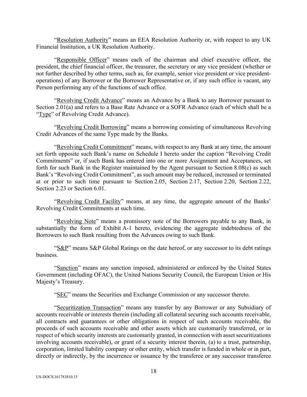 18 US-DOCS\161783810.15 “Resolution Authority” means an EEA Resolution Authority or, with respect to any UK Financial Institution, a UK Resolution Authority. “Responsible Officer” means each of the chairman and chief executive officer, the president, the chief financial officer, the treasurer, the secretary or any vice president (whether or not further described by other terms, such as, for example, senior vice president or vice president- operations) of any Borrower or the Borrower Representative or, if any such office is vacant, any Person performing any of the functions of such office. “Revolving Credit Advance” means an Advance by a Bank to any Borrower pursuant to Section 2.01(a) and refers to a Base Rate Advance or a SOFR Advance (each of which shall be a “Type” of Revolving Credit Advance). “Revolving Credit Borrowing” means a borrowing consisting of simultaneous Revolving Credit Advances of the same Type made by the Banks. “Revolving Credit Commitment” means, with respect to any Bank at any time, the amount set forth opposite such Bank’s name on Schedule I hereto under the caption “Revolving Credit Commitments” or, if such Bank has entered into one or more Assignment and Acceptances, set forth for such Bank in the Register maintained by the Agent pursuant to Section 8.08(c) as such Bank’s “Revolving Credit Commitment”, as such amount may be reduced, increased or terminated at or prior to such time pursuant to Section 2.05, Section 2.17, Section 2.20, Section 2.22, Section 2.23 or Section 6.01. “Revolving Credit Facility” means, at any time, the aggregate amount of the Banks’ Revolving Credit Commitments at such time. “Revolving Note” means a promissory note of the Borrowers payable to any Bank, in substantially the form of Exhibit A-1 hereto, evidencing the aggregate indebtedness of the Borrowers to such Bank resulting from the Advances owing to such Bank. “S&P” means S&P Global Ratings on the date hereof, or any successor to its debt ratings business. “Sanction” means any sanction imposed, administered or enforced by the United States Government (including OFAC), the United Nations Security Council, the European Union or His Majesty’s Treasury. “SEC” means the Securities and Exchange Commission or any successor thereto. “Securitization Transaction” means any transfer by any Borrower or any Subsidiary of accounts receivable or interests therein (including all collateral securing such accounts receivable, all contracts and guarantees or other obligations in respect of such accounts receivable, the proceeds of such accounts receivable and other assets which are customarily transferred, or in respect of which security interests are customarily granted, in connection with asset securitizations involving accounts receivable), or grant of a security interest therein, (a) to a trust, partnership, corporation, limited liability company or other entity, which transfer is funded in whole or in part, directly or indirectly, by the incurrence or issuance by the transferee or any successor transferee