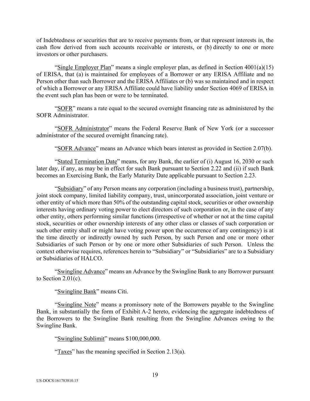 19 US-DOCS\161783810.15 of Indebtedness or securities that are to receive payments from, or that represent interests in, the cash flow derived from such accounts receivable or interests, or (b) directly to one or more investors or other purchasers. “Single Employer Plan” means a single employer plan, as defined in Section 4001(a)(15) of ERISA, that (a) is maintained for employees of a Borrower or any ERISA Affiliate and no Person other than such Borrower and the ERISA Affiliates or (b) was so maintained and in respect of which a Borrower or any ERISA Affiliate could have liability under Section 4069 of ERISA in the event such plan has been or were to be terminated. “SOFR” means a rate equal to the secured overnight financing rate as administered by the SOFR Administrator. “SOFR Administrator” means the Federal Reserve Bank of New York (or a successor administrator of the secured overnight financing rate). “SOFR Advance” means an Advance which bears interest as provided in Section 2.07(b). “Stated Termination Date” means, for any Bank, the earlier of (i) August 16, 2030 or such later day, if any, as may be in effect for such Bank pursuant to Section 2.22 and (ii) if such Bank becomes an Exercising Bank, the Early Maturity Date applicable pursuant to Section 2.23. “Subsidiary” of any Person means any corporation (including a business trust), partnership, joint stock company, limited liability company, trust, unincorporated association, joint venture or other entity of which more than 50% of the outstanding capital stock, securities or other ownership interests having ordinary voting power to elect directors of such corporation or, in the case of any other entity, others performing similar functions (irrespective of whether or not at the time capital stock, securities or other ownership interests of any other class or classes of such corporation or such other entity shall or might have voting power upon the occurrence of any contingency) is at the time directly or indirectly owned by such Person, by such Person and one or more other Subsidiaries of such Person or by one or more other Subsidiaries of such Person. Unless the context otherwise requires, references herein to “Subsidiary” or “Subsidiaries” are to a Subsidiary or Subsidiaries of HALCO. “Swingline Advance” means an Advance by the Swingline Bank to any Borrower pursuant to Section 2.01(c). “Swingline Bank” means Citi. “Swingline Note” means a promissory note of the Borrowers payable to the Swingline Bank, in substantially the form of Exhibit A-2 hereto, evidencing the aggregate indebtedness of the Borrowers to the Swingline Bank resulting from the Swingline Advances owing to the Swingline Bank. “Swingline Sublimit” means $100,000,000. “Taxes” has the meaning specified in Section 2.13(a).