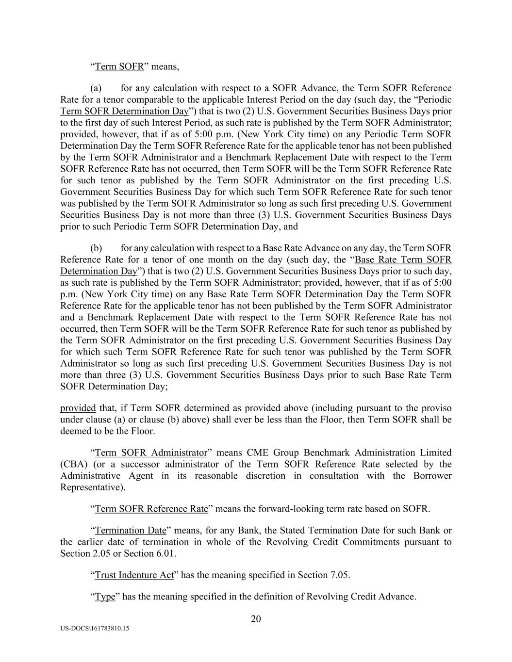 20 US-DOCS\161783810.15 “Term SOFR” means, (a) for any calculation with respect to a SOFR Advance, the Term SOFR Reference Rate for a tenor comparable to the applicable Interest Period on the day (such day, the “Periodic Term SOFR Determination Day”) that is two (2) U.S. Government Securities Business Days prior to the first day of such Interest Period, as such rate is published by the Term SOFR Administrator; provided, however, that if as of 5:00 p.m. (New York City time) on any Periodic Term SOFR Determination Day the Term SOFR Reference Rate for the applicable tenor has not been published by the Term SOFR Administrator and a Benchmark Replacement Date with respect to the Term SOFR Reference Rate has not occurred, then Term SOFR will be the Term SOFR Reference Rate for such tenor as published by the Term SOFR Administrator on the first preceding U.S. Government Securities Business Day for which such Term SOFR Reference Rate for such tenor was published by the Term SOFR Administrator so long as such first preceding U.S. Government Securities Business Day is not more than three (3) U.S. Government Securities Business Days prior to such Periodic Term SOFR Determination Day, and (b) for any calculation with respect to a Base Rate Advance on any day, the Term SOFR Reference Rate for a tenor of one month on the day (such day, the “Base Rate Term SOFR Determination Day”) that is two (2) U.S. Government Securities Business Days prior to such day, as such rate is published by the Term SOFR Administrator; provided, however, that if as of 5:00 p.m. (New York City time) on any Base Rate Term SOFR Determination Day the Term SOFR Reference Rate for the applicable tenor has not been published by the Term SOFR Administrator and a Benchmark Replacement Date with respect to the Term SOFR Reference Rate has not occurred, then Term SOFR will be the Term SOFR Reference Rate for such tenor as published by the Term SOFR Administrator on the first preceding U.S. Government Securities Business Day for which such Term SOFR Reference Rate for such tenor was published by the Term SOFR Administrator so long as such first preceding U.S. Government Securities Business Day is not more than three (3) U.S. Government Securities Business Days prior to such Base Rate Term SOFR Determination Day; provided that, if Term SOFR determined as provided above (including pursuant to the proviso under clause (a) or clause (b) above) shall ever be less than the Floor, then Term SOFR shall be deemed to be the Floor. “Term SOFR Administrator” means CME Group Benchmark Administration Limited (CBA) (or a successor administrator of the Term SOFR Reference Rate selected by the Administrative Agent in its reasonable discretion in consultation with the Borrower Representative). “Term SOFR Reference Rate” means the forward-looking term rate based on SOFR. “Termination Date” means, for any Bank, the Stated Termination Date for such Bank or the earlier date of termination in whole of the Revolving Credit Commitments pursuant to Section 2.05 or Section 6.01. “Trust Indenture Act” has the meaning specified in Section 7.05. “Type” has the meaning specified in the definition of Revolving Credit Advance.