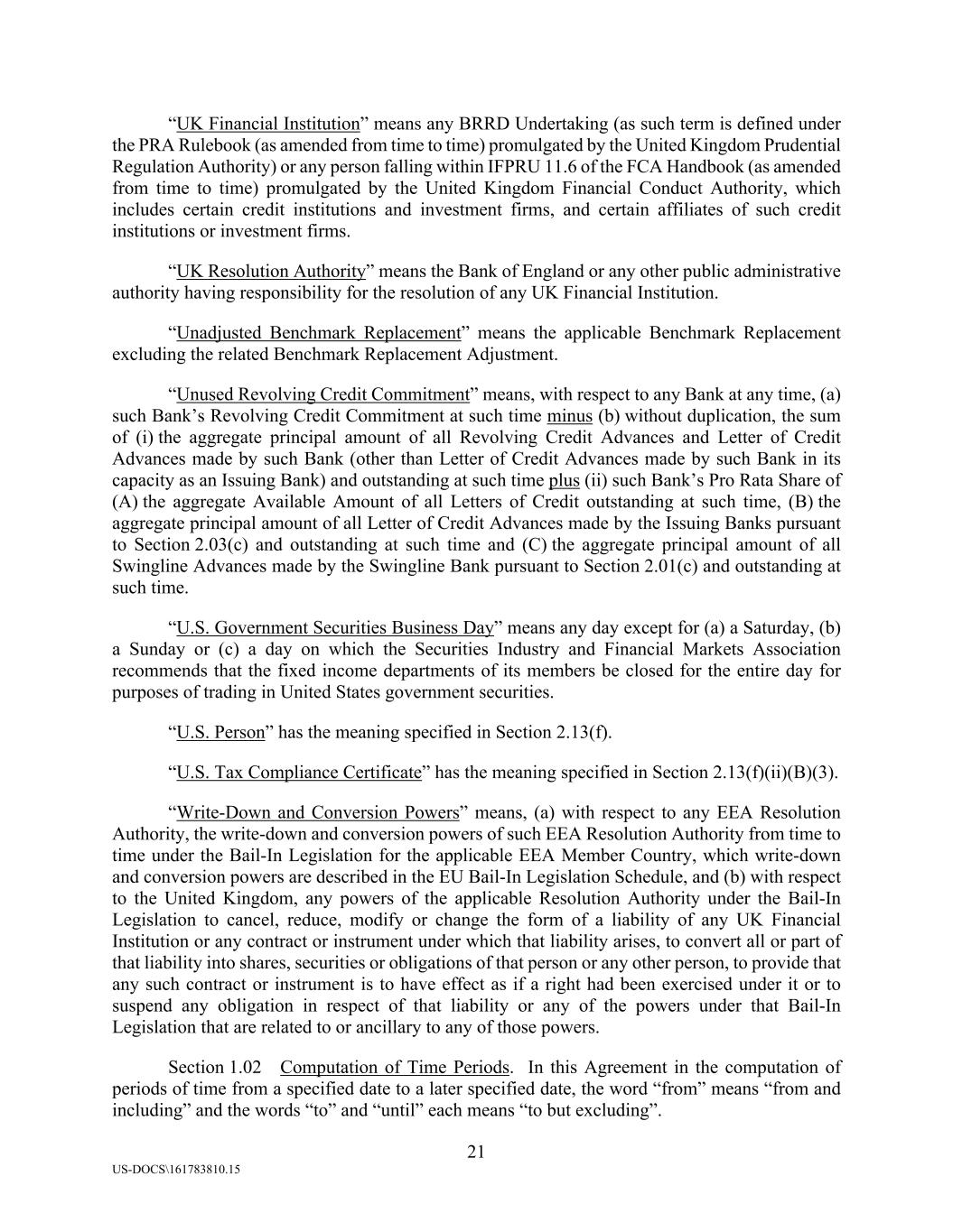 21 US-DOCS\161783810.15 “UK Financial Institution” means any BRRD Undertaking (as such term is defined under the PRA Rulebook (as amended from time to time) promulgated by the United Kingdom Prudential Regulation Authority) or any person falling within IFPRU 11.6 of the FCA Handbook (as amended from time to time) promulgated by the United Kingdom Financial Conduct Authority, which includes certain credit institutions and investment firms, and certain affiliates of such credit institutions or investment firms. “UK Resolution Authority” means the Bank of England or any other public administrative authority having responsibility for the resolution of any UK Financial Institution. “Unadjusted Benchmark Replacement” means the applicable Benchmark Replacement excluding the related Benchmark Replacement Adjustment. “Unused Revolving Credit Commitment” means, with respect to any Bank at any time, (a) such Bank’s Revolving Credit Commitment at such time minus (b) without duplication, the sum of (i) the aggregate principal amount of all Revolving Credit Advances and Letter of Credit Advances made by such Bank (other than Letter of Credit Advances made by such Bank in its capacity as an Issuing Bank) and outstanding at such time plus (ii) such Bank’s Pro Rata Share of (A) the aggregate Available Amount of all Letters of Credit outstanding at such time, (B) the aggregate principal amount of all Letter of Credit Advances made by the Issuing Banks pursuant to Section 2.03(c) and outstanding at such time and (C) the aggregate principal amount of all Swingline Advances made by the Swingline Bank pursuant to Section 2.01(c) and outstanding at such time. “U.S. Government Securities Business Day” means any day except for (a) a Saturday, (b) a Sunday or (c) a day on which the Securities Industry and Financial Markets Association recommends that the fixed income departments of its members be closed for the entire day for purposes of trading in United States government securities. “U.S. Person” has the meaning specified in Section 2.13(f). “U.S. Tax Compliance Certificate” has the meaning specified in Section 2.13(f)(ii)(B)(3). “Write-Down and Conversion Powers” means, (a) with respect to any EEA Resolution Authority, the write-down and conversion powers of such EEA Resolution Authority from time to time under the Bail-In Legislation for the applicable EEA Member Country, which write-down and conversion powers are described in the EU Bail-In Legislation Schedule, and (b) with respect to the United Kingdom, any powers of the applicable Resolution Authority under the Bail-In Legislation to cancel, reduce, modify or change the form of a liability of any UK Financial Institution or any contract or instrument under which that liability arises, to convert all or part of that liability into shares, securities or obligations of that person or any other person, to provide that any such contract or instrument is to have effect as if a right had been exercised under it or to suspend any obligation in respect of that liability or any of the powers under that Bail-In Legislation that are related to or ancillary to any of those powers. Section 1.02 Computation of Time Periods. In this Agreement in the computation of periods of time from a specified date to a later specified date, the word “from” means “from and including” and the words “to” and “until” each means “to but excluding”.