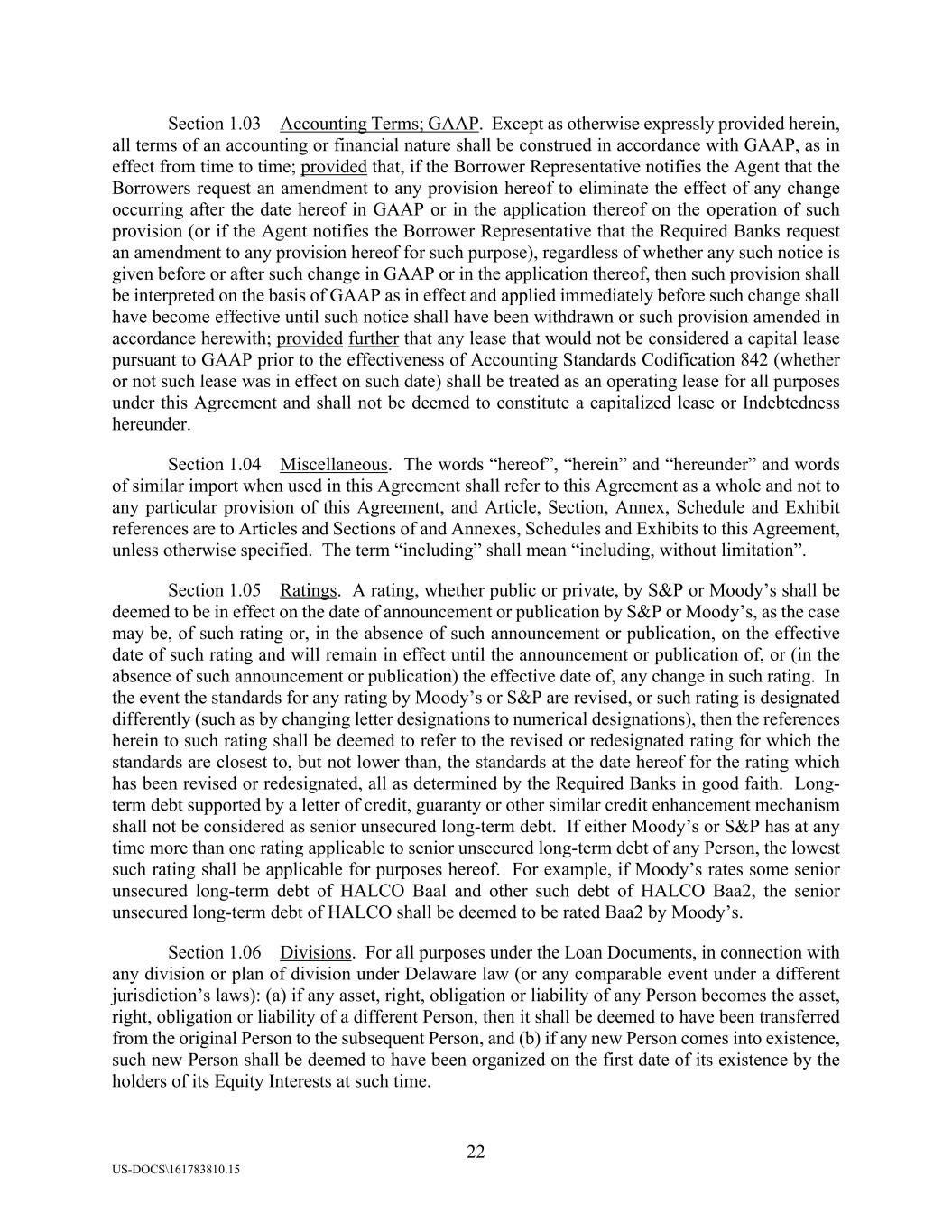 22 US-DOCS\161783810.15 Section 1.03 Accounting Terms; GAAP. Except as otherwise expressly provided herein, all terms of an accounting or financial nature shall be construed in accordance with GAAP, as in effect from time to time; provided that, if the Borrower Representative notifies the Agent that the Borrowers request an amendment to any provision hereof to eliminate the effect of any change occurring after the date hereof in GAAP or in the application thereof on the operation of such provision (or if the Agent notifies the Borrower Representative that the Required Banks request an amendment to any provision hereof for such purpose), regardless of whether any such notice is given before or after such change in GAAP or in the application thereof, then such provision shall be interpreted on the basis of GAAP as in effect and applied immediately before such change shall have become effective until such notice shall have been withdrawn or such provision amended in accordance herewith; provided further that any lease that would not be considered a capital lease pursuant to GAAP prior to the effectiveness of Accounting Standards Codification 842 (whether or not such lease was in effect on such date) shall be treated as an operating lease for all purposes under this Agreement and shall not be deemed to constitute a capitalized lease or Indebtedness hereunder. Section 1.04 Miscellaneous. The words “hereof”, “herein” and “hereunder” and words of similar import when used in this Agreement shall refer to this Agreement as a whole and not to any particular provision of this Agreement, and Article, Section, Annex, Schedule and Exhibit references are to Articles and Sections of and Annexes, Schedules and Exhibits to this Agreement, unless otherwise specified. The term “including” shall mean “including, without limitation”. Section 1.05 Ratings. A rating, whether public or private, by S&P or Moody’s shall be deemed to be in effect on the date of announcement or publication by S&P or Moody’s, as the case may be, of such rating or, in the absence of such announcement or publication, on the effective date of such rating and will remain in effect until the announcement or publication of, or (in the absence of such announcement or publication) the effective date of, any change in such rating. In the event the standards for any rating by Moody’s or S&P are revised, or such rating is designated differently (such as by changing letter designations to numerical designations), then the references herein to such rating shall be deemed to refer to the revised or redesignated rating for which the standards are closest to, but not lower than, the standards at the date hereof for the rating which has been revised or redesignated, all as determined by the Required Banks in good faith. Long- term debt supported by a letter of credit, guaranty or other similar credit enhancement mechanism shall not be considered as senior unsecured long-term debt. If either Moody’s or S&P has at any time more than one rating applicable to senior unsecured long-term debt of any Person, the lowest such rating shall be applicable for purposes hereof. For example, if Moody’s rates some senior unsecured long-term debt of HALCO Baal and other such debt of HALCO Baa2, the senior unsecured long-term debt of HALCO shall be deemed to be rated Baa2 by Moody’s. Section 1.06 Divisions. For all purposes under the Loan Documents, in connection with any division or plan of division under Delaware law (or any comparable event under a different jurisdiction’s laws): (a) if any asset, right, obligation or liability of any Person becomes the asset, right, obligation or liability of a different Person, then it shall be deemed to have been transferred from the original Person to the subsequent Person, and (b) if any new Person comes into existence, such new Person shall be deemed to have been organized on the first date of its existence by the holders of its Equity Interests at such time.