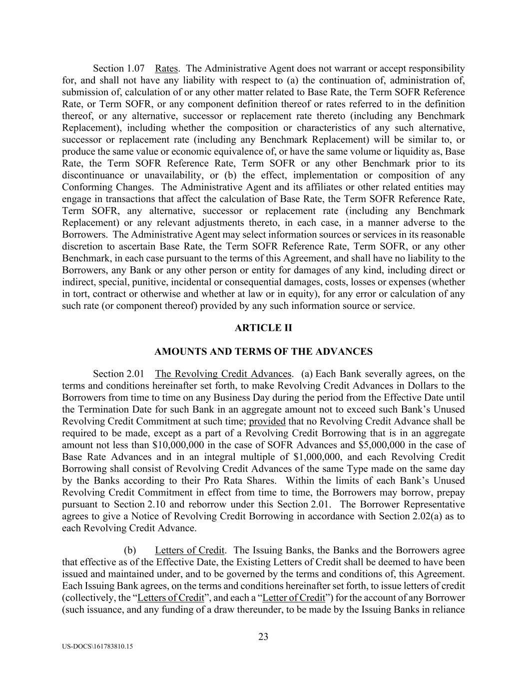 23 US-DOCS\161783810.15 Section 1.07 Rates. The Administrative Agent does not warrant or accept responsibility for, and shall not have any liability with respect to (a) the continuation of, administration of, submission of, calculation of or any other matter related to Base Rate, the Term SOFR Reference Rate, or Term SOFR, or any component definition thereof or rates referred to in the definition thereof, or any alternative, successor or replacement rate thereto (including any Benchmark Replacement), including whether the composition or characteristics of any such alternative, successor or replacement rate (including any Benchmark Replacement) will be similar to, or produce the same value or economic equivalence of, or have the same volume or liquidity as, Base Rate, the Term SOFR Reference Rate, Term SOFR or any other Benchmark prior to its discontinuance or unavailability, or (b) the effect, implementation or composition of any Conforming Changes. The Administrative Agent and its affiliates or other related entities may engage in transactions that affect the calculation of Base Rate, the Term SOFR Reference Rate, Term SOFR, any alternative, successor or replacement rate (including any Benchmark Replacement) or any relevant adjustments thereto, in each case, in a manner adverse to the Borrowers. The Administrative Agent may select information sources or services in its reasonable discretion to ascertain Base Rate, the Term SOFR Reference Rate, Term SOFR, or any other Benchmark, in each case pursuant to the terms of this Agreement, and shall have no liability to the Borrowers, any Bank or any other person or entity for damages of any kind, including direct or indirect, special, punitive, incidental or consequential damages, costs, losses or expenses (whether in tort, contract or otherwise and whether at law or in equity), for any error or calculation of any such rate (or component thereof) provided by any such information source or service. ARTICLE II AMOUNTS AND TERMS OF THE ADVANCES Section 2.01 The Revolving Credit Advances. (a) Each Bank severally agrees, on the terms and conditions hereinafter set forth, to make Revolving Credit Advances in Dollars to the Borrowers from time to time on any Business Day during the period from the Effective Date until the Termination Date for such Bank in an aggregate amount not to exceed such Bank’s Unused Revolving Credit Commitment at such time; provided that no Revolving Credit Advance shall be required to be made, except as a part of a Revolving Credit Borrowing that is in an aggregate amount not less than $10,000,000 in the case of SOFR Advances and $5,000,000 in the case of Base Rate Advances and in an integral multiple of $1,000,000, and each Revolving Credit Borrowing shall consist of Revolving Credit Advances of the same Type made on the same day by the Banks according to their Pro Rata Shares. Within the limits of each Bank’s Unused Revolving Credit Commitment in effect from time to time, the Borrowers may borrow, prepay pursuant to Section 2.10 and reborrow under this Section 2.01. The Borrower Representative agrees to give a Notice of Revolving Credit Borrowing in accordance with Section 2.02(a) as to each Revolving Credit Advance. (b) Letters of Credit. The Issuing Banks, the Banks and the Borrowers agree that effective as of the Effective Date, the Existing Letters of Credit shall be deemed to have been issued and maintained under, and to be governed by the terms and conditions of, this Agreement. Each Issuing Bank agrees, on the terms and conditions hereinafter set forth, to issue letters of credit (collectively, the “Letters of Credit”, and each a “Letter of Credit”) for the account of any Borrower (such issuance, and any funding of a draw thereunder, to be made by the Issuing Banks in reliance