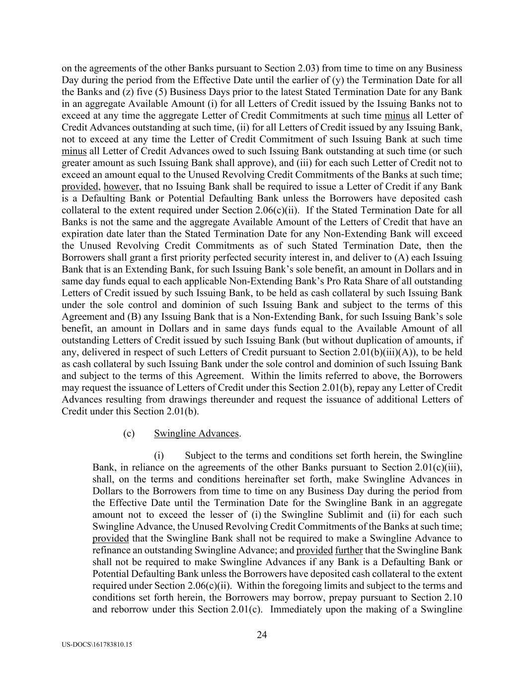 24 US-DOCS\161783810.15 on the agreements of the other Banks pursuant to Section 2.03) from time to time on any Business Day during the period from the Effective Date until the earlier of (y) the Termination Date for all the Banks and (z) five (5) Business Days prior to the latest Stated Termination Date for any Bank in an aggregate Available Amount (i) for all Letters of Credit issued by the Issuing Banks not to exceed at any time the aggregate Letter of Credit Commitments at such time minus all Letter of Credit Advances outstanding at such time, (ii) for all Letters of Credit issued by any Issuing Bank, not to exceed at any time the Letter of Credit Commitment of such Issuing Bank at such time minus all Letter of Credit Advances owed to such Issuing Bank outstanding at such time (or such greater amount as such Issuing Bank shall approve), and (iii) for each such Letter of Credit not to exceed an amount equal to the Unused Revolving Credit Commitments of the Banks at such time; provided, however, that no Issuing Bank shall be required to issue a Letter of Credit if any Bank is a Defaulting Bank or Potential Defaulting Bank unless the Borrowers have deposited cash collateral to the extent required under Section 2.06(c)(ii). If the Stated Termination Date for all Banks is not the same and the aggregate Available Amount of the Letters of Credit that have an expiration date later than the Stated Termination Date for any Non-Extending Bank will exceed the Unused Revolving Credit Commitments as of such Stated Termination Date, then the Borrowers shall grant a first priority perfected security interest in, and deliver to (A) each Issuing Bank that is an Extending Bank, for such Issuing Bank’s sole benefit, an amount in Dollars and in same day funds equal to each applicable Non-Extending Bank’s Pro Rata Share of all outstanding Letters of Credit issued by such Issuing Bank, to be held as cash collateral by such Issuing Bank under the sole control and dominion of such Issuing Bank and subject to the terms of this Agreement and (B) any Issuing Bank that is a Non-Extending Bank, for such Issuing Bank’s sole benefit, an amount in Dollars and in same days funds equal to the Available Amount of all outstanding Letters of Credit issued by such Issuing Bank (but without duplication of amounts, if any, delivered in respect of such Letters of Credit pursuant to Section 2.01(b)(iii)(A)), to be held as cash collateral by such Issuing Bank under the sole control and dominion of such Issuing Bank and subject to the terms of this Agreement. Within the limits referred to above, the Borrowers may request the issuance of Letters of Credit under this Section 2.01(b), repay any Letter of Credit Advances resulting from drawings thereunder and request the issuance of additional Letters of Credit under this Section 2.01(b). (c) Swingline Advances. (i) Subject to the terms and conditions set forth herein, the Swingline Bank, in reliance on the agreements of the other Banks pursuant to Section 2.01(c)(iii), shall, on the terms and conditions hereinafter set forth, make Swingline Advances in Dollars to the Borrowers from time to time on any Business Day during the period from the Effective Date until the Termination Date for the Swingline Bank in an aggregate amount not to exceed the lesser of (i) the Swingline Sublimit and (ii) for each such Swingline Advance, the Unused Revolving Credit Commitments of the Banks at such time; provided that the Swingline Bank shall not be required to make a Swingline Advance to refinance an outstanding Swingline Advance; and provided further that the Swingline Bank shall not be required to make Swingline Advances if any Bank is a Defaulting Bank or Potential Defaulting Bank unless the Borrowers have deposited cash collateral to the extent required under Section 2.06(c)(ii). Within the foregoing limits and subject to the terms and conditions set forth herein, the Borrowers may borrow, prepay pursuant to Section 2.10 and reborrow under this Section 2.01(c). Immediately upon the making of a Swingline