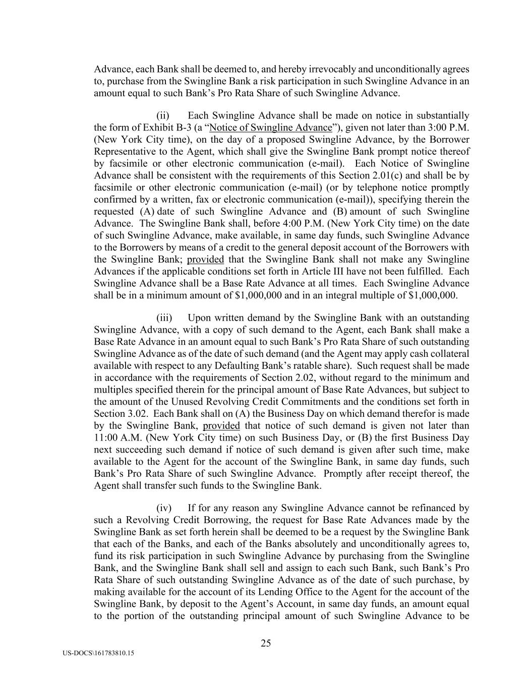 25 US-DOCS\161783810.15 Advance, each Bank shall be deemed to, and hereby irrevocably and unconditionally agrees to, purchase from the Swingline Bank a risk participation in such Swingline Advance in an amount equal to such Bank’s Pro Rata Share of such Swingline Advance. (ii) Each Swingline Advance shall be made on notice in substantially the form of Exhibit B-3 (a “Notice of Swingline Advance”), given not later than 3:00 P.M. (New York City time), on the day of a proposed Swingline Advance, by the Borrower Representative to the Agent, which shall give the Swingline Bank prompt notice thereof by facsimile or other electronic communication (e-mail). Each Notice of Swingline Advance shall be consistent with the requirements of this Section 2.01(c) and shall be by facsimile or other electronic communication (e-mail) (or by telephone notice promptly confirmed by a written, fax or electronic communication (e-mail)), specifying therein the requested (A) date of such Swingline Advance and (B) amount of such Swingline Advance. The Swingline Bank shall, before 4:00 P.M. (New York City time) on the date of such Swingline Advance, make available, in same day funds, such Swingline Advance to the Borrowers by means of a credit to the general deposit account of the Borrowers with the Swingline Bank; provided that the Swingline Bank shall not make any Swingline Advances if the applicable conditions set forth in Article III have not been fulfilled. Each Swingline Advance shall be a Base Rate Advance at all times. Each Swingline Advance shall be in a minimum amount of $1,000,000 and in an integral multiple of $1,000,000. (iii) Upon written demand by the Swingline Bank with an outstanding Swingline Advance, with a copy of such demand to the Agent, each Bank shall make a Base Rate Advance in an amount equal to such Bank’s Pro Rata Share of such outstanding Swingline Advance as of the date of such demand (and the Agent may apply cash collateral available with respect to any Defaulting Bank’s ratable share). Such request shall be made in accordance with the requirements of Section 2.02, without regard to the minimum and multiples specified therein for the principal amount of Base Rate Advances, but subject to the amount of the Unused Revolving Credit Commitments and the conditions set forth in Section 3.02. Each Bank shall on (A) the Business Day on which demand therefor is made by the Swingline Bank, provided that notice of such demand is given not later than 11:00 A.M. (New York City time) on such Business Day, or (B) the first Business Day next succeeding such demand if notice of such demand is given after such time, make available to the Agent for the account of the Swingline Bank, in same day funds, such Bank’s Pro Rata Share of such Swingline Advance. Promptly after receipt thereof, the Agent shall transfer such funds to the Swingline Bank. (iv) If for any reason any Swingline Advance cannot be refinanced by such a Revolving Credit Borrowing, the request for Base Rate Advances made by the Swingline Bank as set forth herein shall be deemed to be a request by the Swingline Bank that each of the Banks, and each of the Banks absolutely and unconditionally agrees to, fund its risk participation in such Swingline Advance by purchasing from the Swingline Bank, and the Swingline Bank shall sell and assign to each such Bank, such Bank’s Pro Rata Share of such outstanding Swingline Advance as of the date of such purchase, by making available for the account of its Lending Office to the Agent for the account of the Swingline Bank, by deposit to the Agent’s Account, in same day funds, an amount equal to the portion of the outstanding principal amount of such Swingline Advance to be
