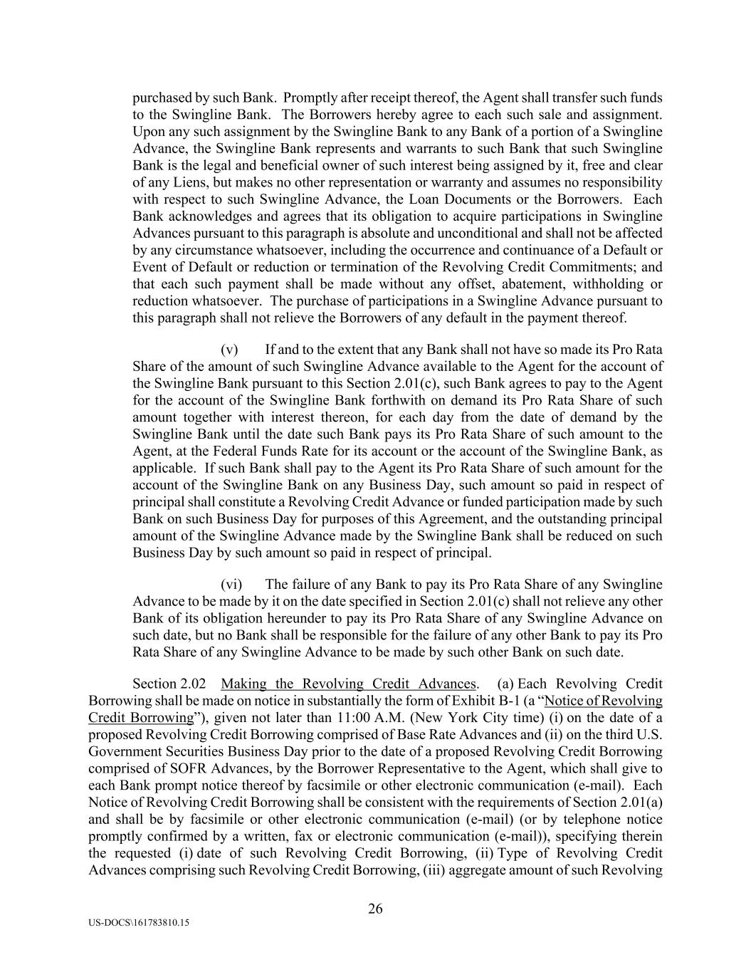 26 US-DOCS\161783810.15 purchased by such Bank. Promptly after receipt thereof, the Agent shall transfer such funds to the Swingline Bank. The Borrowers hereby agree to each such sale and assignment. Upon any such assignment by the Swingline Bank to any Bank of a portion of a Swingline Advance, the Swingline Bank represents and warrants to such Bank that such Swingline Bank is the legal and beneficial owner of such interest being assigned by it, free and clear of any Liens, but makes no other representation or warranty and assumes no responsibility with respect to such Swingline Advance, the Loan Documents or the Borrowers. Each Bank acknowledges and agrees that its obligation to acquire participations in Swingline Advances pursuant to this paragraph is absolute and unconditional and shall not be affected by any circumstance whatsoever, including the occurrence and continuance of a Default or Event of Default or reduction or termination of the Revolving Credit Commitments; and that each such payment shall be made without any offset, abatement, withholding or reduction whatsoever. The purchase of participations in a Swingline Advance pursuant to this paragraph shall not relieve the Borrowers of any default in the payment thereof. (v) If and to the extent that any Bank shall not have so made its Pro Rata Share of the amount of such Swingline Advance available to the Agent for the account of the Swingline Bank pursuant to this Section 2.01(c), such Bank agrees to pay to the Agent for the account of the Swingline Bank forthwith on demand its Pro Rata Share of such amount together with interest thereon, for each day from the date of demand by the Swingline Bank until the date such Bank pays its Pro Rata Share of such amount to the Agent, at the Federal Funds Rate for its account or the account of the Swingline Bank, as applicable. If such Bank shall pay to the Agent its Pro Rata Share of such amount for the account of the Swingline Bank on any Business Day, such amount so paid in respect of principal shall constitute a Revolving Credit Advance or funded participation made by such Bank on such Business Day for purposes of this Agreement, and the outstanding principal amount of the Swingline Advance made by the Swingline Bank shall be reduced on such Business Day by such amount so paid in respect of principal. (vi) The failure of any Bank to pay its Pro Rata Share of any Swingline Advance to be made by it on the date specified in Section 2.01(c) shall not relieve any other Bank of its obligation hereunder to pay its Pro Rata Share of any Swingline Advance on such date, but no Bank shall be responsible for the failure of any other Bank to pay its Pro Rata Share of any Swingline Advance to be made by such other Bank on such date. Section 2.02 Making the Revolving Credit Advances. (a) Each Revolving Credit Borrowing shall be made on notice in substantially the form of Exhibit B-1 (a “Notice of Revolving Credit Borrowing”), given not later than 11:00 A.M. (New York City time) (i) on the date of a proposed Revolving Credit Borrowing comprised of Base Rate Advances and (ii) on the third U.S. Government Securities Business Day prior to the date of a proposed Revolving Credit Borrowing comprised of SOFR Advances, by the Borrower Representative to the Agent, which shall give to each Bank prompt notice thereof by facsimile or other electronic communication (e-mail). Each Notice of Revolving Credit Borrowing shall be consistent with the requirements of Section 2.01(a) and shall be by facsimile or other electronic communication (e-mail) (or by telephone notice promptly confirmed by a written, fax or electronic communication (e-mail)), specifying therein the requested (i) date of such Revolving Credit Borrowing, (ii) Type of Revolving Credit Advances comprising such Revolving Credit Borrowing, (iii) aggregate amount of such Revolving