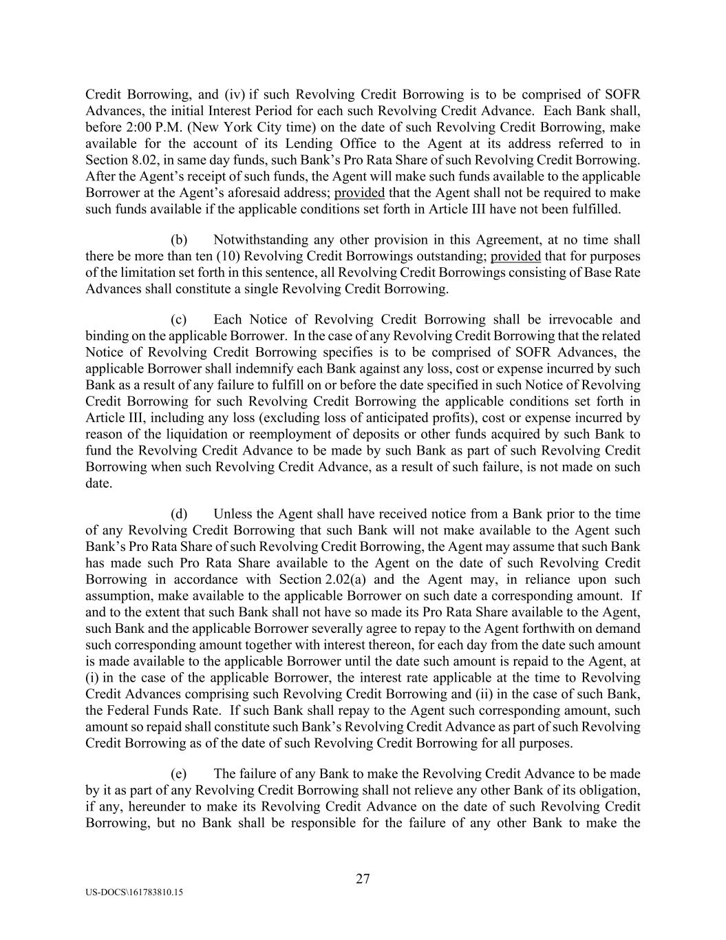 27 US-DOCS\161783810.15 Credit Borrowing, and (iv) if such Revolving Credit Borrowing is to be comprised of SOFR Advances, the initial Interest Period for each such Revolving Credit Advance. Each Bank shall, before 2:00 P.M. (New York City time) on the date of such Revolving Credit Borrowing, make available for the account of its Lending Office to the Agent at its address referred to in Section 8.02, in same day funds, such Bank’s Pro Rata Share of such Revolving Credit Borrowing. After the Agent’s receipt of such funds, the Agent will make such funds available to the applicable Borrower at the Agent’s aforesaid address; provided that the Agent shall not be required to make such funds available if the applicable conditions set forth in Article III have not been fulfilled. (b) Notwithstanding any other provision in this Agreement, at no time shall there be more than ten (10) Revolving Credit Borrowings outstanding; provided that for purposes of the limitation set forth in this sentence, all Revolving Credit Borrowings consisting of Base Rate Advances shall constitute a single Revolving Credit Borrowing. (c) Each Notice of Revolving Credit Borrowing shall be irrevocable and binding on the applicable Borrower. In the case of any Revolving Credit Borrowing that the related Notice of Revolving Credit Borrowing specifies is to be comprised of SOFR Advances, the applicable Borrower shall indemnify each Bank against any loss, cost or expense incurred by such Bank as a result of any failure to fulfill on or before the date specified in such Notice of Revolving Credit Borrowing for such Revolving Credit Borrowing the applicable conditions set forth in Article III, including any loss (excluding loss of anticipated profits), cost or expense incurred by reason of the liquidation or reemployment of deposits or other funds acquired by such Bank to fund the Revolving Credit Advance to be made by such Bank as part of such Revolving Credit Borrowing when such Revolving Credit Advance, as a result of such failure, is not made on such date. (d) Unless the Agent shall have received notice from a Bank prior to the time of any Revolving Credit Borrowing that such Bank will not make available to the Agent such Bank’s Pro Rata Share of such Revolving Credit Borrowing, the Agent may assume that such Bank has made such Pro Rata Share available to the Agent on the date of such Revolving Credit Borrowing in accordance with Section 2.02(a) and the Agent may, in reliance upon such assumption, make available to the applicable Borrower on such date a corresponding amount. If and to the extent that such Bank shall not have so made its Pro Rata Share available to the Agent, such Bank and the applicable Borrower severally agree to repay to the Agent forthwith on demand such corresponding amount together with interest thereon, for each day from the date such amount is made available to the applicable Borrower until the date such amount is repaid to the Agent, at (i) in the case of the applicable Borrower, the interest rate applicable at the time to Revolving Credit Advances comprising such Revolving Credit Borrowing and (ii) in the case of such Bank, the Federal Funds Rate. If such Bank shall repay to the Agent such corresponding amount, such amount so repaid shall constitute such Bank’s Revolving Credit Advance as part of such Revolving Credit Borrowing as of the date of such Revolving Credit Borrowing for all purposes. (e) The failure of any Bank to make the Revolving Credit Advance to be made by it as part of any Revolving Credit Borrowing shall not relieve any other Bank of its obligation, if any, hereunder to make its Revolving Credit Advance on the date of such Revolving Credit Borrowing, but no Bank shall be responsible for the failure of any other Bank to make the