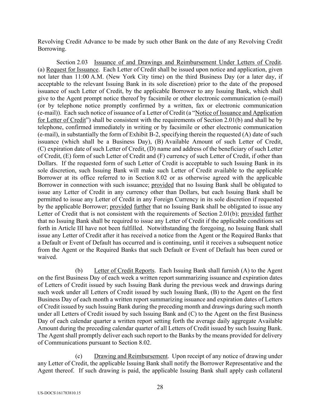 28 US-DOCS\161783810.15 Revolving Credit Advance to be made by such other Bank on the date of any Revolving Credit Borrowing. Section 2.03 Issuance of and Drawings and Reimbursement Under Letters of Credit. (a) Request for Issuance. Each Letter of Credit shall be issued upon notice and application, given not later than 11:00 A.M. (New York City time) on the third Business Day (or a later day, if acceptable to the relevant Issuing Bank in its sole discretion) prior to the date of the proposed issuance of such Letter of Credit, by the applicable Borrower to any Issuing Bank, which shall give to the Agent prompt notice thereof by facsimile or other electronic communication (e-mail) (or by telephone notice promptly confirmed by a written, fax or electronic communication (e-mail)). Each such notice of issuance of a Letter of Credit (a “Notice of Issuance and Application for Letter of Credit”) shall be consistent with the requirements of Section 2.01(b) and shall be by telephone, confirmed immediately in writing or by facsimile or other electronic communication (e-mail), in substantially the form of Exhibit B-2, specifying therein the requested (A) date of such issuance (which shall be a Business Day), (B) Available Amount of such Letter of Credit, (C) expiration date of such Letter of Credit, (D) name and address of the beneficiary of such Letter of Credit, (E) form of such Letter of Credit and (F) currency of such Letter of Credit, if other than Dollars. If the requested form of such Letter of Credit is acceptable to such Issuing Bank in its sole discretion, such Issuing Bank will make such Letter of Credit available to the applicable Borrower at its office referred to in Section 8.02 or as otherwise agreed with the applicable Borrower in connection with such issuance; provided that no Issuing Bank shall be obligated to issue any Letter of Credit in any currency other than Dollars, but each Issuing Bank shall be permitted to issue any Letter of Credit in any Foreign Currency in its sole discretion if requested by the applicable Borrower; provided further that no Issuing Bank shall be obligated to issue any Letter of Credit that is not consistent with the requirements of Section 2.01(b); provided further that no Issuing Bank shall be required to issue any Letter of Credit if the applicable conditions set forth in Article III have not been fulfilled. Notwithstanding the foregoing, no Issuing Bank shall issue any Letter of Credit after it has received a notice from the Agent or the Required Banks that a Default or Event of Default has occurred and is continuing, until it receives a subsequent notice from the Agent or the Required Banks that such Default or Event of Default has been cured or waived. (b) Letter of Credit Reports. Each Issuing Bank shall furnish (A) to the Agent on the first Business Day of each week a written report summarizing issuance and expiration dates of Letters of Credit issued by such Issuing Bank during the previous week and drawings during such week under all Letters of Credit issued by such Issuing Bank, (B) to the Agent on the first Business Day of each month a written report summarizing issuance and expiration dates of Letters of Credit issued by such Issuing Bank during the preceding month and drawings during such month under all Letters of Credit issued by such Issuing Bank and (C) to the Agent on the first Business Day of each calendar quarter a written report setting forth the average daily aggregate Available Amount during the preceding calendar quarter of all Letters of Credit issued by such Issuing Bank. The Agent shall promptly deliver each such report to the Banks by the means provided for delivery of Communications pursuant to Section 8.02. (c) Drawing and Reimbursement. Upon receipt of any notice of drawing under any Letter of Credit, the applicable Issuing Bank shall notify the Borrower Representative and the Agent thereof. If such drawing is paid, the applicable Issuing Bank shall apply cash collateral