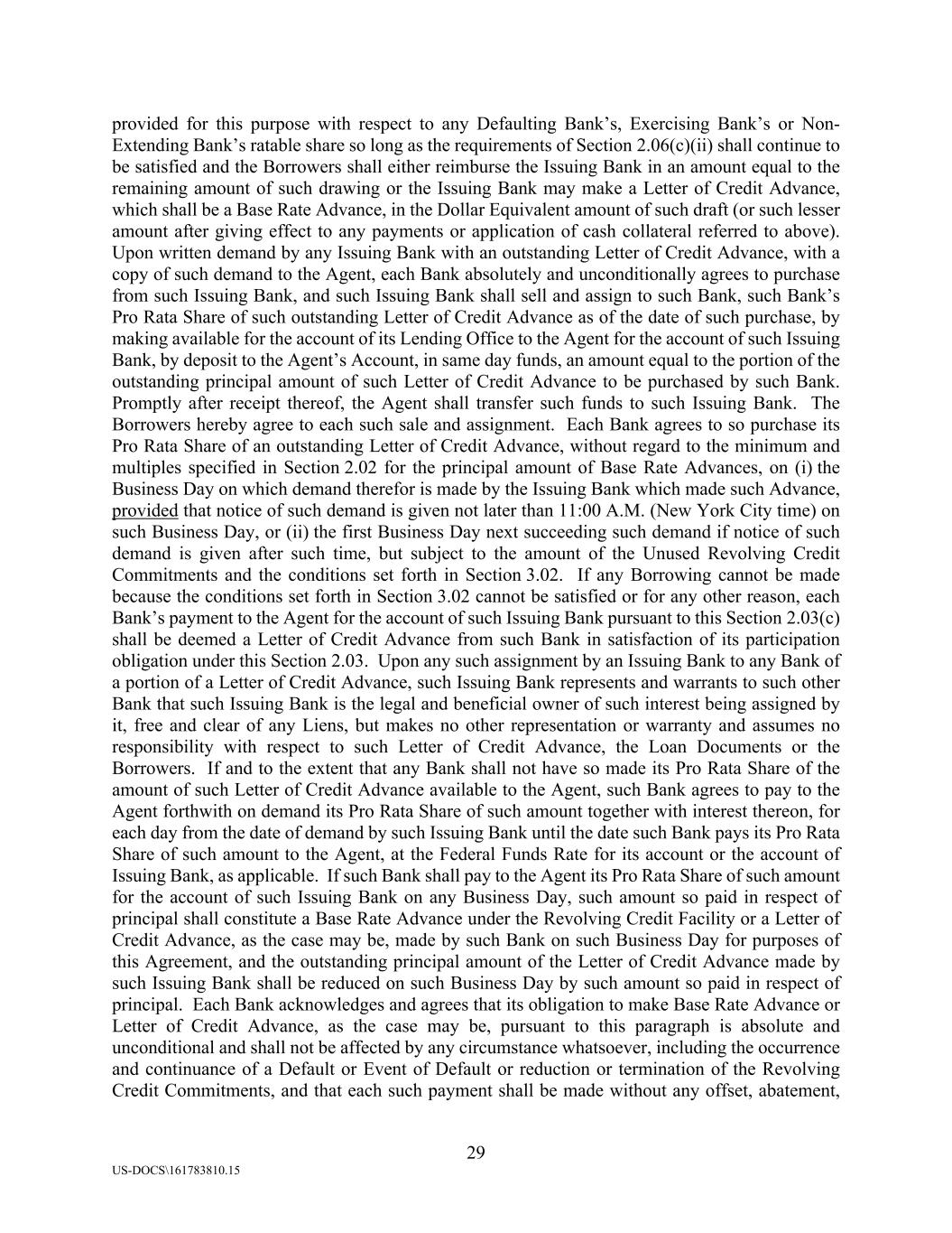 29 US-DOCS\161783810.15 provided for this purpose with respect to any Defaulting Bank’s, Exercising Bank’s or Non- Extending Bank’s ratable share so long as the requirements of Section 2.06(c)(ii) shall continue to be satisfied and the Borrowers shall either reimburse the Issuing Bank in an amount equal to the remaining amount of such drawing or the Issuing Bank may make a Letter of Credit Advance, which shall be a Base Rate Advance, in the Dollar Equivalent amount of such draft (or such lesser amount after giving effect to any payments or application of cash collateral referred to above). Upon written demand by any Issuing Bank with an outstanding Letter of Credit Advance, with a copy of such demand to the Agent, each Bank absolutely and unconditionally agrees to purchase from such Issuing Bank, and such Issuing Bank shall sell and assign to such Bank, such Bank’s Pro Rata Share of such outstanding Letter of Credit Advance as of the date of such purchase, by making available for the account of its Lending Office to the Agent for the account of such Issuing Bank, by deposit to the Agent’s Account, in same day funds, an amount equal to the portion of the outstanding principal amount of such Letter of Credit Advance to be purchased by such Bank. Promptly after receipt thereof, the Agent shall transfer such funds to such Issuing Bank. The Borrowers hereby agree to each such sale and assignment. Each Bank agrees to so purchase its Pro Rata Share of an outstanding Letter of Credit Advance, without regard to the minimum and multiples specified in Section 2.02 for the principal amount of Base Rate Advances, on (i) the Business Day on which demand therefor is made by the Issuing Bank which made such Advance, provided that notice of such demand is given not later than 11:00 A.M. (New York City time) on such Business Day, or (ii) the first Business Day next succeeding such demand if notice of such demand is given after such time, but subject to the amount of the Unused Revolving Credit Commitments and the conditions set forth in Section 3.02. If any Borrowing cannot be made because the conditions set forth in Section 3.02 cannot be satisfied or for any other reason, each Bank’s payment to the Agent for the account of such Issuing Bank pursuant to this Section 2.03(c) shall be deemed a Letter of Credit Advance from such Bank in satisfaction of its participation obligation under this Section 2.03. Upon any such assignment by an Issuing Bank to any Bank of a portion of a Letter of Credit Advance, such Issuing Bank represents and warrants to such other Bank that such Issuing Bank is the legal and beneficial owner of such interest being assigned by it, free and clear of any Liens, but makes no other representation or warranty and assumes no responsibility with respect to such Letter of Credit Advance, the Loan Documents or the Borrowers. If and to the extent that any Bank shall not have so made its Pro Rata Share of the amount of such Letter of Credit Advance available to the Agent, such Bank agrees to pay to the Agent forthwith on demand its Pro Rata Share of such amount together with interest thereon, for each day from the date of demand by such Issuing Bank until the date such Bank pays its Pro Rata Share of such amount to the Agent, at the Federal Funds Rate for its account or the account of Issuing Bank, as applicable. If such Bank shall pay to the Agent its Pro Rata Share of such amount for the account of such Issuing Bank on any Business Day, such amount so paid in respect of principal shall constitute a Base Rate Advance under the Revolving Credit Facility or a Letter of Credit Advance, as the case may be, made by such Bank on such Business Day for purposes of this Agreement, and the outstanding principal amount of the Letter of Credit Advance made by such Issuing Bank shall be reduced on such Business Day by such amount so paid in respect of principal. Each Bank acknowledges and agrees that its obligation to make Base Rate Advance or Letter of Credit Advance, as the case may be, pursuant to this paragraph is absolute and unconditional and shall not be affected by any circumstance whatsoever, including the occurrence and continuance of a Default or Event of Default or reduction or termination of the Revolving Credit Commitments, and that each such payment shall be made without any offset, abatement,