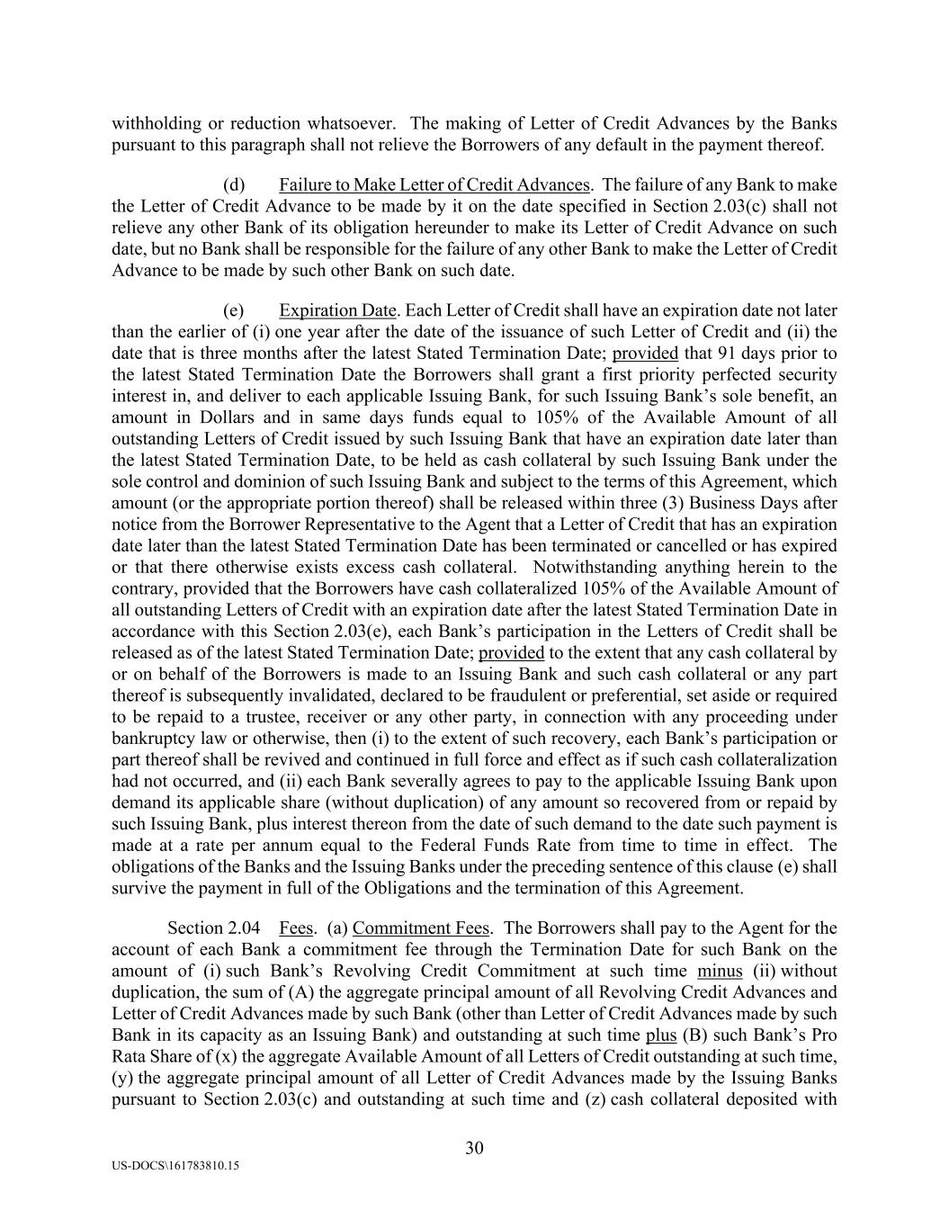 30 US-DOCS\161783810.15 withholding or reduction whatsoever. The making of Letter of Credit Advances by the Banks pursuant to this paragraph shall not relieve the Borrowers of any default in the payment thereof. (d) Failure to Make Letter of Credit Advances. The failure of any Bank to make the Letter of Credit Advance to be made by it on the date specified in Section 2.03(c) shall not relieve any other Bank of its obligation hereunder to make its Letter of Credit Advance on such date, but no Bank shall be responsible for the failure of any other Bank to make the Letter of Credit Advance to be made by such other Bank on such date. (e) Expiration Date. Each Letter of Credit shall have an expiration date not later than the earlier of (i) one year after the date of the issuance of such Letter of Credit and (ii) the date that is three months after the latest Stated Termination Date; provided that 91 days prior to the latest Stated Termination Date the Borrowers shall grant a first priority perfected security interest in, and deliver to each applicable Issuing Bank, for such Issuing Bank’s sole benefit, an amount in Dollars and in same days funds equal to 105% of the Available Amount of all outstanding Letters of Credit issued by such Issuing Bank that have an expiration date later than the latest Stated Termination Date, to be held as cash collateral by such Issuing Bank under the sole control and dominion of such Issuing Bank and subject to the terms of this Agreement, which amount (or the appropriate portion thereof) shall be released within three (3) Business Days after notice from the Borrower Representative to the Agent that a Letter of Credit that has an expiration date later than the latest Stated Termination Date has been terminated or cancelled or has expired or that there otherwise exists excess cash collateral. Notwithstanding anything herein to the contrary, provided that the Borrowers have cash collateralized 105% of the Available Amount of all outstanding Letters of Credit with an expiration date after the latest Stated Termination Date in accordance with this Section 2.03(e), each Bank’s participation in the Letters of Credit shall be released as of the latest Stated Termination Date; provided to the extent that any cash collateral by or on behalf of the Borrowers is made to an Issuing Bank and such cash collateral or any part thereof is subsequently invalidated, declared to be fraudulent or preferential, set aside or required to be repaid to a trustee, receiver or any other party, in connection with any proceeding under bankruptcy law or otherwise, then (i) to the extent of such recovery, each Bank’s participation or part thereof shall be revived and continued in full force and effect as if such cash collateralization had not occurred, and (ii) each Bank severally agrees to pay to the applicable Issuing Bank upon demand its applicable share (without duplication) of any amount so recovered from or repaid by such Issuing Bank, plus interest thereon from the date of such demand to the date such payment is made at a rate per annum equal to the Federal Funds Rate from time to time in effect. The obligations of the Banks and the Issuing Banks under the preceding sentence of this clause (e) shall survive the payment in full of the Obligations and the termination of this Agreement. Section 2.04 Fees. (a) Commitment Fees. The Borrowers shall pay to the Agent for the account of each Bank a commitment fee through the Termination Date for such Bank on the amount of (i) such Bank’s Revolving Credit Commitment at such time minus (ii) without duplication, the sum of (A) the aggregate principal amount of all Revolving Credit Advances and Letter of Credit Advances made by such Bank (other than Letter of Credit Advances made by such Bank in its capacity as an Issuing Bank) and outstanding at such time plus (B) such Bank’s Pro Rata Share of (x) the aggregate Available Amount of all Letters of Credit outstanding at such time, (y) the aggregate principal amount of all Letter of Credit Advances made by the Issuing Banks pursuant to Section 2.03(c) and outstanding at such time and (z) cash collateral deposited with