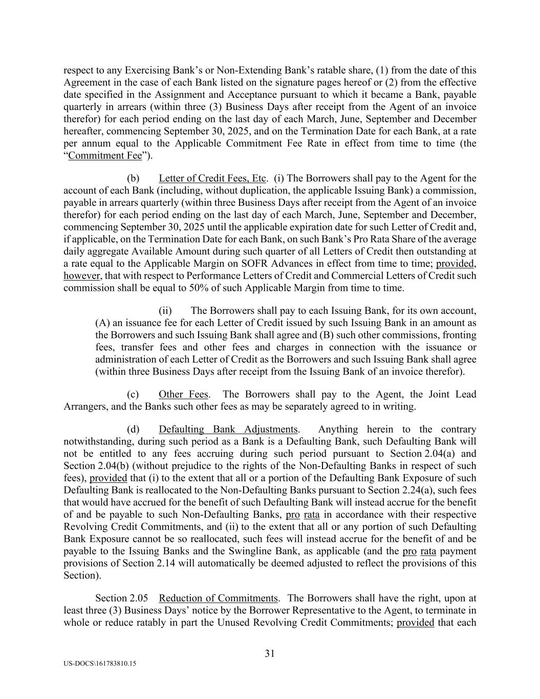 31 US-DOCS\161783810.15 respect to any Exercising Bank’s or Non-Extending Bank’s ratable share, (1) from the date of this Agreement in the case of each Bank listed on the signature pages hereof or (2) from the effective date specified in the Assignment and Acceptance pursuant to which it became a Bank, payable quarterly in arrears (within three (3) Business Days after receipt from the Agent of an invoice therefor) for each period ending on the last day of each March, June, September and December hereafter, commencing September 30, 2025, and on the Termination Date for each Bank, at a rate per annum equal to the Applicable Commitment Fee Rate in effect from time to time (the “Commitment Fee”). (b) Letter of Credit Fees, Etc. (i) The Borrowers shall pay to the Agent for the account of each Bank (including, without duplication, the applicable Issuing Bank) a commission, payable in arrears quarterly (within three Business Days after receipt from the Agent of an invoice therefor) for each period ending on the last day of each March, June, September and December, commencing September 30, 2025 until the applicable expiration date for such Letter of Credit and, if applicable, on the Termination Date for each Bank, on such Bank’s Pro Rata Share of the average daily aggregate Available Amount during such quarter of all Letters of Credit then outstanding at a rate equal to the Applicable Margin on SOFR Advances in effect from time to time; provided, however, that with respect to Performance Letters of Credit and Commercial Letters of Credit such commission shall be equal to 50% of such Applicable Margin from time to time. (ii) The Borrowers shall pay to each Issuing Bank, for its own account, (A) an issuance fee for each Letter of Credit issued by such Issuing Bank in an amount as the Borrowers and such Issuing Bank shall agree and (B) such other commissions, fronting fees, transfer fees and other fees and charges in connection with the issuance or administration of each Letter of Credit as the Borrowers and such Issuing Bank shall agree (within three Business Days after receipt from the Issuing Bank of an invoice therefor). (c) Other Fees. The Borrowers shall pay to the Agent, the Joint Lead Arrangers, and the Banks such other fees as may be separately agreed to in writing. (d) Defaulting Bank Adjustments. Anything herein to the contrary notwithstanding, during such period as a Bank is a Defaulting Bank, such Defaulting Bank will not be entitled to any fees accruing during such period pursuant to Section 2.04(a) and Section 2.04(b) (without prejudice to the rights of the Non-Defaulting Banks in respect of such fees), provided that (i) to the extent that all or a portion of the Defaulting Bank Exposure of such Defaulting Bank is reallocated to the Non-Defaulting Banks pursuant to Section 2.24(a), such fees that would have accrued for the benefit of such Defaulting Bank will instead accrue for the benefit of and be payable to such Non-Defaulting Banks, pro rata in accordance with their respective Revolving Credit Commitments, and (ii) to the extent that all or any portion of such Defaulting Bank Exposure cannot be so reallocated, such fees will instead accrue for the benefit of and be payable to the Issuing Banks and the Swingline Bank, as applicable (and the pro rata payment provisions of Section 2.14 will automatically be deemed adjusted to reflect the provisions of this Section). Section 2.05 Reduction of Commitments. The Borrowers shall have the right, upon at least three (3) Business Days’ notice by the Borrower Representative to the Agent, to terminate in whole or reduce ratably in part the Unused Revolving Credit Commitments; provided that each