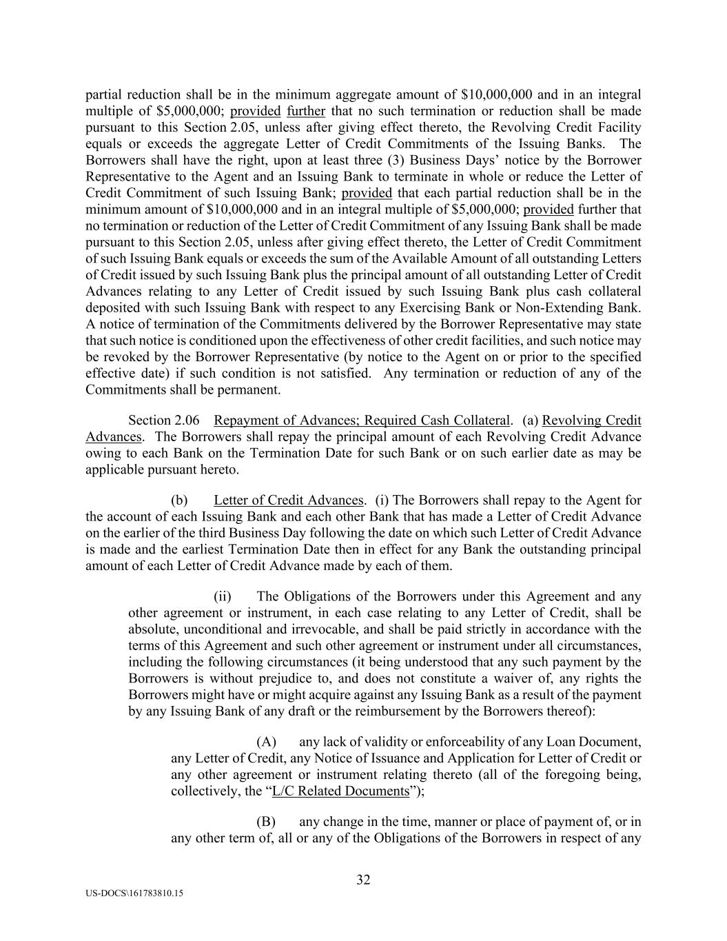 32 US-DOCS\161783810.15 partial reduction shall be in the minimum aggregate amount of $10,000,000 and in an integral multiple of $5,000,000; provided further that no such termination or reduction shall be made pursuant to this Section 2.05, unless after giving effect thereto, the Revolving Credit Facility equals or exceeds the aggregate Letter of Credit Commitments of the Issuing Banks. The Borrowers shall have the right, upon at least three (3) Business Days’ notice by the Borrower Representative to the Agent and an Issuing Bank to terminate in whole or reduce the Letter of Credit Commitment of such Issuing Bank; provided that each partial reduction shall be in the minimum amount of $10,000,000 and in an integral multiple of $5,000,000; provided further that no termination or reduction of the Letter of Credit Commitment of any Issuing Bank shall be made pursuant to this Section 2.05, unless after giving effect thereto, the Letter of Credit Commitment of such Issuing Bank equals or exceeds the sum of the Available Amount of all outstanding Letters of Credit issued by such Issuing Bank plus the principal amount of all outstanding Letter of Credit Advances relating to any Letter of Credit issued by such Issuing Bank plus cash collateral deposited with such Issuing Bank with respect to any Exercising Bank or Non-Extending Bank. A notice of termination of the Commitments delivered by the Borrower Representative may state that such notice is conditioned upon the effectiveness of other credit facilities, and such notice may be revoked by the Borrower Representative (by notice to the Agent on or prior to the specified effective date) if such condition is not satisfied. Any termination or reduction of any of the Commitments shall be permanent. Section 2.06 Repayment of Advances; Required Cash Collateral. (a) Revolving Credit Advances. The Borrowers shall repay the principal amount of each Revolving Credit Advance owing to each Bank on the Termination Date for such Bank or on such earlier date as may be applicable pursuant hereto. (b) Letter of Credit Advances. (i) The Borrowers shall repay to the Agent for the account of each Issuing Bank and each other Bank that has made a Letter of Credit Advance on the earlier of the third Business Day following the date on which such Letter of Credit Advance is made and the earliest Termination Date then in effect for any Bank the outstanding principal amount of each Letter of Credit Advance made by each of them. (ii) The Obligations of the Borrowers under this Agreement and any other agreement or instrument, in each case relating to any Letter of Credit, shall be absolute, unconditional and irrevocable, and shall be paid strictly in accordance with the terms of this Agreement and such other agreement or instrument under all circumstances, including the following circumstances (it being understood that any such payment by the Borrowers is without prejudice to, and does not constitute a waiver of, any rights the Borrowers might have or might acquire against any Issuing Bank as a result of the payment by any Issuing Bank of any draft or the reimbursement by the Borrowers thereof): (A) any lack of validity or enforceability of any Loan Document, any Letter of Credit, any Notice of Issuance and Application for Letter of Credit or any other agreement or instrument relating thereto (all of the foregoing being, collectively, the “L/C Related Documents”); (B) any change in the time, manner or place of payment of, or in any other term of, all or any of the Obligations of the Borrowers in respect of any