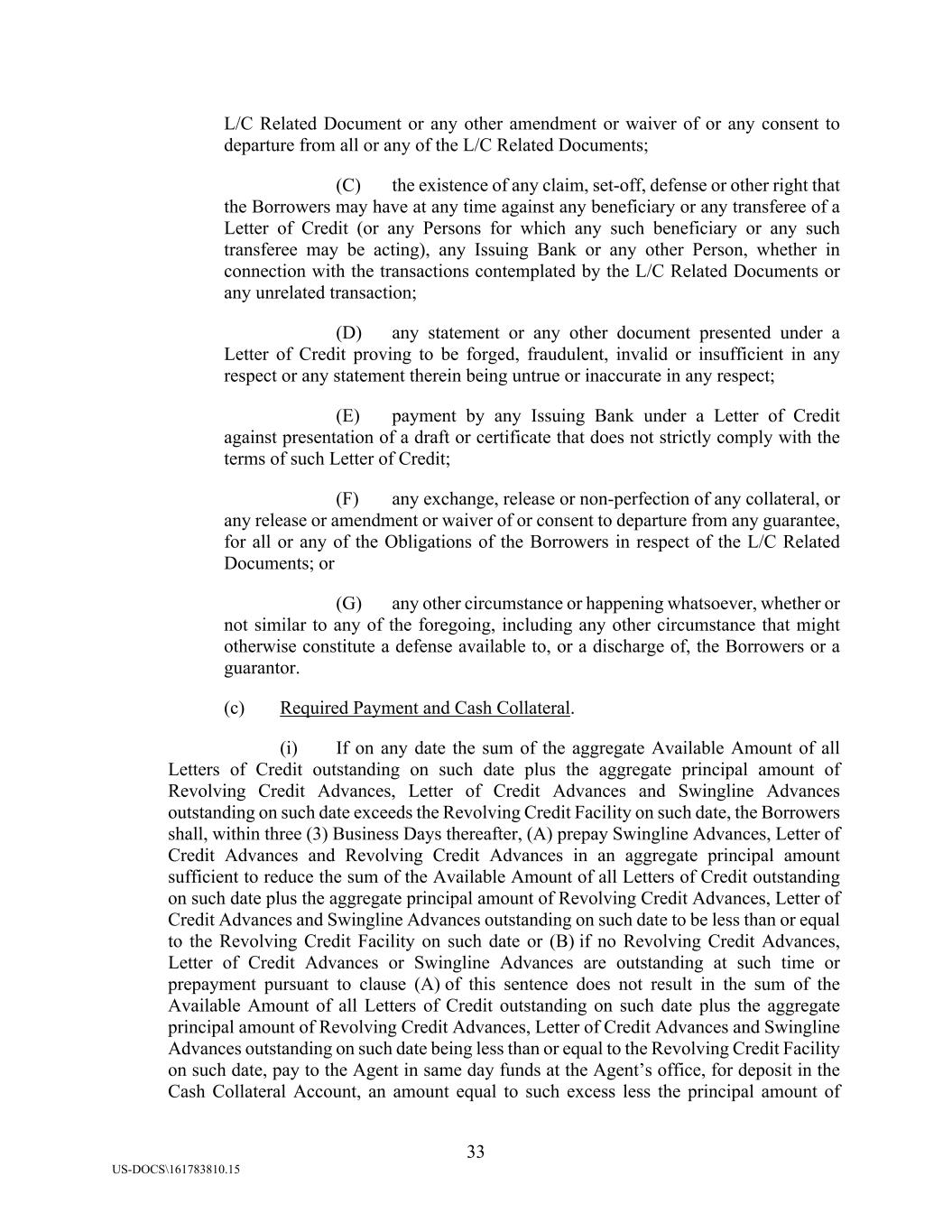 33 US-DOCS\161783810.15 L/C Related Document or any other amendment or waiver of or any consent to departure from all or any of the L/C Related Documents; (C) the existence of any claim, set-off, defense or other right that the Borrowers may have at any time against any beneficiary or any transferee of a Letter of Credit (or any Persons for which any such beneficiary or any such transferee may be acting), any Issuing Bank or any other Person, whether in connection with the transactions contemplated by the L/C Related Documents or any unrelated transaction; (D) any statement or any other document presented under a Letter of Credit proving to be forged, fraudulent, invalid or insufficient in any respect or any statement therein being untrue or inaccurate in any respect; (E) payment by any Issuing Bank under a Letter of Credit against presentation of a draft or certificate that does not strictly comply with the terms of such Letter of Credit; (F) any exchange, release or non-perfection of any collateral, or any release or amendment or waiver of or consent to departure from any guarantee, for all or any of the Obligations of the Borrowers in respect of the L/C Related Documents; or (G) any other circumstance or happening whatsoever, whether or not similar to any of the foregoing, including any other circumstance that might otherwise constitute a defense available to, or a discharge of, the Borrowers or a guarantor. (c) Required Payment and Cash Collateral. (i) If on any date the sum of the aggregate Available Amount of all Letters of Credit outstanding on such date plus the aggregate principal amount of Revolving Credit Advances, Letter of Credit Advances and Swingline Advances outstanding on such date exceeds the Revolving Credit Facility on such date, the Borrowers shall, within three (3) Business Days thereafter, (A) prepay Swingline Advances, Letter of Credit Advances and Revolving Credit Advances in an aggregate principal amount sufficient to reduce the sum of the Available Amount of all Letters of Credit outstanding on such date plus the aggregate principal amount of Revolving Credit Advances, Letter of Credit Advances and Swingline Advances outstanding on such date to be less than or equal to the Revolving Credit Facility on such date or (B) if no Revolving Credit Advances, Letter of Credit Advances or Swingline Advances are outstanding at such time or prepayment pursuant to clause (A) of this sentence does not result in the sum of the Available Amount of all Letters of Credit outstanding on such date plus the aggregate principal amount of Revolving Credit Advances, Letter of Credit Advances and Swingline Advances outstanding on such date being less than or equal to the Revolving Credit Facility on such date, pay to the Agent in same day funds at the Agent’s office, for deposit in the Cash Collateral Account, an amount equal to such excess less the principal amount of