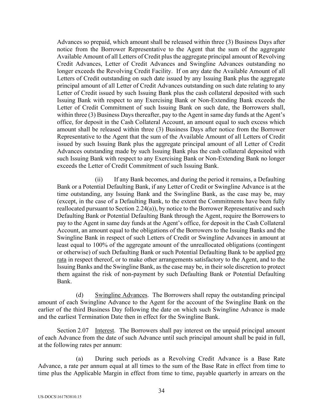 34 US-DOCS\161783810.15 Advances so prepaid, which amount shall be released within three (3) Business Days after notice from the Borrower Representative to the Agent that the sum of the aggregate Available Amount of all Letters of Credit plus the aggregate principal amount of Revolving Credit Advances, Letter of Credit Advances and Swingline Advances outstanding no longer exceeds the Revolving Credit Facility. If on any date the Available Amount of all Letters of Credit outstanding on such date issued by any Issuing Bank plus the aggregate principal amount of all Letter of Credit Advances outstanding on such date relating to any Letter of Credit issued by such Issuing Bank plus the cash collateral deposited with such Issuing Bank with respect to any Exercising Bank or Non-Extending Bank exceeds the Letter of Credit Commitment of such Issuing Bank on such date, the Borrowers shall, within three (3) Business Days thereafter, pay to the Agent in same day funds at the Agent’s office, for deposit in the Cash Collateral Account, an amount equal to such excess which amount shall be released within three (3) Business Days after notice from the Borrower Representative to the Agent that the sum of the Available Amount of all Letters of Credit issued by such Issuing Bank plus the aggregate principal amount of all Letter of Credit Advances outstanding made by such Issuing Bank plus the cash collateral deposited with such Issuing Bank with respect to any Exercising Bank or Non-Extending Bank no longer exceeds the Letter of Credit Commitment of such Issuing Bank. (ii) If any Bank becomes, and during the period it remains, a Defaulting Bank or a Potential Defaulting Bank, if any Letter of Credit or Swingline Advance is at the time outstanding, any Issuing Bank and the Swingline Bank, as the case may be, may (except, in the case of a Defaulting Bank, to the extent the Commitments have been fully reallocated pursuant to Section 2.24(a)), by notice to the Borrower Representative and such Defaulting Bank or Potential Defaulting Bank through the Agent, require the Borrowers to pay to the Agent in same day funds at the Agent’s office, for deposit in the Cash Collateral Account, an amount equal to the obligations of the Borrowers to the Issuing Banks and the Swingline Bank in respect of such Letters of Credit or Swingline Advances in amount at least equal to 100% of the aggregate amount of the unreallocated obligations (contingent or otherwise) of such Defaulting Bank or such Potential Defaulting Bank to be applied pro rata in respect thereof, or to make other arrangements satisfactory to the Agent, and to the Issuing Banks and the Swingline Bank, as the case may be, in their sole discretion to protect them against the risk of non-payment by such Defaulting Bank or Potential Defaulting Bank. (d) Swingline Advances. The Borrowers shall repay the outstanding principal amount of each Swingline Advance to the Agent for the account of the Swingline Bank on the earlier of the third Business Day following the date on which such Swingline Advance is made and the earliest Termination Date then in effect for the Swingline Bank. Section 2.07 Interest. The Borrowers shall pay interest on the unpaid principal amount of each Advance from the date of such Advance until such principal amount shall be paid in full, at the following rates per annum: (a) During such periods as a Revolving Credit Advance is a Base Rate Advance, a rate per annum equal at all times to the sum of the Base Rate in effect from time to time plus the Applicable Margin in effect from time to time, payable quarterly in arrears on the