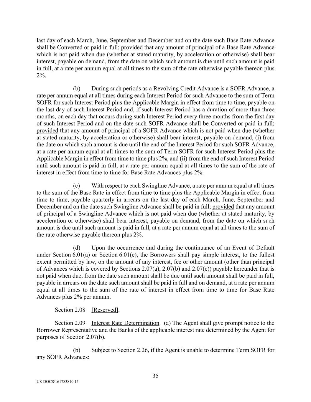 35 US-DOCS\161783810.15 last day of each March, June, September and December and on the date such Base Rate Advance shall be Converted or paid in full; provided that any amount of principal of a Base Rate Advance which is not paid when due (whether at stated maturity, by acceleration or otherwise) shall bear interest, payable on demand, from the date on which such amount is due until such amount is paid in full, at a rate per annum equal at all times to the sum of the rate otherwise payable thereon plus 2%. (b) During such periods as a Revolving Credit Advance is a SOFR Advance, a rate per annum equal at all times during each Interest Period for such Advance to the sum of Term SOFR for such Interest Period plus the Applicable Margin in effect from time to time, payable on the last day of such Interest Period and, if such Interest Period has a duration of more than three months, on each day that occurs during such Interest Period every three months from the first day of such Interest Period and on the date such SOFR Advance shall be Converted or paid in full; provided that any amount of principal of a SOFR Advance which is not paid when due (whether at stated maturity, by acceleration or otherwise) shall bear interest, payable on demand, (i) from the date on which such amount is due until the end of the Interest Period for such SOFR Advance, at a rate per annum equal at all times to the sum of Term SOFR for such Interest Period plus the Applicable Margin in effect from time to time plus 2%, and (ii) from the end of such Interest Period until such amount is paid in full, at a rate per annum equal at all times to the sum of the rate of interest in effect from time to time for Base Rate Advances plus 2%. (c) With respect to each Swingline Advance, a rate per annum equal at all times to the sum of the Base Rate in effect from time to time plus the Applicable Margin in effect from time to time, payable quarterly in arrears on the last day of each March, June, September and December and on the date such Swingline Advance shall be paid in full; provided that any amount of principal of a Swingline Advance which is not paid when due (whether at stated maturity, by acceleration or otherwise) shall bear interest, payable on demand, from the date on which such amount is due until such amount is paid in full, at a rate per annum equal at all times to the sum of the rate otherwise payable thereon plus 2%. (d) Upon the occurrence and during the continuance of an Event of Default under Section 6.01(a) or Section 6.01(e), the Borrowers shall pay simple interest, to the fullest extent permitted by law, on the amount of any interest, fee or other amount (other than principal of Advances which is covered by Sections 2.07(a), 2.07(b) and 2.07(c)) payable hereunder that is not paid when due, from the date such amount shall be due until such amount shall be paid in full, payable in arrears on the date such amount shall be paid in full and on demand, at a rate per annum equal at all times to the sum of the rate of interest in effect from time to time for Base Rate Advances plus 2% per annum. Section 2.08 [Reserved]. Section 2.09 Interest Rate Determination. (a) The Agent shall give prompt notice to the Borrower Representative and the Banks of the applicable interest rate determined by the Agent for purposes of Section 2.07(b). (b) Subject to Section 2.26, if the Agent is unable to determine Term SOFR for any SOFR Advances: