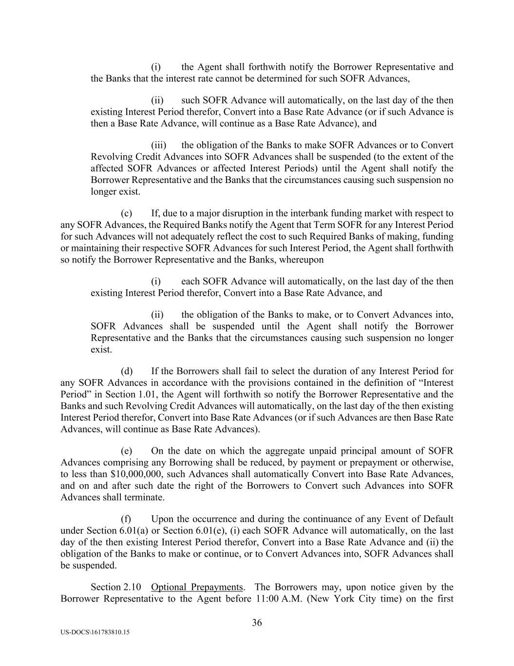 36 US-DOCS\161783810.15 (i) the Agent shall forthwith notify the Borrower Representative and the Banks that the interest rate cannot be determined for such SOFR Advances, (ii) such SOFR Advance will automatically, on the last day of the then existing Interest Period therefor, Convert into a Base Rate Advance (or if such Advance is then a Base Rate Advance, will continue as a Base Rate Advance), and (iii) the obligation of the Banks to make SOFR Advances or to Convert Revolving Credit Advances into SOFR Advances shall be suspended (to the extent of the affected SOFR Advances or affected Interest Periods) until the Agent shall notify the Borrower Representative and the Banks that the circumstances causing such suspension no longer exist. (c) If, due to a major disruption in the interbank funding market with respect to any SOFR Advances, the Required Banks notify the Agent that Term SOFR for any Interest Period for such Advances will not adequately reflect the cost to such Required Banks of making, funding or maintaining their respective SOFR Advances for such Interest Period, the Agent shall forthwith so notify the Borrower Representative and the Banks, whereupon (i) each SOFR Advance will automatically, on the last day of the then existing Interest Period therefor, Convert into a Base Rate Advance, and (ii) the obligation of the Banks to make, or to Convert Advances into, SOFR Advances shall be suspended until the Agent shall notify the Borrower Representative and the Banks that the circumstances causing such suspension no longer exist. (d) If the Borrowers shall fail to select the duration of any Interest Period for any SOFR Advances in accordance with the provisions contained in the definition of “Interest Period” in Section 1.01, the Agent will forthwith so notify the Borrower Representative and the Banks and such Revolving Credit Advances will automatically, on the last day of the then existing Interest Period therefor, Convert into Base Rate Advances (or if such Advances are then Base Rate Advances, will continue as Base Rate Advances). (e) On the date on which the aggregate unpaid principal amount of SOFR Advances comprising any Borrowing shall be reduced, by payment or prepayment or otherwise, to less than $10,000,000, such Advances shall automatically Convert into Base Rate Advances, and on and after such date the right of the Borrowers to Convert such Advances into SOFR Advances shall terminate. (f) Upon the occurrence and during the continuance of any Event of Default under Section 6.01(a) or Section 6.01(e), (i) each SOFR Advance will automatically, on the last day of the then existing Interest Period therefor, Convert into a Base Rate Advance and (ii) the obligation of the Banks to make or continue, or to Convert Advances into, SOFR Advances shall be suspended. Section 2.10 Optional Prepayments. The Borrowers may, upon notice given by the Borrower Representative to the Agent before 11:00 A.M. (New York City time) on the first