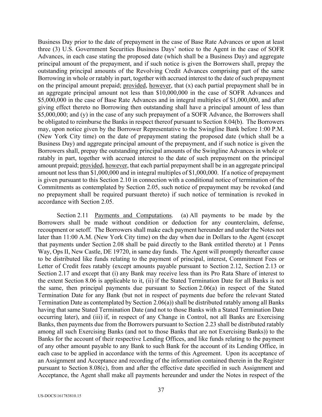 37 US-DOCS\161783810.15 Business Day prior to the date of prepayment in the case of Base Rate Advances or upon at least three (3) U.S. Government Securities Business Days’ notice to the Agent in the case of SOFR Advances, in each case stating the proposed date (which shall be a Business Day) and aggregate principal amount of the prepayment, and if such notice is given the Borrowers shall, prepay the outstanding principal amounts of the Revolving Credit Advances comprising part of the same Borrowing in whole or ratably in part, together with accrued interest to the date of such prepayment on the principal amount prepaid; provided, however, that (x) each partial prepayment shall be in an aggregate principal amount not less than $10,000,000 in the case of SOFR Advances and $5,000,000 in the case of Base Rate Advances and in integral multiples of $1,000,000, and after giving effect thereto no Borrowing then outstanding shall have a principal amount of less than $5,000,000; and (y) in the case of any such prepayment of a SOFR Advance, the Borrowers shall be obligated to reimburse the Banks in respect thereof pursuant to Section 8.04(b). The Borrowers may, upon notice given by the Borrower Representative to the Swingline Bank before 1:00 P.M. (New York City time) on the date of prepayment stating the proposed date (which shall be a Business Day) and aggregate principal amount of the prepayment, and if such notice is given the Borrowers shall, prepay the outstanding principal amounts of the Swingline Advances in whole or ratably in part, together with accrued interest to the date of such prepayment on the principal amount prepaid; provided, however, that each partial prepayment shall be in an aggregate principal amount not less than $1,000,000 and in integral multiples of $1,000,000. If a notice of prepayment is given pursuant to this Section 2.10 in connection with a conditional notice of termination of the Commitments as contemplated by Section 2.05, such notice of prepayment may be revoked (and no prepayment shall be required pursuant thereto) if such notice of termination is revoked in accordance with Section 2.05. Section 2.11 Payments and Computations. (a) All payments to be made by the Borrowers shall be made without condition or deduction for any counterclaim, defense, recoupment or setoff. The Borrowers shall make each payment hereunder and under the Notes not later than 11:00 A.M. (New York City time) on the day when due in Dollars to the Agent (except that payments under Section 2.08 shall be paid directly to the Bank entitled thereto) at 1 Penns Way, Ops II, New Castle, DE 19720, in same day funds. The Agent will promptly thereafter cause to be distributed like funds relating to the payment of principal, interest, Commitment Fees or Letter of Credit fees ratably (except amounts payable pursuant to Section 2.12, Section 2.13 or Section 2.17 and except that (i) any Bank may receive less than its Pro Rata Share of interest to the extent Section 8.06 is applicable to it, (ii) if the Stated Termination Date for all Banks is not the same, then principal payments due pursuant to Section 2.06(a) in respect of the Stated Termination Date for any Bank (but not in respect of payments due before the relevant Stated Termination Date as contemplated by Section 2.06(a)) shall be distributed ratably among all Banks having that same Stated Termination Date (and not to those Banks with a Stated Termination Date occurring later), and (iii) if, in respect of any Change in Control, not all Banks are Exercising Banks, then payments due from the Borrowers pursuant to Section 2.23 shall be distributed ratably among all such Exercising Banks (and not to those Banks that are not Exercising Banks)) to the Banks for the account of their respective Lending Offices, and like funds relating to the payment of any other amount payable to any Bank to such Bank for the account of its Lending Office, in each case to be applied in accordance with the terms of this Agreement. Upon its acceptance of an Assignment and Acceptance and recording of the information contained therein in the Register pursuant to Section 8.08(c), from and after the effective date specified in such Assignment and Acceptance, the Agent shall make all payments hereunder and under the Notes in respect of the