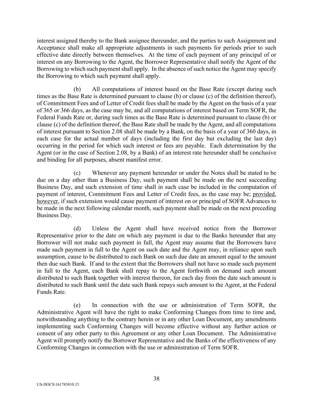38 US-DOCS\161783810.15 interest assigned thereby to the Bank assignee thereunder, and the parties to such Assignment and Acceptance shall make all appropriate adjustments in such payments for periods prior to such effective date directly between themselves. At the time of each payment of any principal of or interest on any Borrowing to the Agent, the Borrower Representative shall notify the Agent of the Borrowing to which such payment shall apply. In the absence of such notice the Agent may specify the Borrowing to which such payment shall apply. (b) All computations of interest based on the Base Rate (except during such times as the Base Rate is determined pursuant to clause (b) or clause (c) of the definition thereof), of Commitment Fees and of Letter of Credit fees shall be made by the Agent on the basis of a year of 365 or 366 days, as the case may be, and all computations of interest based on Term SOFR, the Federal Funds Rate or, during such times as the Base Rate is determined pursuant to clause (b) or clause (c) of the definition thereof, the Base Rate shall be made by the Agent, and all computations of interest pursuant to Section 2.08 shall be made by a Bank, on the basis of a year of 360 days, in each case for the actual number of days (including the first day but excluding the last day) occurring in the period for which such interest or fees are payable. Each determination by the Agent (or in the case of Section 2.08, by a Bank) of an interest rate hereunder shall be conclusive and binding for all purposes, absent manifest error. (c) Whenever any payment hereunder or under the Notes shall be stated to be due on a day other than a Business Day, such payment shall be made on the next succeeding Business Day, and such extension of time shall in such case be included in the computation of payment of interest, Commitment Fees and Letter of Credit fees, as the case may be; provided, however, if such extension would cause payment of interest on or principal of SOFR Advances to be made in the next following calendar month, such payment shall be made on the next preceding Business Day. (d) Unless the Agent shall have received notice from the Borrower Representative prior to the date on which any payment is due to the Banks hereunder that any Borrower will not make such payment in full, the Agent may assume that the Borrowers have made such payment in full to the Agent on such date and the Agent may, in reliance upon such assumption, cause to be distributed to each Bank on such due date an amount equal to the amount then due such Bank. If and to the extent that the Borrowers shall not have so made such payment in full to the Agent, each Bank shall repay to the Agent forthwith on demand such amount distributed to such Bank together with interest thereon, for each day from the date such amount is distributed to such Bank until the date such Bank repays such amount to the Agent, at the Federal Funds Rate. (e) In connection with the use or administration of Term SOFR, the Administrative Agent will have the right to make Conforming Changes from time to time and, notwithstanding anything to the contrary herein or in any other Loan Document, any amendments implementing such Conforming Changes will become effective without any further action or consent of any other party to this Agreement or any other Loan Document. The Administrative Agent will promptly notify the Borrower Representative and the Banks of the effectiveness of any Conforming Changes in connection with the use or administration of Term SOFR.