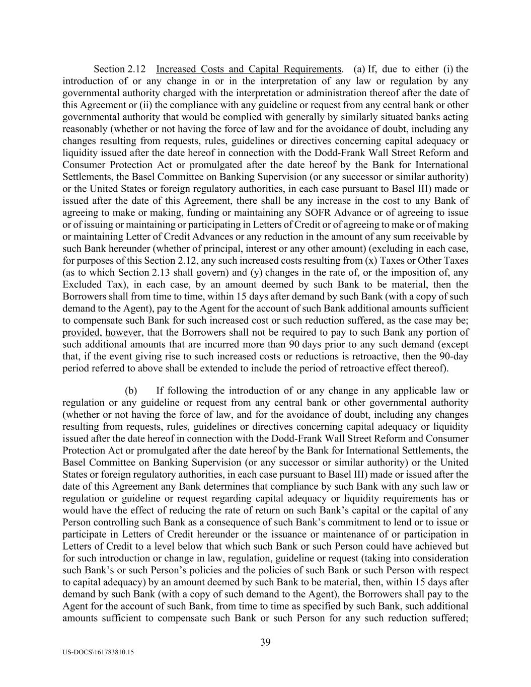 39 US-DOCS\161783810.15 Section 2.12 Increased Costs and Capital Requirements. (a) If, due to either (i) the introduction of or any change in or in the interpretation of any law or regulation by any governmental authority charged with the interpretation or administration thereof after the date of this Agreement or (ii) the compliance with any guideline or request from any central bank or other governmental authority that would be complied with generally by similarly situated banks acting reasonably (whether or not having the force of law and for the avoidance of doubt, including any changes resulting from requests, rules, guidelines or directives concerning capital adequacy or liquidity issued after the date hereof in connection with the Dodd-Frank Wall Street Reform and Consumer Protection Act or promulgated after the date hereof by the Bank for International Settlements, the Basel Committee on Banking Supervision (or any successor or similar authority) or the United States or foreign regulatory authorities, in each case pursuant to Basel III) made or issued after the date of this Agreement, there shall be any increase in the cost to any Bank of agreeing to make or making, funding or maintaining any SOFR Advance or of agreeing to issue or of issuing or maintaining or participating in Letters of Credit or of agreeing to make or of making or maintaining Letter of Credit Advances or any reduction in the amount of any sum receivable by such Bank hereunder (whether of principal, interest or any other amount) (excluding in each case, for purposes of this Section 2.12, any such increased costs resulting from (x) Taxes or Other Taxes (as to which Section 2.13 shall govern) and (y) changes in the rate of, or the imposition of, any Excluded Tax), in each case, by an amount deemed by such Bank to be material, then the Borrowers shall from time to time, within 15 days after demand by such Bank (with a copy of such demand to the Agent), pay to the Agent for the account of such Bank additional amounts sufficient to compensate such Bank for such increased cost or such reduction suffered, as the case may be; provided, however, that the Borrowers shall not be required to pay to such Bank any portion of such additional amounts that are incurred more than 90 days prior to any such demand (except that, if the event giving rise to such increased costs or reductions is retroactive, then the 90-day period referred to above shall be extended to include the period of retroactive effect thereof). (b) If following the introduction of or any change in any applicable law or regulation or any guideline or request from any central bank or other governmental authority (whether or not having the force of law, and for the avoidance of doubt, including any changes resulting from requests, rules, guidelines or directives concerning capital adequacy or liquidity issued after the date hereof in connection with the Dodd-Frank Wall Street Reform and Consumer Protection Act or promulgated after the date hereof by the Bank for International Settlements, the Basel Committee on Banking Supervision (or any successor or similar authority) or the United States or foreign regulatory authorities, in each case pursuant to Basel III) made or issued after the date of this Agreement any Bank determines that compliance by such Bank with any such law or regulation or guideline or request regarding capital adequacy or liquidity requirements has or would have the effect of reducing the rate of return on such Bank’s capital or the capital of any Person controlling such Bank as a consequence of such Bank’s commitment to lend or to issue or participate in Letters of Credit hereunder or the issuance or maintenance of or participation in Letters of Credit to a level below that which such Bank or such Person could have achieved but for such introduction or change in law, regulation, guideline or request (taking into consideration such Bank’s or such Person’s policies and the policies of such Bank or such Person with respect to capital adequacy) by an amount deemed by such Bank to be material, then, within 15 days after demand by such Bank (with a copy of such demand to the Agent), the Borrowers shall pay to the Agent for the account of such Bank, from time to time as specified by such Bank, such additional amounts sufficient to compensate such Bank or such Person for any such reduction suffered;