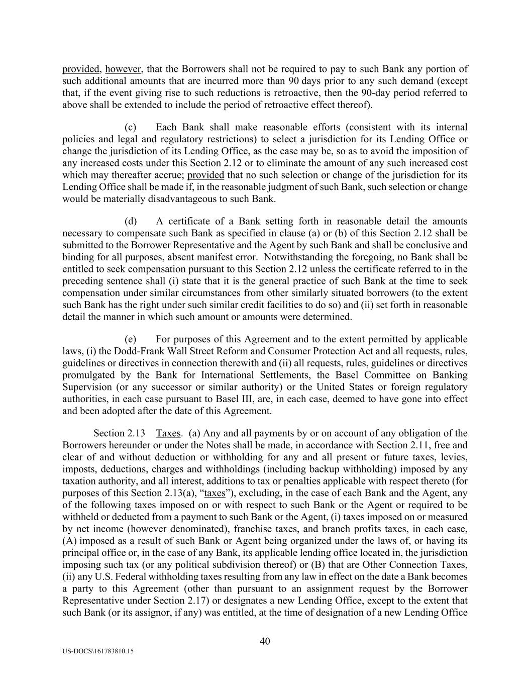 40 US-DOCS\161783810.15 provided, however, that the Borrowers shall not be required to pay to such Bank any portion of such additional amounts that are incurred more than 90 days prior to any such demand (except that, if the event giving rise to such reductions is retroactive, then the 90-day period referred to above shall be extended to include the period of retroactive effect thereof). (c) Each Bank shall make reasonable efforts (consistent with its internal policies and legal and regulatory restrictions) to select a jurisdiction for its Lending Office or change the jurisdiction of its Lending Office, as the case may be, so as to avoid the imposition of any increased costs under this Section 2.12 or to eliminate the amount of any such increased cost which may thereafter accrue; provided that no such selection or change of the jurisdiction for its Lending Office shall be made if, in the reasonable judgment of such Bank, such selection or change would be materially disadvantageous to such Bank. (d) A certificate of a Bank setting forth in reasonable detail the amounts necessary to compensate such Bank as specified in clause (a) or (b) of this Section 2.12 shall be submitted to the Borrower Representative and the Agent by such Bank and shall be conclusive and binding for all purposes, absent manifest error. Notwithstanding the foregoing, no Bank shall be entitled to seek compensation pursuant to this Section 2.12 unless the certificate referred to in the preceding sentence shall (i) state that it is the general practice of such Bank at the time to seek compensation under similar circumstances from other similarly situated borrowers (to the extent such Bank has the right under such similar credit facilities to do so) and (ii) set forth in reasonable detail the manner in which such amount or amounts were determined. (e) For purposes of this Agreement and to the extent permitted by applicable laws, (i) the Dodd-Frank Wall Street Reform and Consumer Protection Act and all requests, rules, guidelines or directives in connection therewith and (ii) all requests, rules, guidelines or directives promulgated by the Bank for International Settlements, the Basel Committee on Banking Supervision (or any successor or similar authority) or the United States or foreign regulatory authorities, in each case pursuant to Basel III, are, in each case, deemed to have gone into effect and been adopted after the date of this Agreement. Section 2.13 Taxes. (a) Any and all payments by or on account of any obligation of the Borrowers hereunder or under the Notes shall be made, in accordance with Section 2.11, free and clear of and without deduction or withholding for any and all present or future taxes, levies, imposts, deductions, charges and withholdings (including backup withholding) imposed by any taxation authority, and all interest, additions to tax or penalties applicable with respect thereto (for purposes of this Section 2.13(a), “taxes”), excluding, in the case of each Bank and the Agent, any of the following taxes imposed on or with respect to such Bank or the Agent or required to be withheld or deducted from a payment to such Bank or the Agent, (i) taxes imposed on or measured by net income (however denominated), franchise taxes, and branch profits taxes, in each case, (A) imposed as a result of such Bank or Agent being organized under the laws of, or having its principal office or, in the case of any Bank, its applicable lending office located in, the jurisdiction imposing such tax (or any political subdivision thereof) or (B) that are Other Connection Taxes, (ii) any U.S. Federal withholding taxes resulting from any law in effect on the date a Bank becomes a party to this Agreement (other than pursuant to an assignment request by the Borrower Representative under Section 2.17) or designates a new Lending Office, except to the extent that such Bank (or its assignor, if any) was entitled, at the time of designation of a new Lending Office