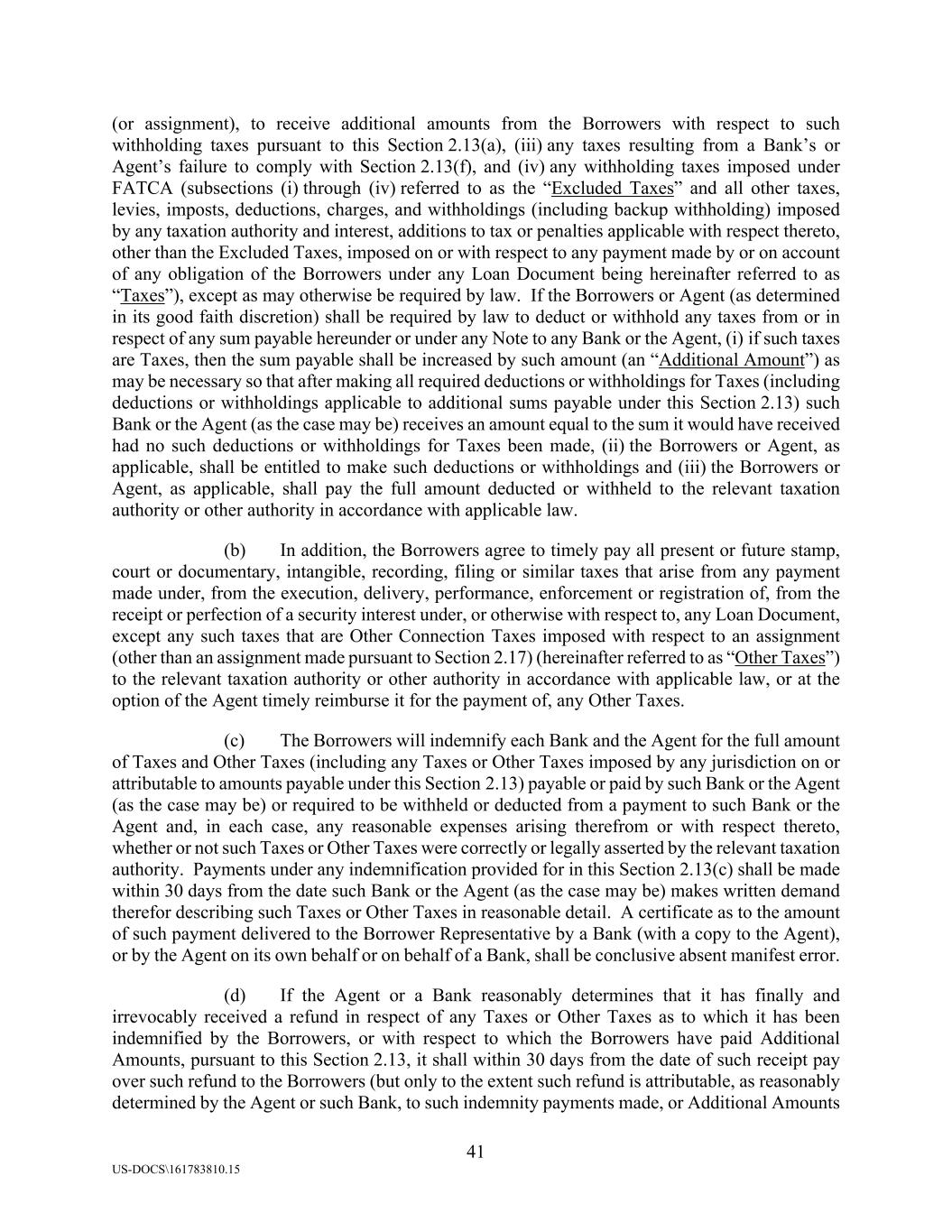 41 US-DOCS\161783810.15 (or assignment), to receive additional amounts from the Borrowers with respect to such withholding taxes pursuant to this Section 2.13(a), (iii) any taxes resulting from a Bank’s or Agent’s failure to comply with Section 2.13(f), and (iv) any withholding taxes imposed under FATCA (subsections (i) through (iv) referred to as the “Excluded Taxes” and all other taxes, levies, imposts, deductions, charges, and withholdings (including backup withholding) imposed by any taxation authority and interest, additions to tax or penalties applicable with respect thereto, other than the Excluded Taxes, imposed on or with respect to any payment made by or on account of any obligation of the Borrowers under any Loan Document being hereinafter referred to as “Taxes”), except as may otherwise be required by law. If the Borrowers or Agent (as determined in its good faith discretion) shall be required by law to deduct or withhold any taxes from or in respect of any sum payable hereunder or under any Note to any Bank or the Agent, (i) if such taxes are Taxes, then the sum payable shall be increased by such amount (an “Additional Amount”) as may be necessary so that after making all required deductions or withholdings for Taxes (including deductions or withholdings applicable to additional sums payable under this Section 2.13) such Bank or the Agent (as the case may be) receives an amount equal to the sum it would have received had no such deductions or withholdings for Taxes been made, (ii) the Borrowers or Agent, as applicable, shall be entitled to make such deductions or withholdings and (iii) the Borrowers or Agent, as applicable, shall pay the full amount deducted or withheld to the relevant taxation authority or other authority in accordance with applicable law. (b) In addition, the Borrowers agree to timely pay all present or future stamp, court or documentary, intangible, recording, filing or similar taxes that arise from any payment made under, from the execution, delivery, performance, enforcement or registration of, from the receipt or perfection of a security interest under, or otherwise with respect to, any Loan Document, except any such taxes that are Other Connection Taxes imposed with respect to an assignment (other than an assignment made pursuant to Section 2.17) (hereinafter referred to as “Other Taxes”) to the relevant taxation authority or other authority in accordance with applicable law, or at the option of the Agent timely reimburse it for the payment of, any Other Taxes. (c) The Borrowers will indemnify each Bank and the Agent for the full amount of Taxes and Other Taxes (including any Taxes or Other Taxes imposed by any jurisdiction on or attributable to amounts payable under this Section 2.13) payable or paid by such Bank or the Agent (as the case may be) or required to be withheld or deducted from a payment to such Bank or the Agent and, in each case, any reasonable expenses arising therefrom or with respect thereto, whether or not such Taxes or Other Taxes were correctly or legally asserted by the relevant taxation authority. Payments under any indemnification provided for in this Section 2.13(c) shall be made within 30 days from the date such Bank or the Agent (as the case may be) makes written demand therefor describing such Taxes or Other Taxes in reasonable detail. A certificate as to the amount of such payment delivered to the Borrower Representative by a Bank (with a copy to the Agent), or by the Agent on its own behalf or on behalf of a Bank, shall be conclusive absent manifest error. (d) If the Agent or a Bank reasonably determines that it has finally and irrevocably received a refund in respect of any Taxes or Other Taxes as to which it has been indemnified by the Borrowers, or with respect to which the Borrowers have paid Additional Amounts, pursuant to this Section 2.13, it shall within 30 days from the date of such receipt pay over such refund to the Borrowers (but only to the extent such refund is attributable, as reasonably determined by the Agent or such Bank, to such indemnity payments made, or Additional Amounts