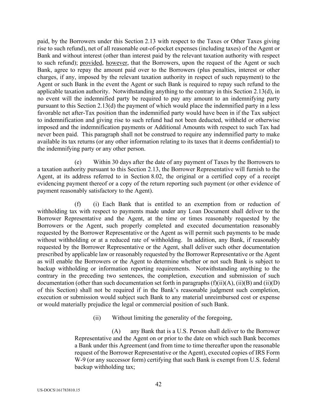 42 US-DOCS\161783810.15 paid, by the Borrowers under this Section 2.13 with respect to the Taxes or Other Taxes giving rise to such refund), net of all reasonable out-of-pocket expenses (including taxes) of the Agent or Bank and without interest (other than interest paid by the relevant taxation authority with respect to such refund); provided, however, that the Borrowers, upon the request of the Agent or such Bank, agree to repay the amount paid over to the Borrowers (plus penalties, interest or other charges, if any, imposed by the relevant taxation authority in respect of such repayment) to the Agent or such Bank in the event the Agent or such Bank is required to repay such refund to the applicable taxation authority. Notwithstanding anything to the contrary in this Section 2.13(d), in no event will the indemnified party be required to pay any amount to an indemnifying party pursuant to this Section 2.13(d) the payment of which would place the indemnified party in a less favorable net after-Tax position than the indemnified party would have been in if the Tax subject to indemnification and giving rise to such refund had not been deducted, withheld or otherwise imposed and the indemnification payments or Additional Amounts with respect to such Tax had never been paid. This paragraph shall not be construed to require any indemnified party to make available its tax returns (or any other information relating to its taxes that it deems confidential) to the indemnifying party or any other person. (e) Within 30 days after the date of any payment of Taxes by the Borrowers to a taxation authority pursuant to this Section 2.13, the Borrower Representative will furnish to the Agent, at its address referred to in Section 8.02, the original or a certified copy of a receipt evidencing payment thereof or a copy of the return reporting such payment (or other evidence of payment reasonably satisfactory to the Agent). (f) (i) Each Bank that is entitled to an exemption from or reduction of withholding tax with respect to payments made under any Loan Document shall deliver to the Borrower Representative and the Agent, at the time or times reasonably requested by the Borrowers or the Agent, such properly completed and executed documentation reasonably requested by the Borrower Representative or the Agent as will permit such payments to be made without withholding or at a reduced rate of withholding. In addition, any Bank, if reasonably requested by the Borrower Representative or the Agent, shall deliver such other documentation prescribed by applicable law or reasonably requested by the Borrower Representative or the Agent as will enable the Borrowers or the Agent to determine whether or not such Bank is subject to backup withholding or information reporting requirements. Notwithstanding anything to the contrary in the preceding two sentences, the completion, execution and submission of such documentation (other than such documentation set forth in paragraphs (f)(ii)(A), (ii)(B) and (ii)(D) of this Section) shall not be required if in the Bank’s reasonable judgment such completion, execution or submission would subject such Bank to any material unreimbursed cost or expense or would materially prejudice the legal or commercial position of such Bank. (ii) Without limiting the generality of the foregoing, (A) any Bank that is a U.S. Person shall deliver to the Borrower Representative and the Agent on or prior to the date on which such Bank becomes a Bank under this Agreement (and from time to time thereafter upon the reasonable request of the Borrower Representative or the Agent), executed copies of IRS Form W-9 (or any successor form) certifying that such Bank is exempt from U.S. federal backup withholding tax;