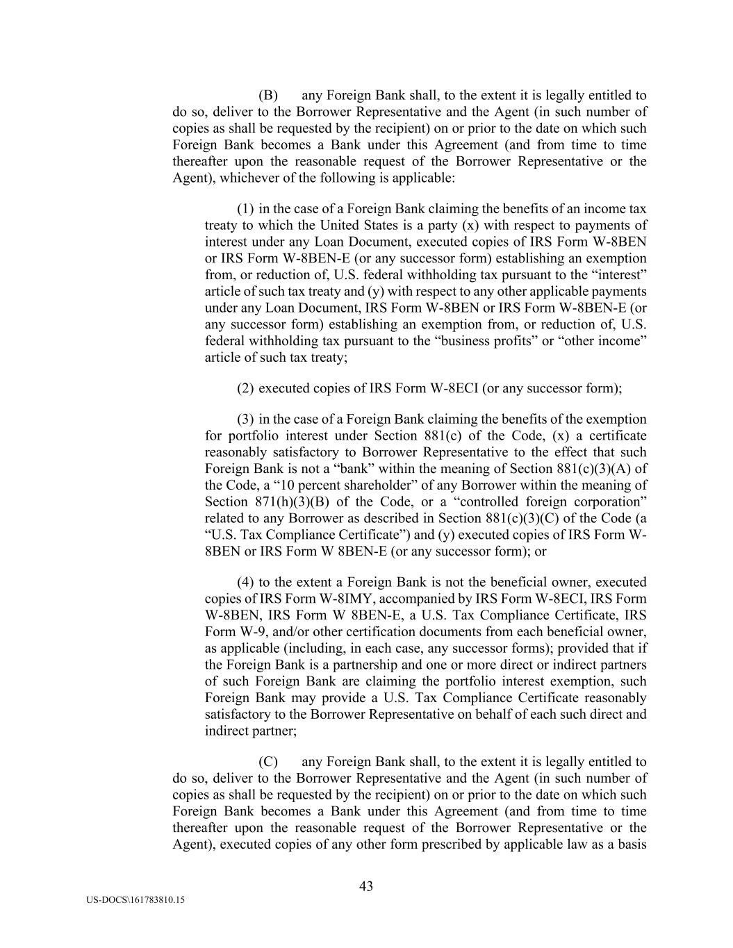 43 US-DOCS\161783810.15 (B) any Foreign Bank shall, to the extent it is legally entitled to do so, deliver to the Borrower Representative and the Agent (in such number of copies as shall be requested by the recipient) on or prior to the date on which such Foreign Bank becomes a Bank under this Agreement (and from time to time thereafter upon the reasonable request of the Borrower Representative or the Agent), whichever of the following is applicable: (1) in the case of a Foreign Bank claiming the benefits of an income tax treaty to which the United States is a party (x) with respect to payments of interest under any Loan Document, executed copies of IRS Form W-8BEN or IRS Form W-8BEN-E (or any successor form) establishing an exemption from, or reduction of, U.S. federal withholding tax pursuant to the “interest” article of such tax treaty and (y) with respect to any other applicable payments under any Loan Document, IRS Form W-8BEN or IRS Form W-8BEN-E (or any successor form) establishing an exemption from, or reduction of, U.S. federal withholding tax pursuant to the “business profits” or “other income” article of such tax treaty; (2) executed copies of IRS Form W-8ECI (or any successor form); (3) in the case of a Foreign Bank claiming the benefits of the exemption for portfolio interest under Section 881(c) of the Code, (x) a certificate reasonably satisfactory to Borrower Representative to the effect that such Foreign Bank is not a “bank” within the meaning of Section 881(c)(3)(A) of the Code, a “10 percent shareholder” of any Borrower within the meaning of Section 871(h)(3)(B) of the Code, or a “controlled foreign corporation” related to any Borrower as described in Section 881(c)(3)(C) of the Code (a “U.S. Tax Compliance Certificate”) and (y) executed copies of IRS Form W- 8BEN or IRS Form W 8BEN-E (or any successor form); or (4) to the extent a Foreign Bank is not the beneficial owner, executed copies of IRS Form W-8IMY, accompanied by IRS Form W-8ECI, IRS Form W-8BEN, IRS Form W 8BEN-E, a U.S. Tax Compliance Certificate, IRS Form W-9, and/or other certification documents from each beneficial owner, as applicable (including, in each case, any successor forms); provided that if the Foreign Bank is a partnership and one or more direct or indirect partners of such Foreign Bank are claiming the portfolio interest exemption, such Foreign Bank may provide a U.S. Tax Compliance Certificate reasonably satisfactory to the Borrower Representative on behalf of each such direct and indirect partner; (C) any Foreign Bank shall, to the extent it is legally entitled to do so, deliver to the Borrower Representative and the Agent (in such number of copies as shall be requested by the recipient) on or prior to the date on which such Foreign Bank becomes a Bank under this Agreement (and from time to time thereafter upon the reasonable request of the Borrower Representative or the Agent), executed copies of any other form prescribed by applicable law as a basis