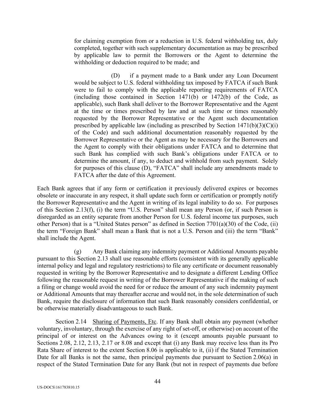 44 US-DOCS\161783810.15 for claiming exemption from or a reduction in U.S. federal withholding tax, duly completed, together with such supplementary documentation as may be prescribed by applicable law to permit the Borrowers or the Agent to determine the withholding or deduction required to be made; and (D) if a payment made to a Bank under any Loan Document would be subject to U.S. federal withholding tax imposed by FATCA if such Bank were to fail to comply with the applicable reporting requirements of FATCA (including those contained in Section 1471(b) or 1472(b) of the Code, as applicable), such Bank shall deliver to the Borrower Representative and the Agent at the time or times prescribed by law and at such time or times reasonably requested by the Borrower Representative or the Agent such documentation prescribed by applicable law (including as prescribed by Section 1471(b)(3)(C)(i) of the Code) and such additional documentation reasonably requested by the Borrower Representative or the Agent as may be necessary for the Borrowers and the Agent to comply with their obligations under FATCA and to determine that such Bank has complied with such Bank’s obligations under FATCA or to determine the amount, if any, to deduct and withhold from such payment. Solely for purposes of this clause (D), “FATCA” shall include any amendments made to FATCA after the date of this Agreement. Each Bank agrees that if any form or certification it previously delivered expires or becomes obsolete or inaccurate in any respect, it shall update such form or certification or promptly notify the Borrower Representative and the Agent in writing of its legal inability to do so. For purposes of this Section 2.13(f), (i) the term “U.S. Person” shall mean any Person (or, if such Person is disregarded as an entity separate from another Person for U.S. federal income tax purposes, such other Person) that is a “United States person” as defined in Section 7701(a)(30) of the Code, (ii) the term “Foreign Bank” shall mean a Bank that is not a U.S. Person and (iii) the term “Bank” shall include the Agent. (g) Any Bank claiming any indemnity payment or Additional Amounts payable pursuant to this Section 2.13 shall use reasonable efforts (consistent with its generally applicable internal policy and legal and regulatory restrictions) to file any certificate or document reasonably requested in writing by the Borrower Representative and to designate a different Lending Office following the reasonable request in writing of the Borrower Representative if the making of such a filing or change would avoid the need for or reduce the amount of any such indemnity payment or Additional Amounts that may thereafter accrue and would not, in the sole determination of such Bank, require the disclosure of information that such Bank reasonably considers confidential, or be otherwise materially disadvantageous to such Bank. Section 2.14 Sharing of Payments, Etc. If any Bank shall obtain any payment (whether voluntary, involuntary, through the exercise of any right of set-off, or otherwise) on account of the principal of or interest on the Advances owing to it (except amounts payable pursuant to Sections 2.08, 2.12, 2.13, 2.17 or 8.08 and except that (i) any Bank may receive less than its Pro Rata Share of interest to the extent Section 8.06 is applicable to it, (ii) if the Stated Termination Date for all Banks is not the same, then principal payments due pursuant to Section 2.06(a) in respect of the Stated Termination Date for any Bank (but not in respect of payments due before